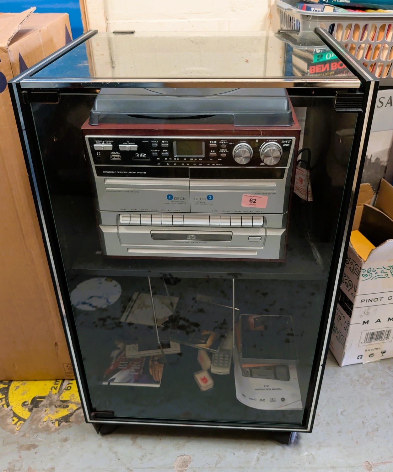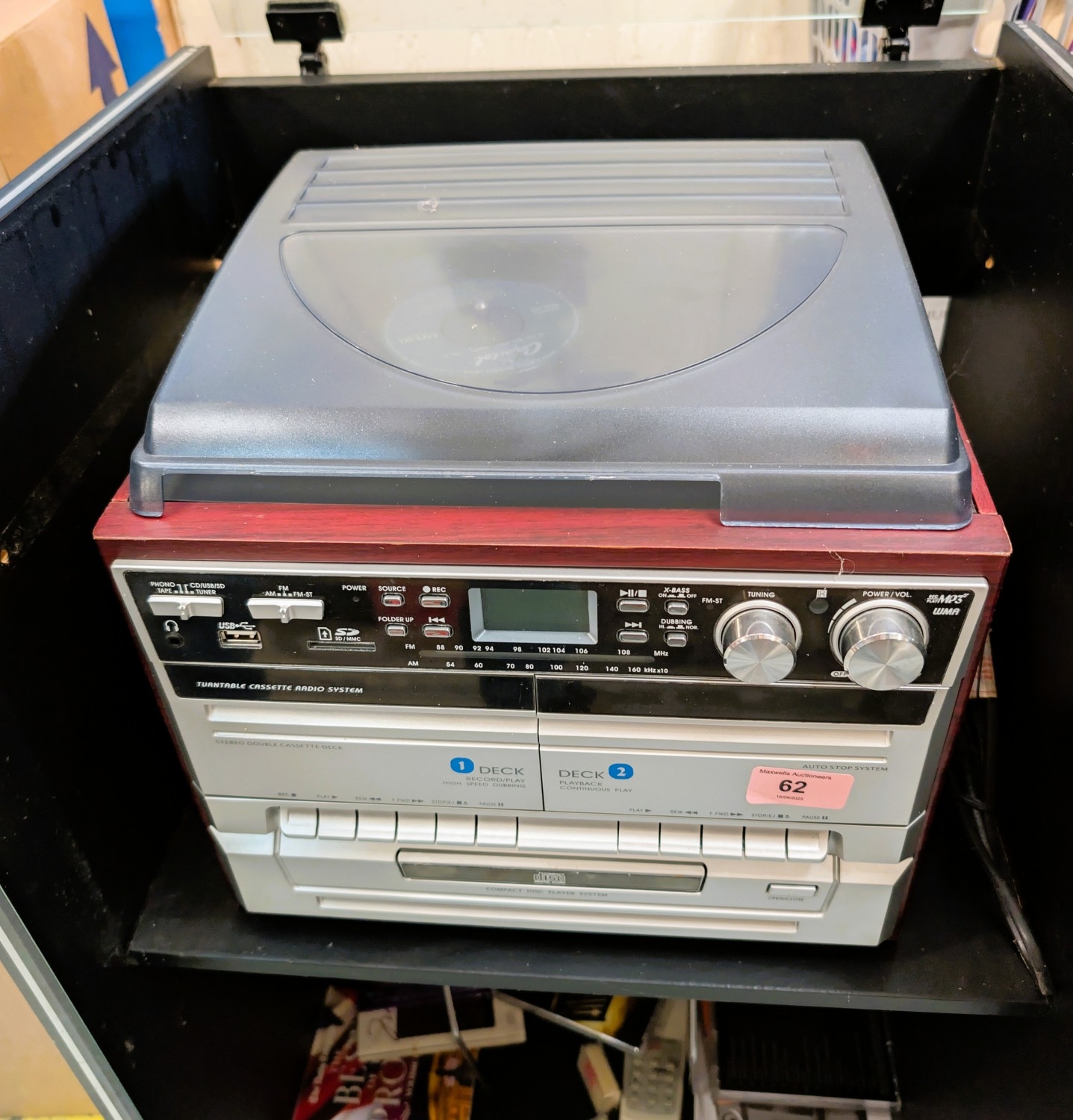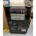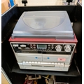 A turntable cassette radio system with speakers.
