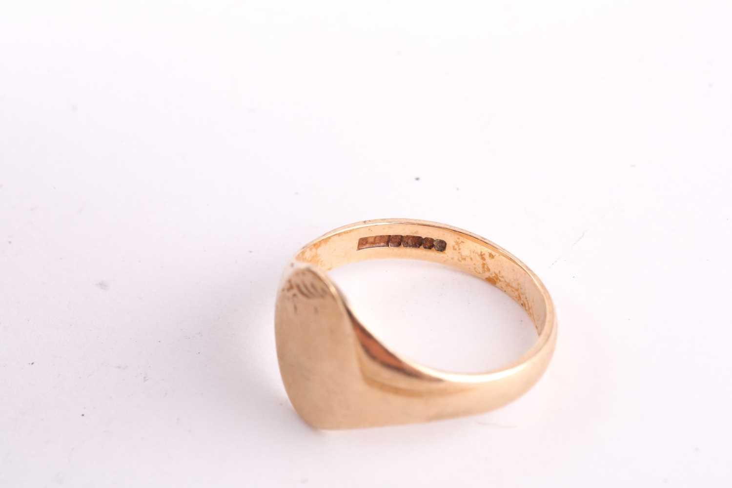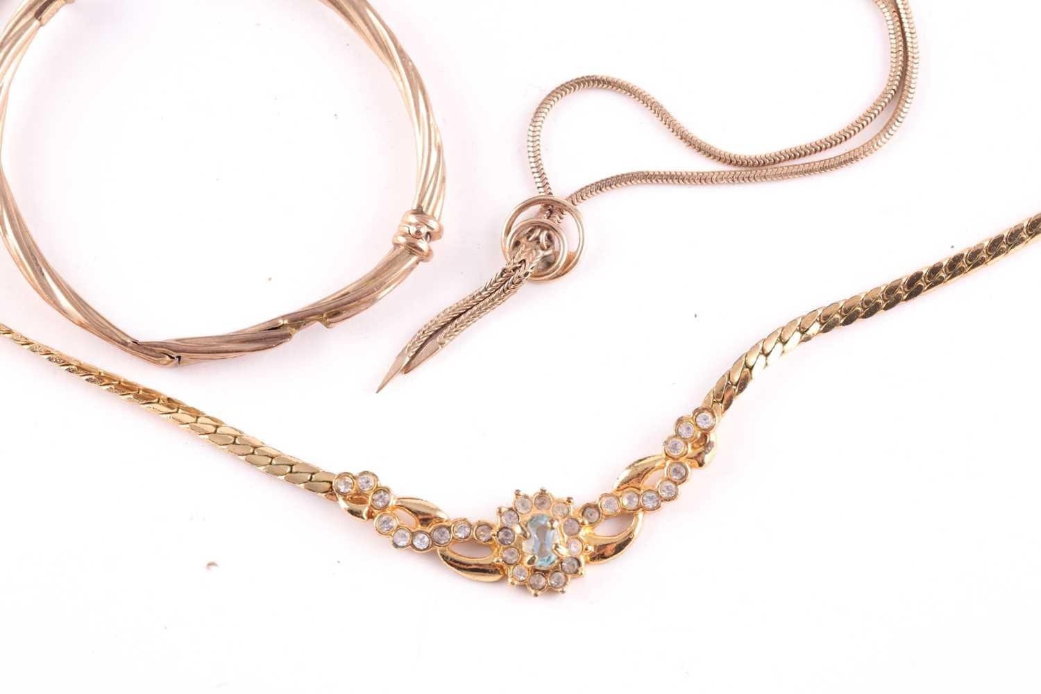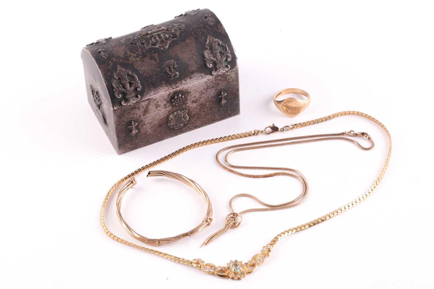 A 9ct yellow gold signet ring, together with a 9ct yellow gold chain necklace, and a 9ct yellow gold bangle (a/f), together with a gilt metal costume necklace, and a small silver jewellery box with pink lined box. (qty)