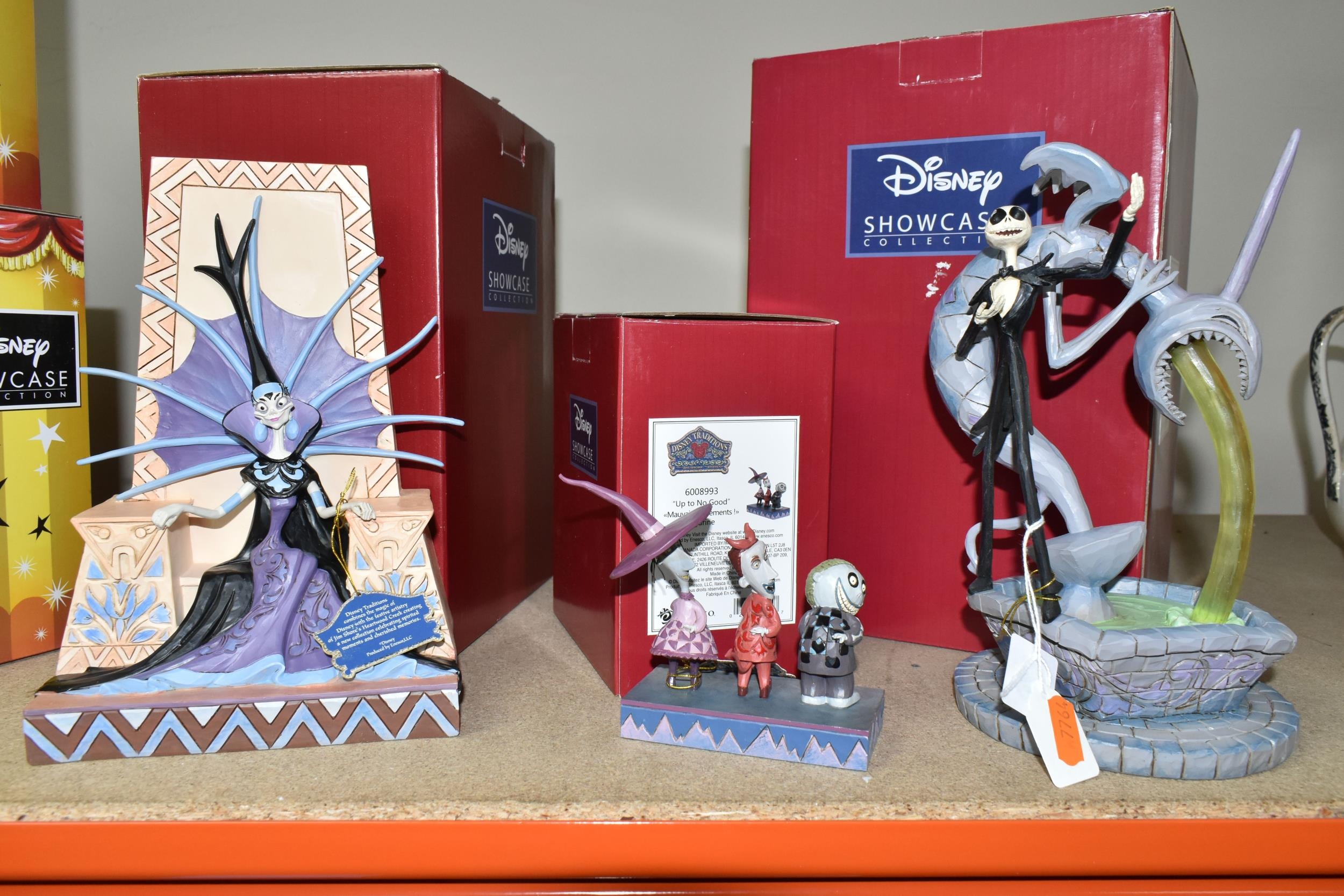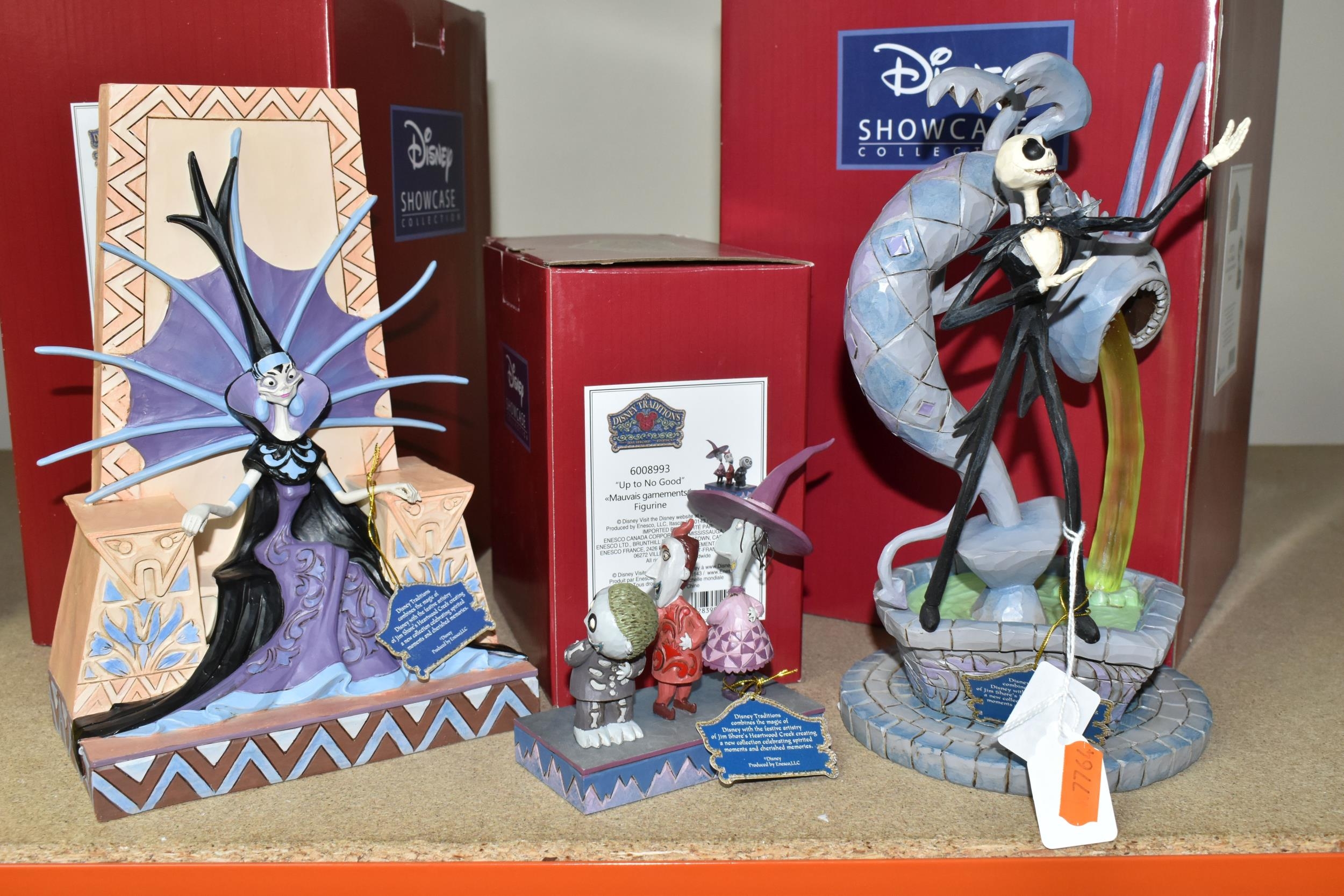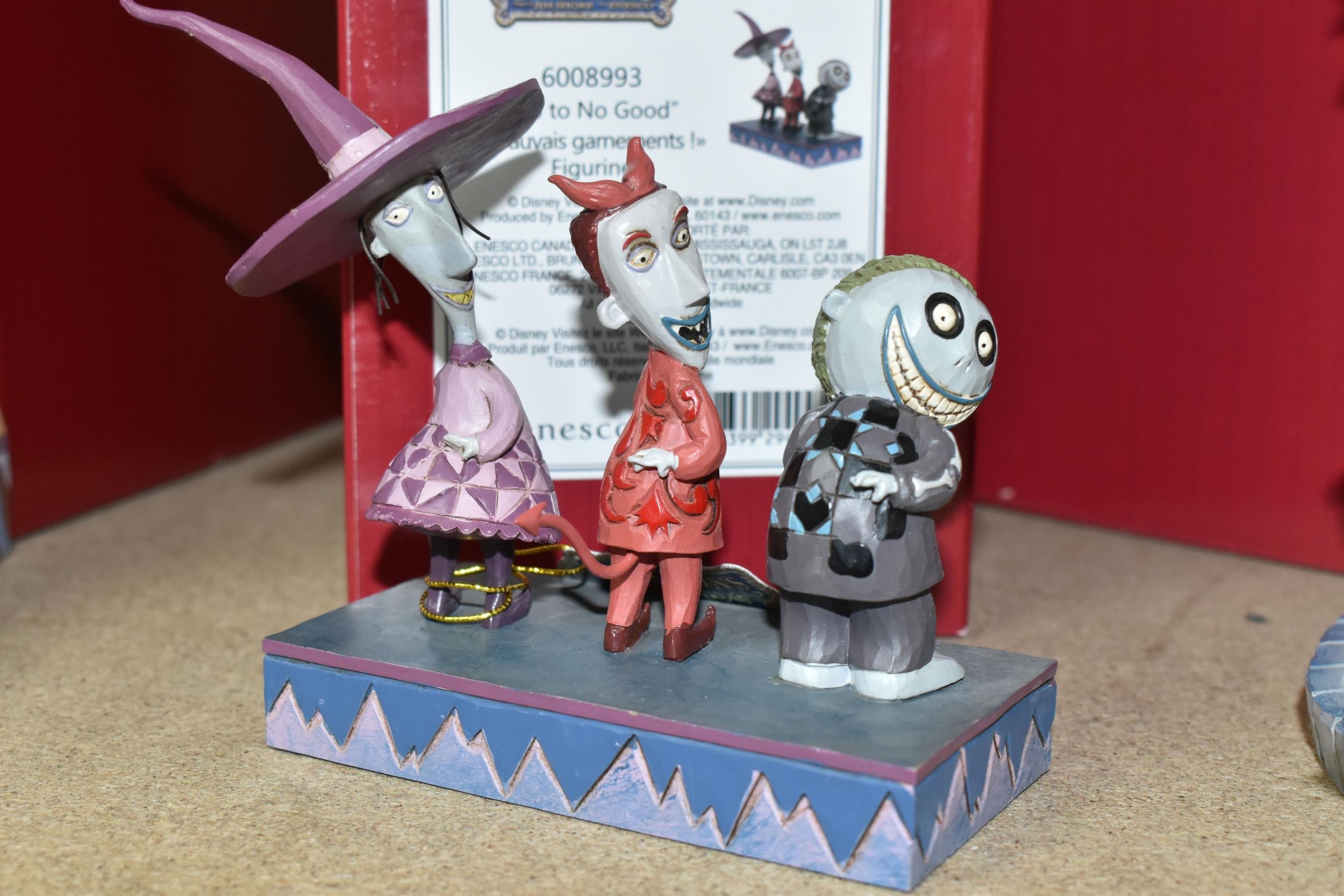 THREE BOXED ENESCO DISNEY SHOWCASE COLLECTION FIGURES, by Jim Shore, comprising The Nightmare Before Christmas 'Soulful Soliloquy' no 6007075 and 'Up to No Good' no 6008993, with 'Emaciated Evil' no 6008061 (3 + 3 boxes) (Condition Report: all appear in good condition, occasional tiny paint chips)