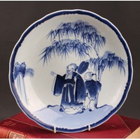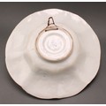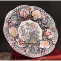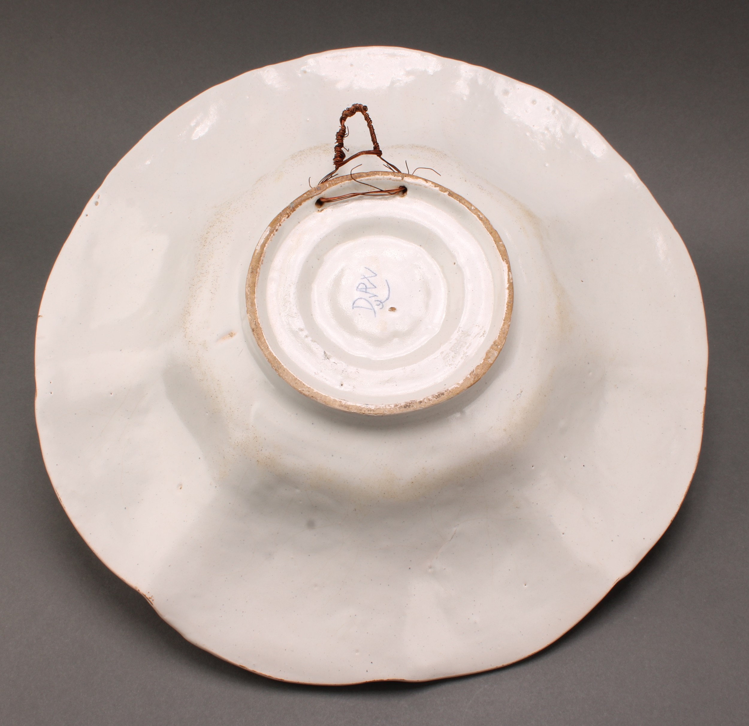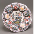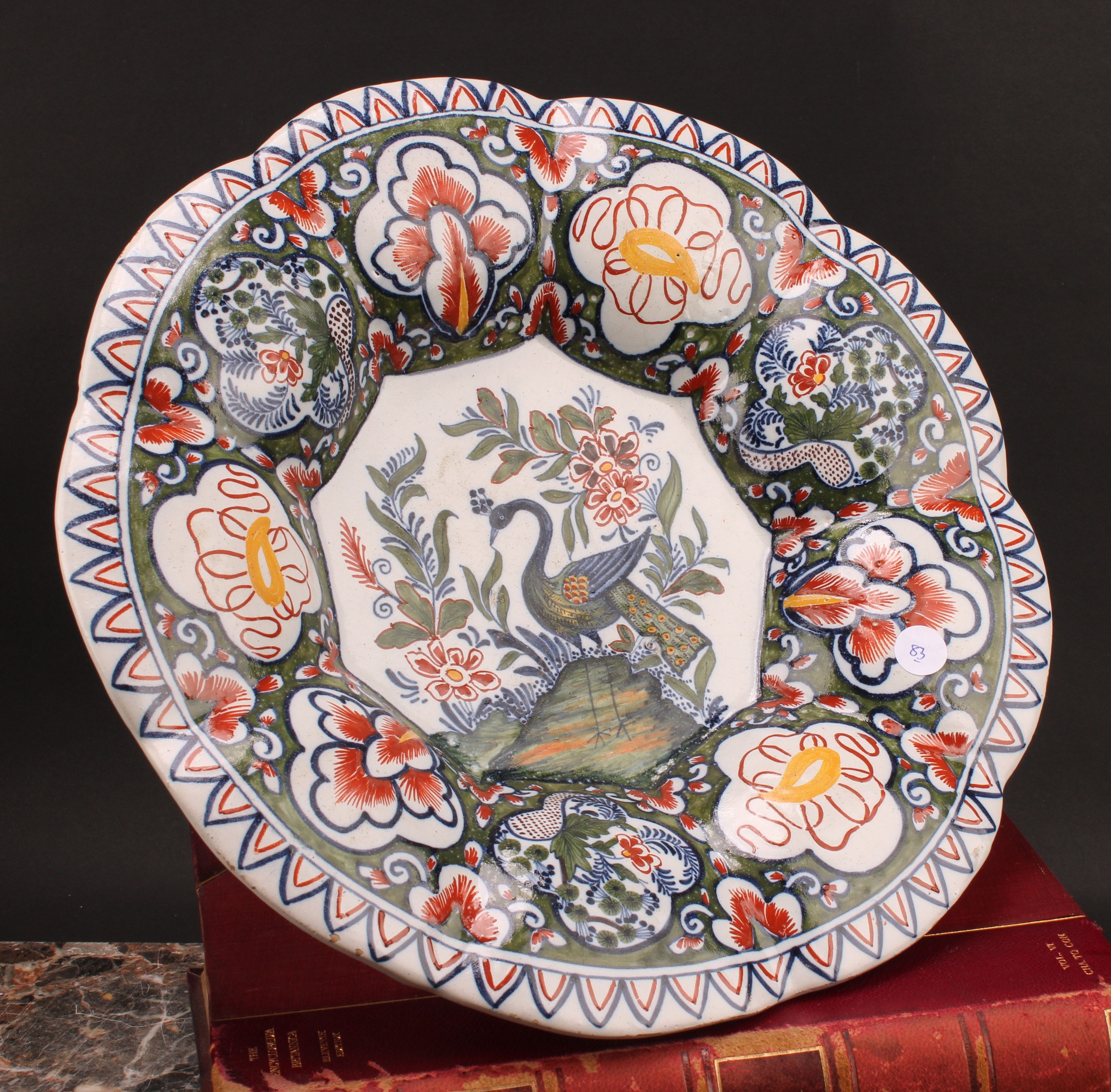 A Delft lobed circular dish, painted in polychrome, with a peacock in a garden setting, the rim with panels of stylised flowers and foliage, 36cm diameter, 19th century