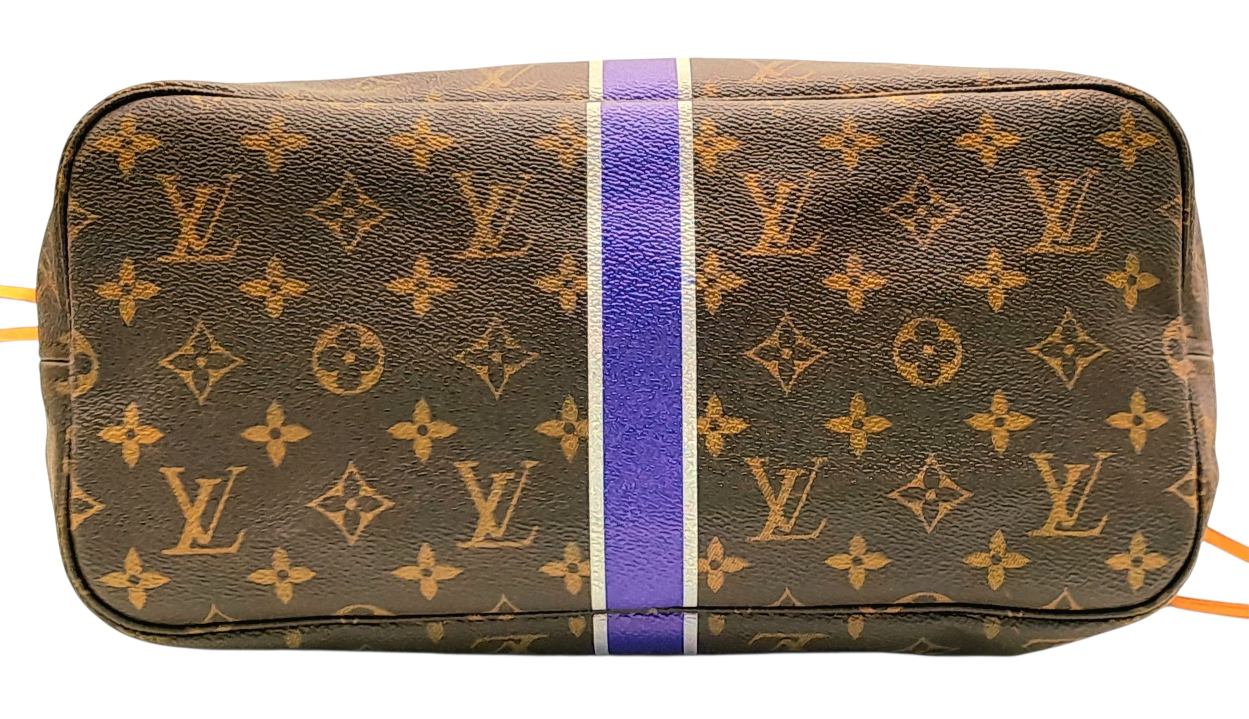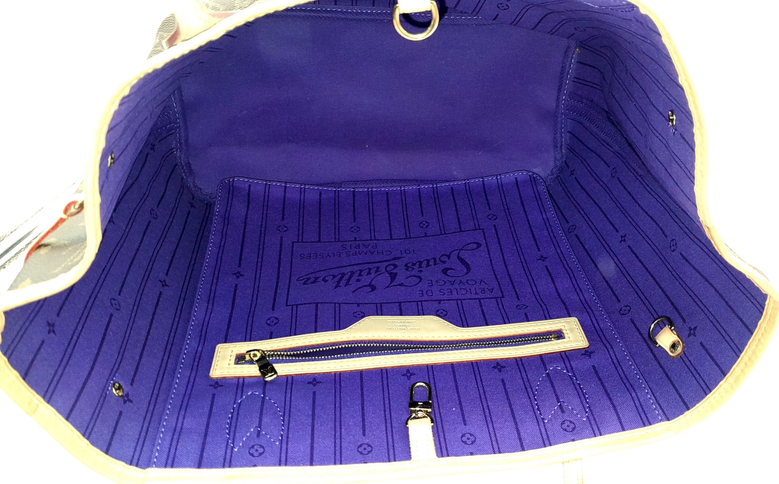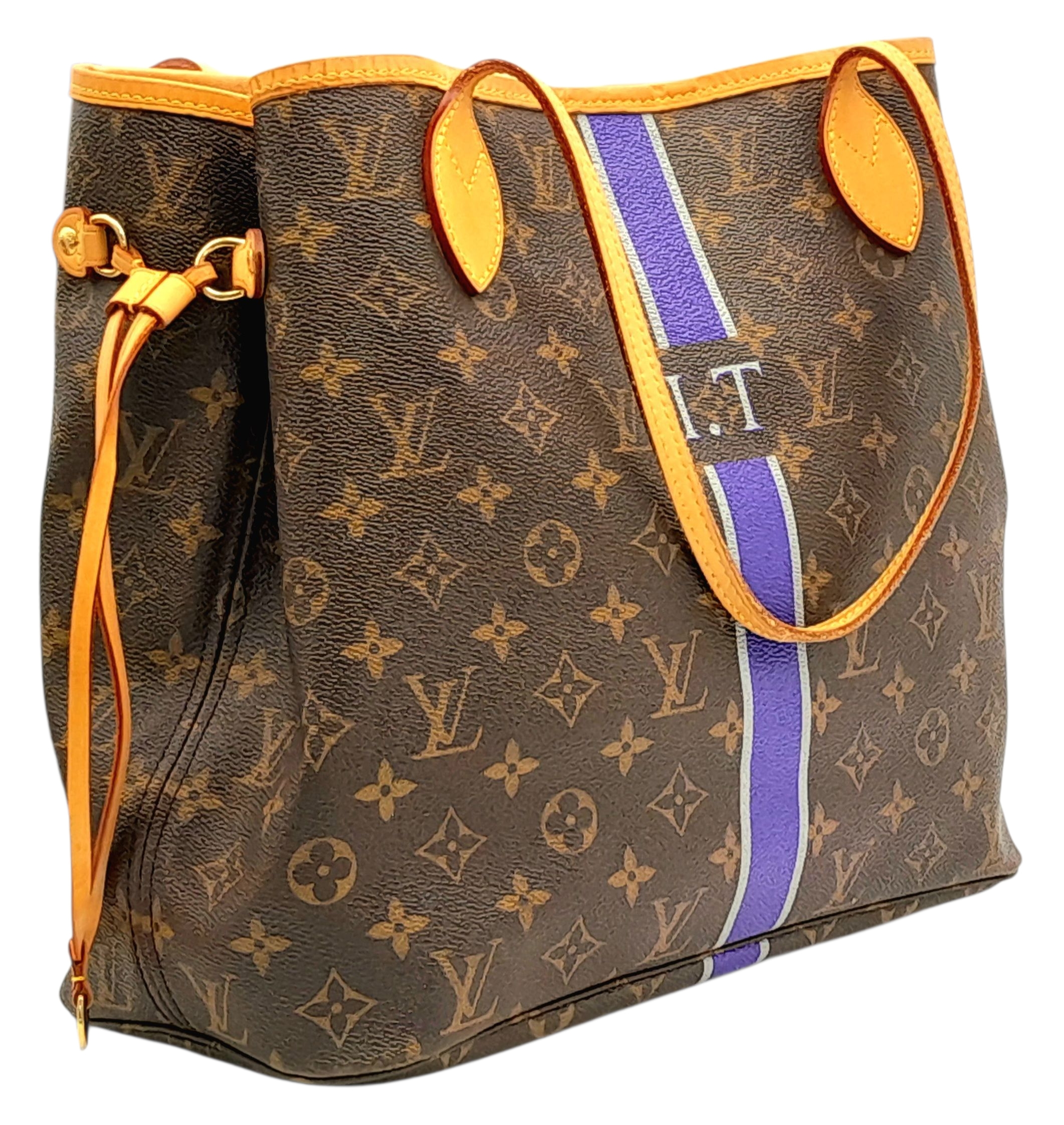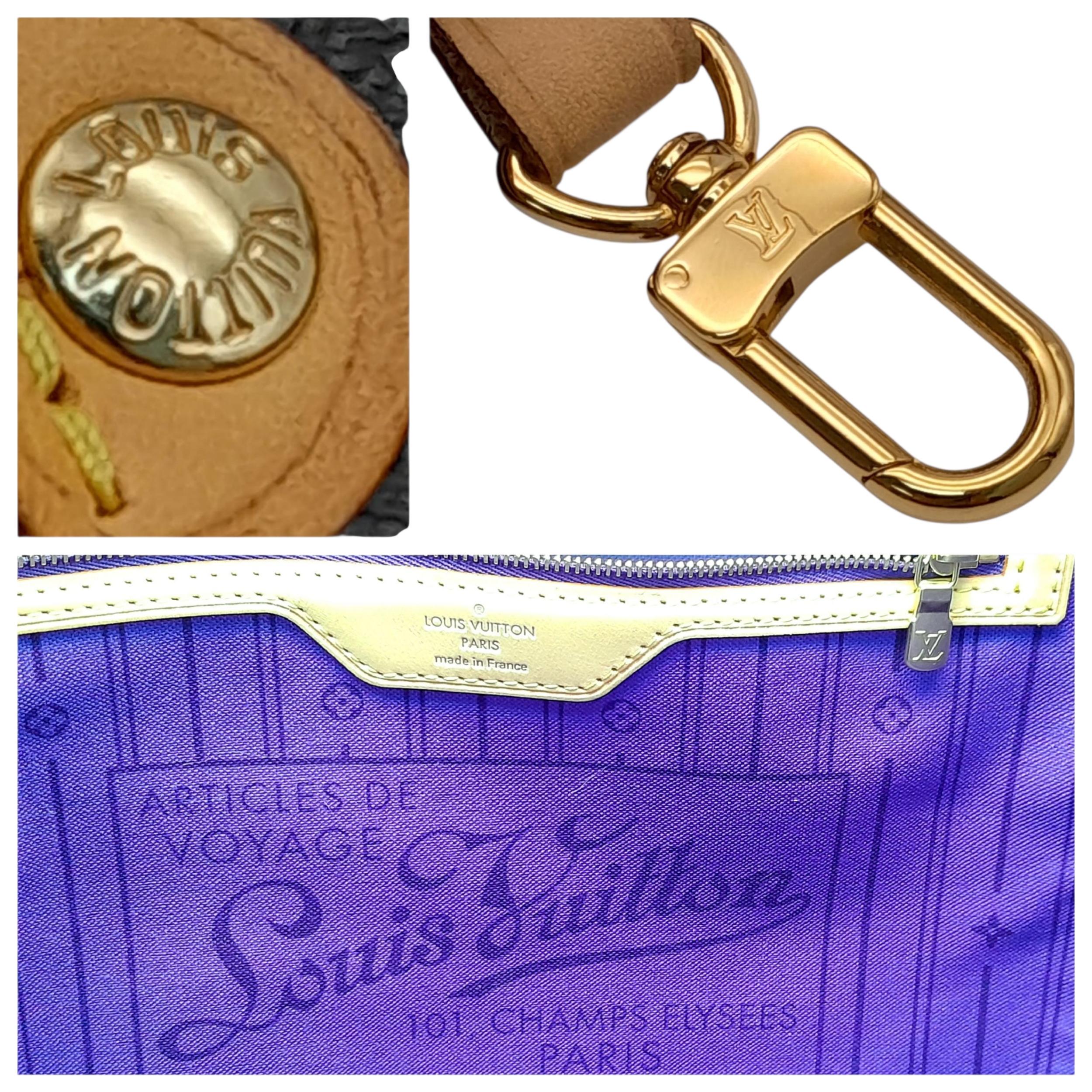A Louis Vuitton Neverfull Tote Bag. Monogram coated canvas exterior with leather trim, two straps and double safety straps. Purple textile interior with a zipped side pocket. Approximately 44cm length x 28cm height. Some light discolouration to leather but in good condition overall - please see photos for conditions or request a condition report. . REF: STK024776