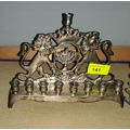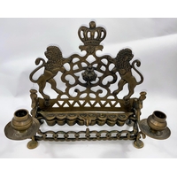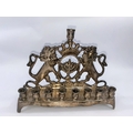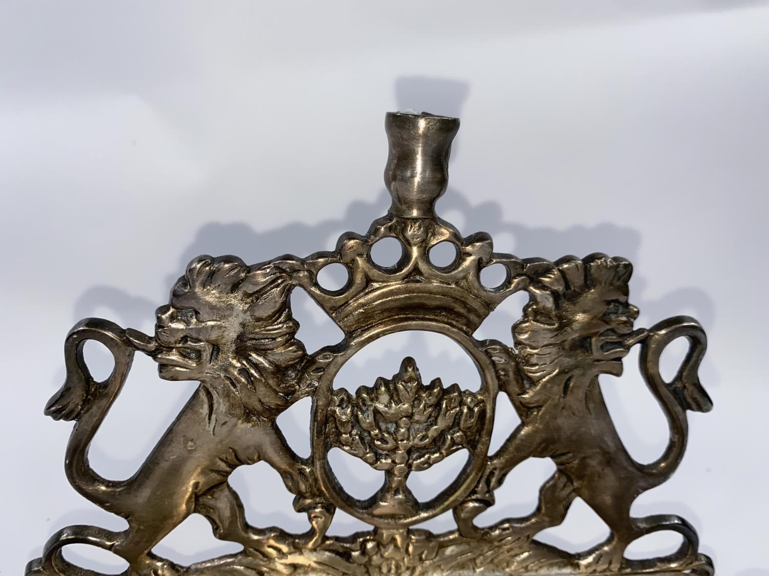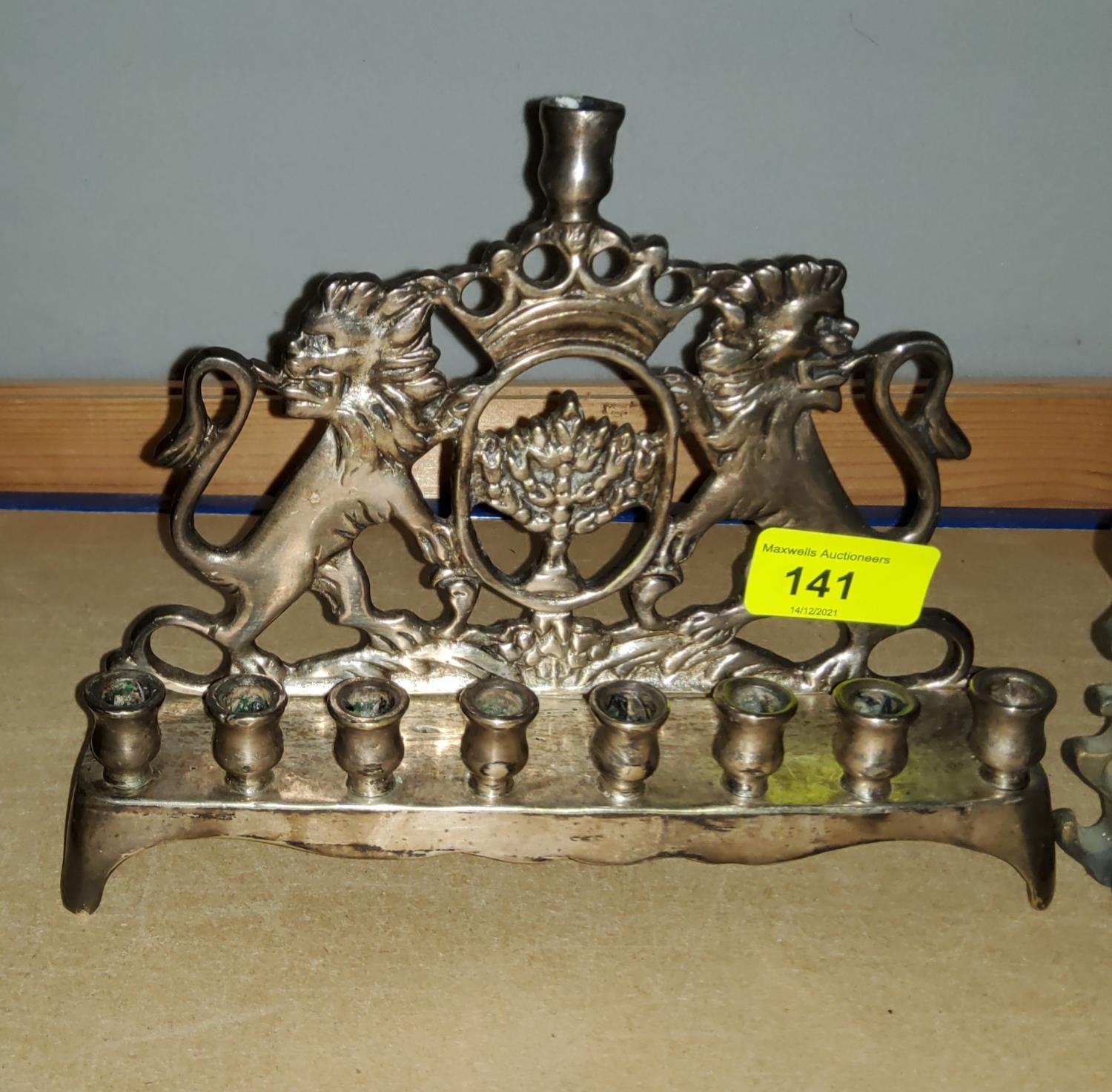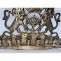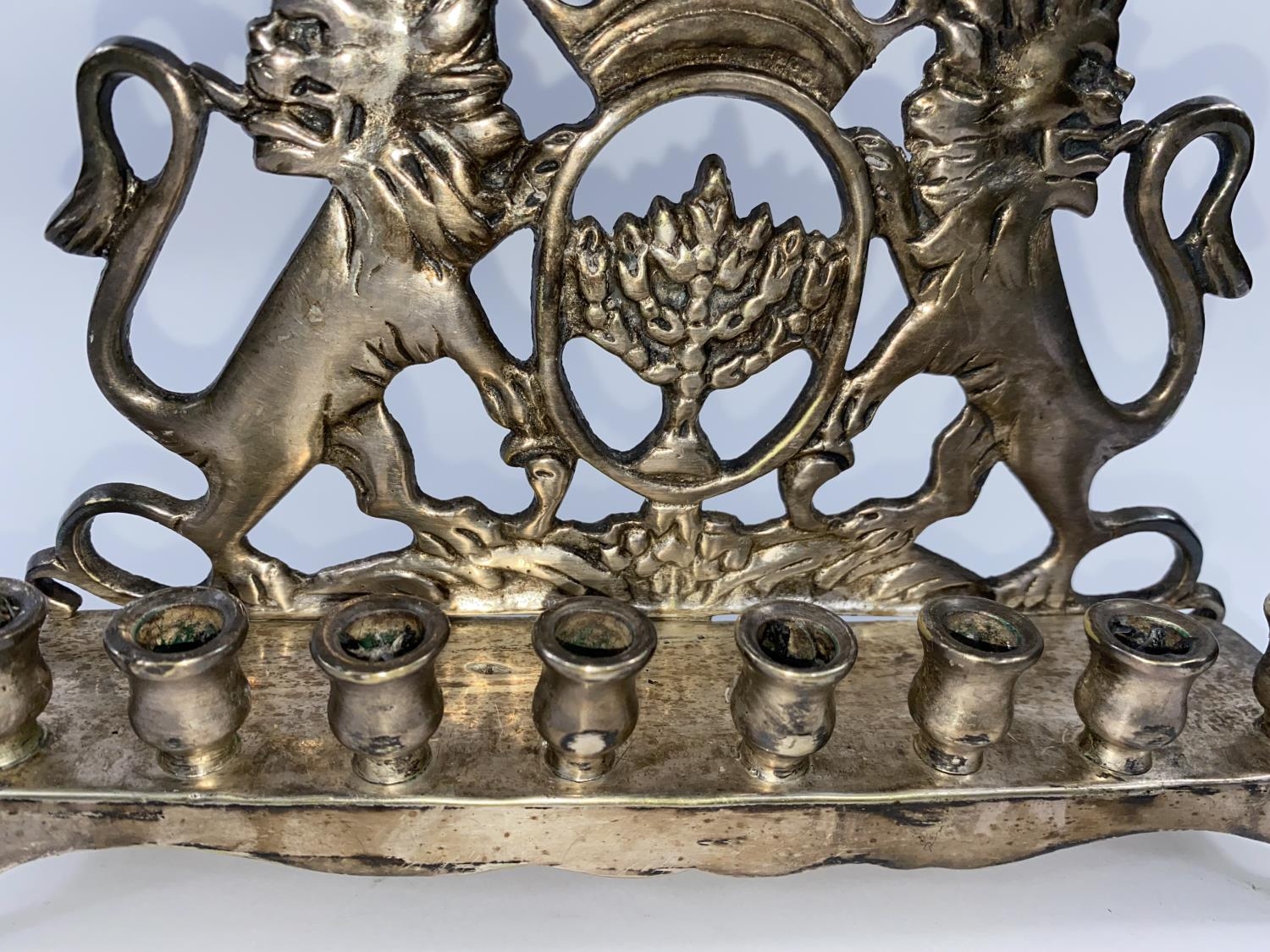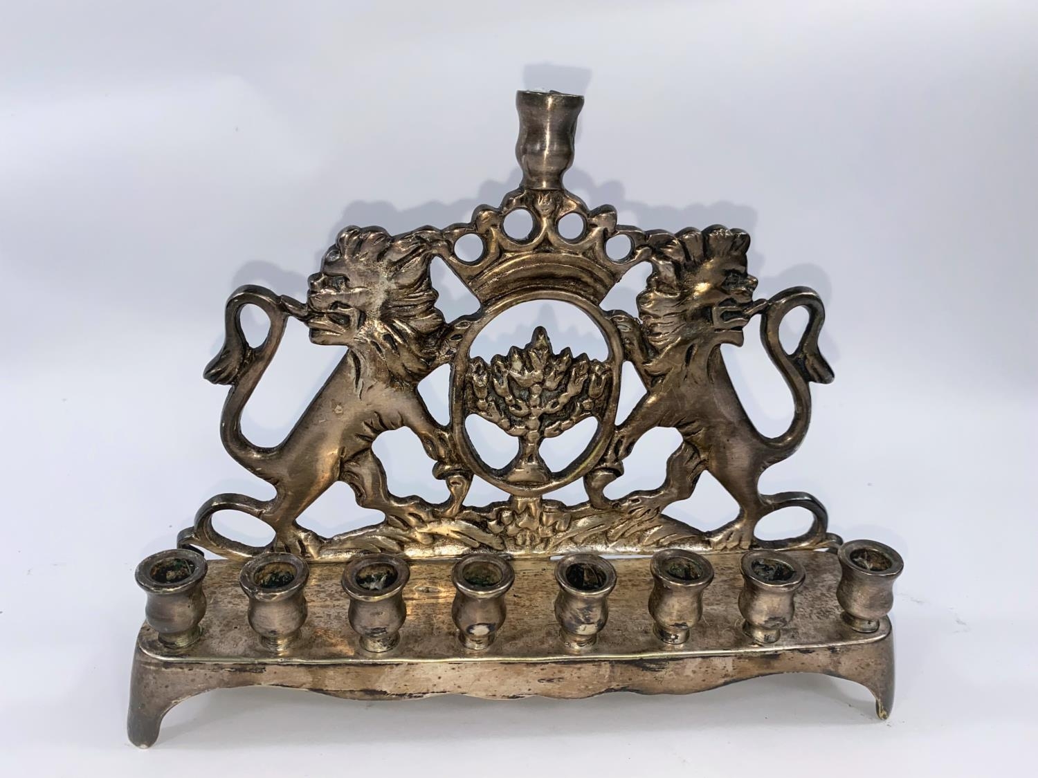 A silvered metal Hanukkah light -Menorah with twin lions rampant width 21cm