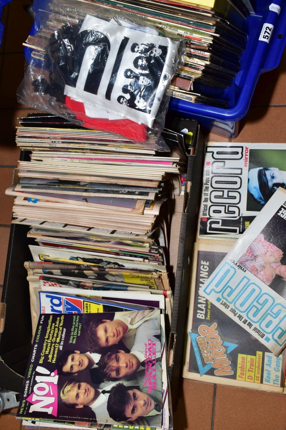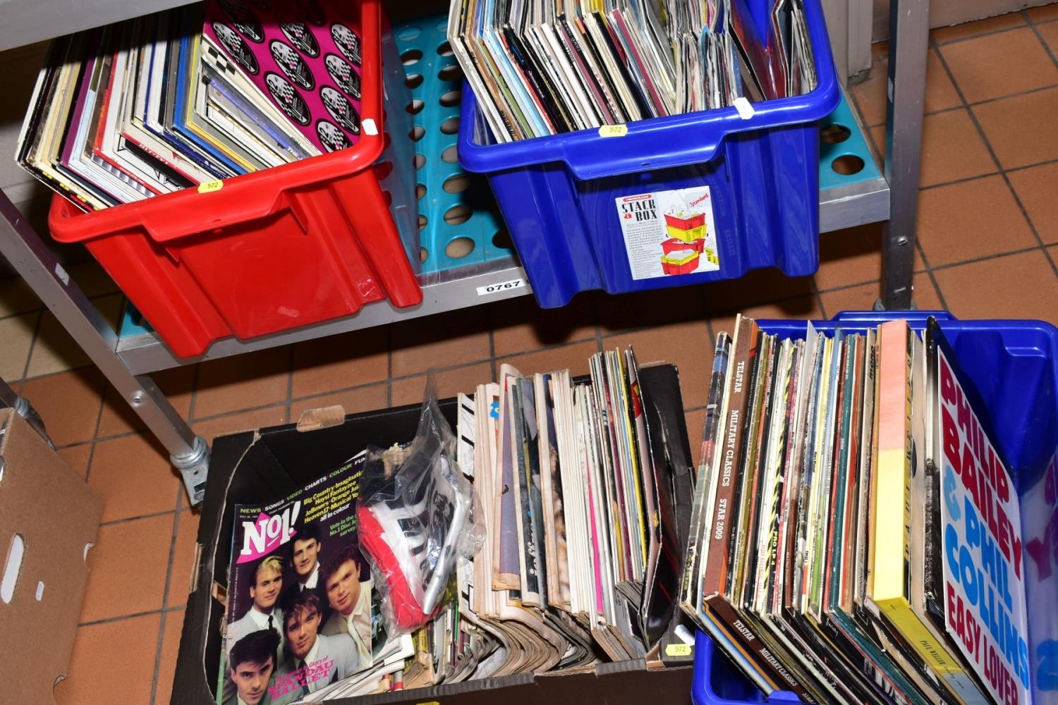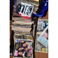 THREE BOXES OF LP'S AND SINGLES AND A BOX OF MUSIC RELATED MAGAZINES, including 1980's Smash Hits, Record Mirror, LP's including easy listening, 1980's and 1990's pop, etc (four boxes)