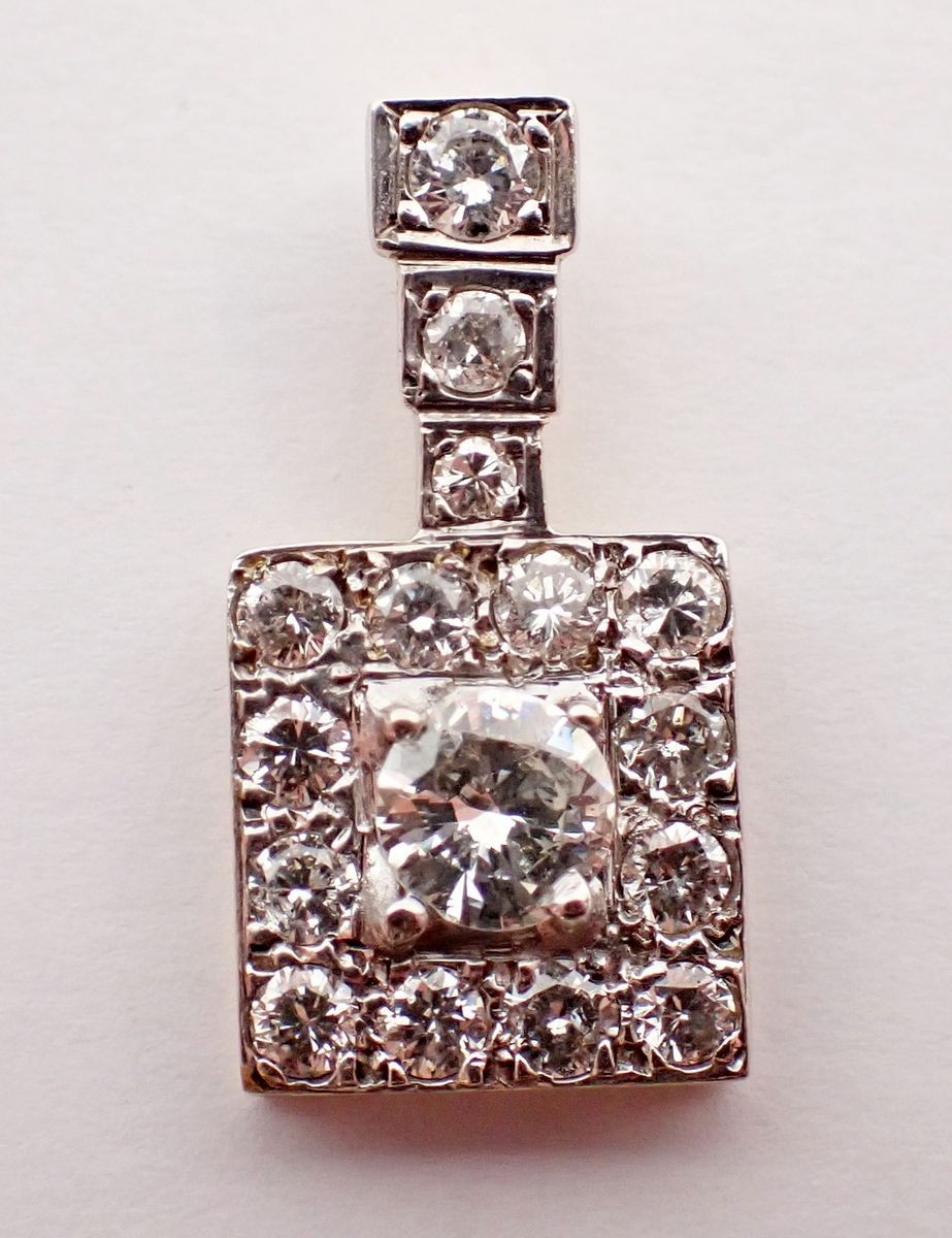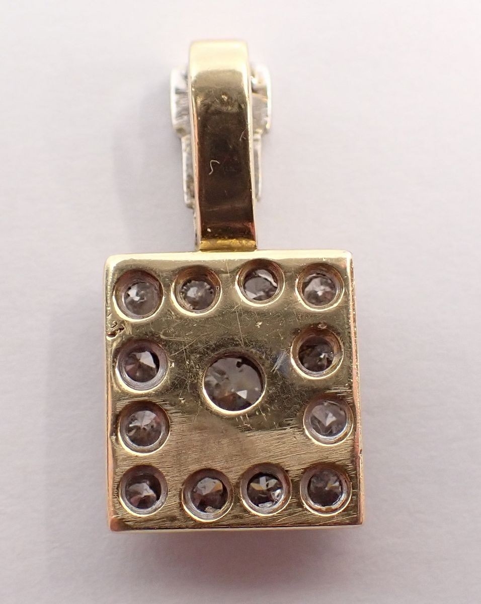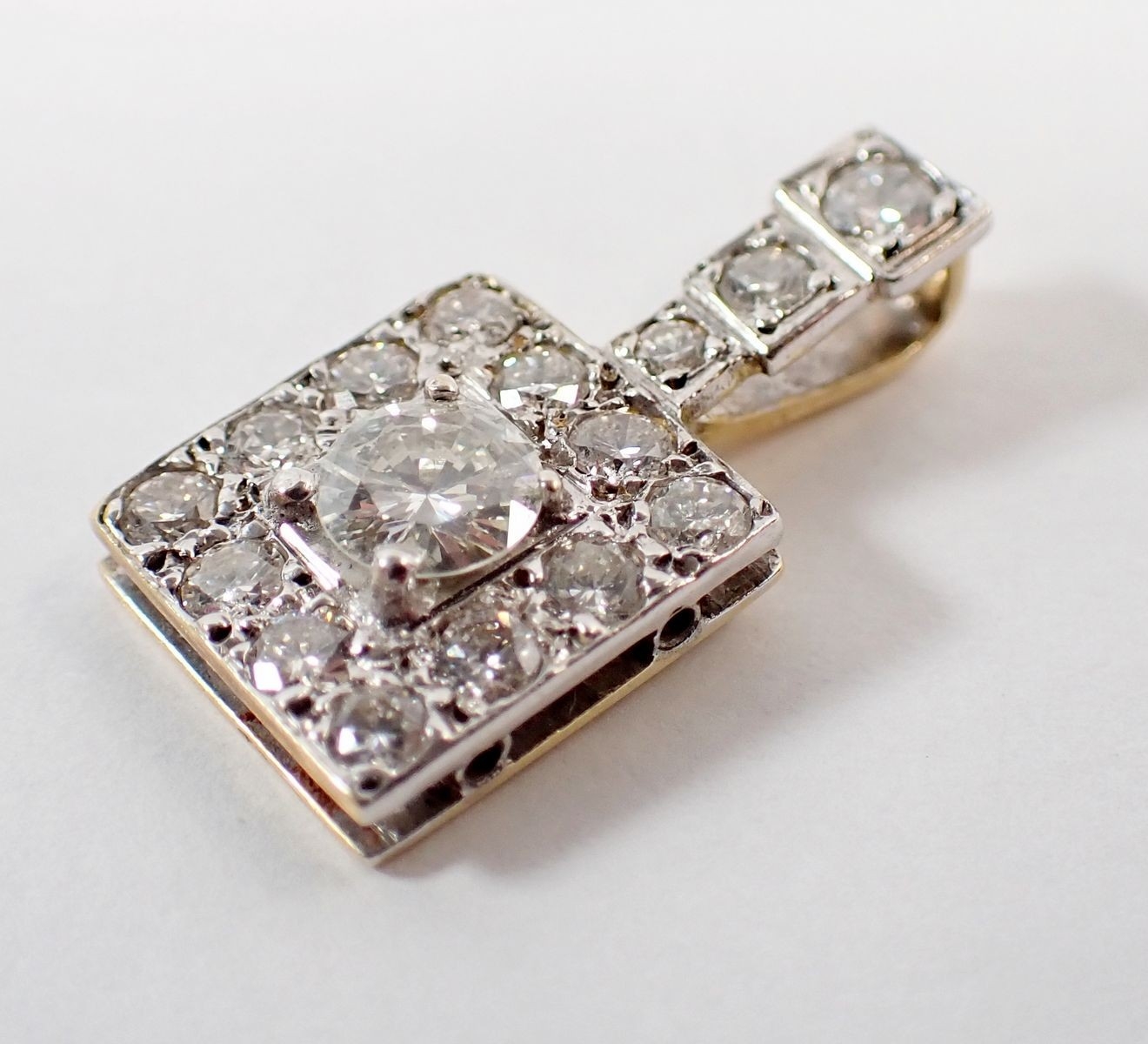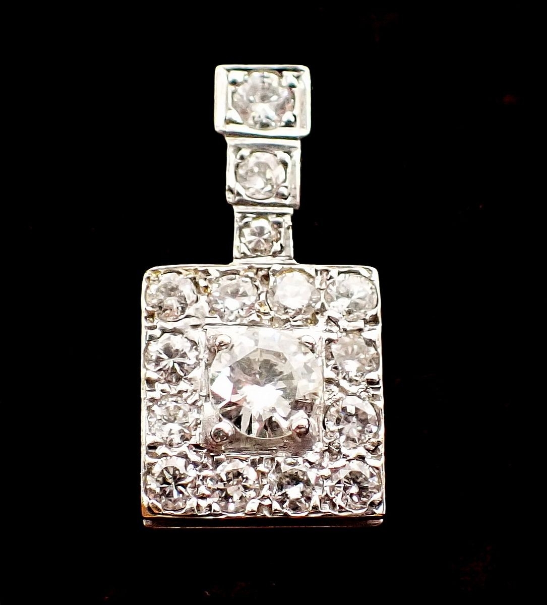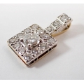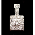 An Art Deco style square diamond pendant, the central brilliant cut diamond set within diamond surround, on white and yellow gold, 2.2cm long (central diamond 5mm) 3.1g