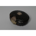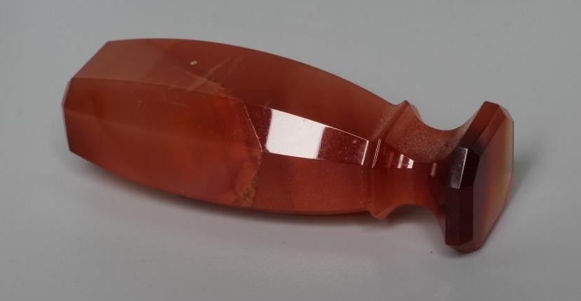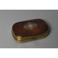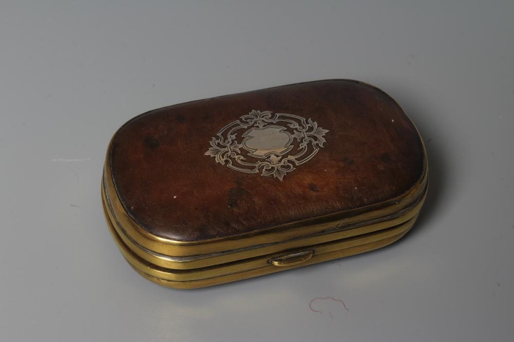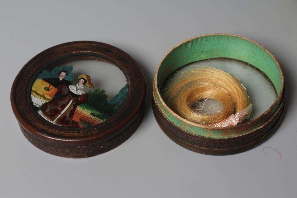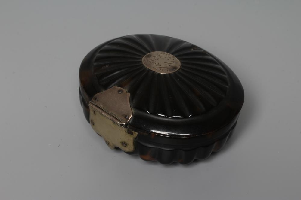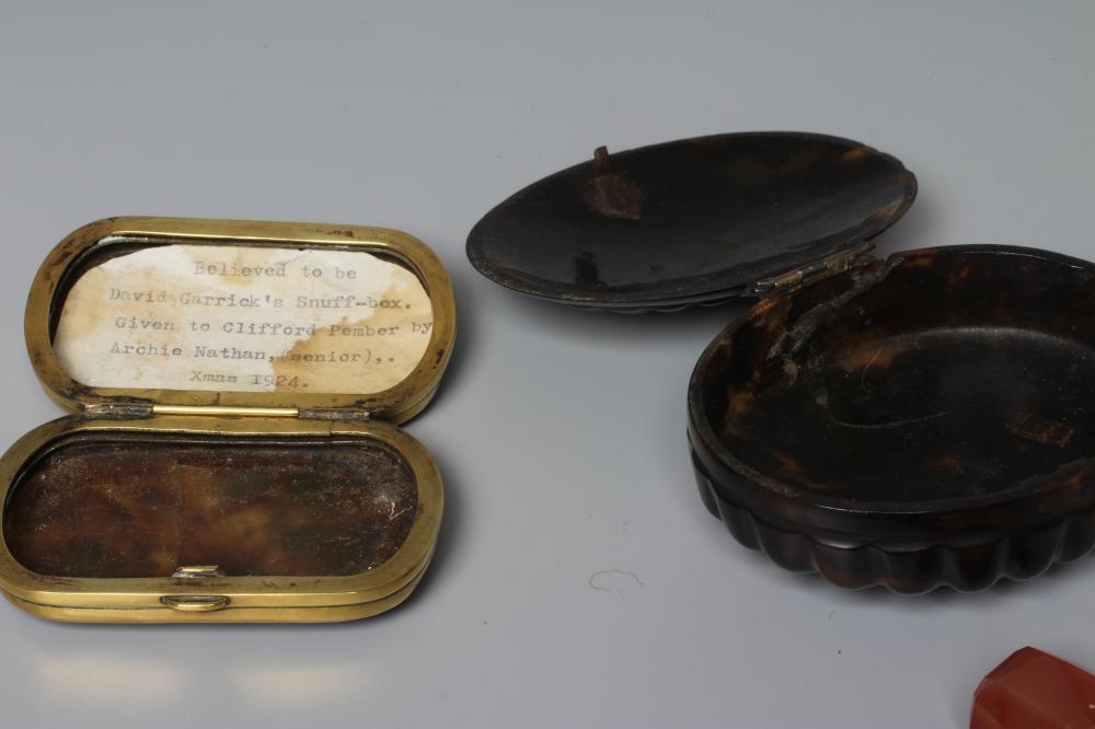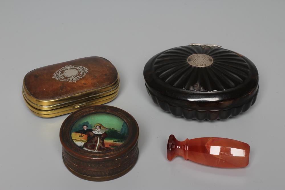 A SILVER MOUNTED TORTOISESHELL SNUFF BOX, mid 18th century, of rounded oblong form with a piquework panel to the hinged cover, with brass mounts, the interior enclosing a typed note 'Believed to be David Garrick's ', together with another fan pressed oval tortoiseshell snuff box, the hinged cover with applied silver panel engraved Joseph Wood, 1724, 3 1/2" wide, a cornelian hand seal (uncut), 2 1/4" long and a small Regency cylindrical box, the cover reverse painted on glass with a couple (4)