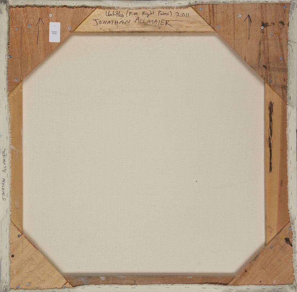 oil on canvas, signed, titled and dated on the reverse 'Jonathan Allmaier Untitled (Five Right Palms) 2011', 84 x 87.2 cm