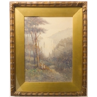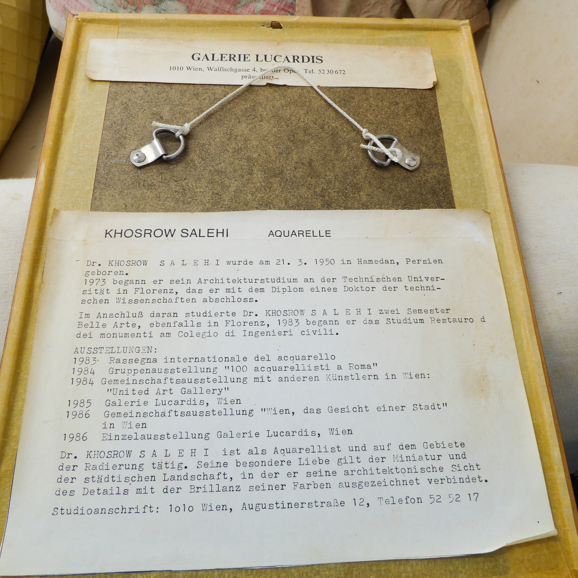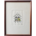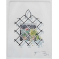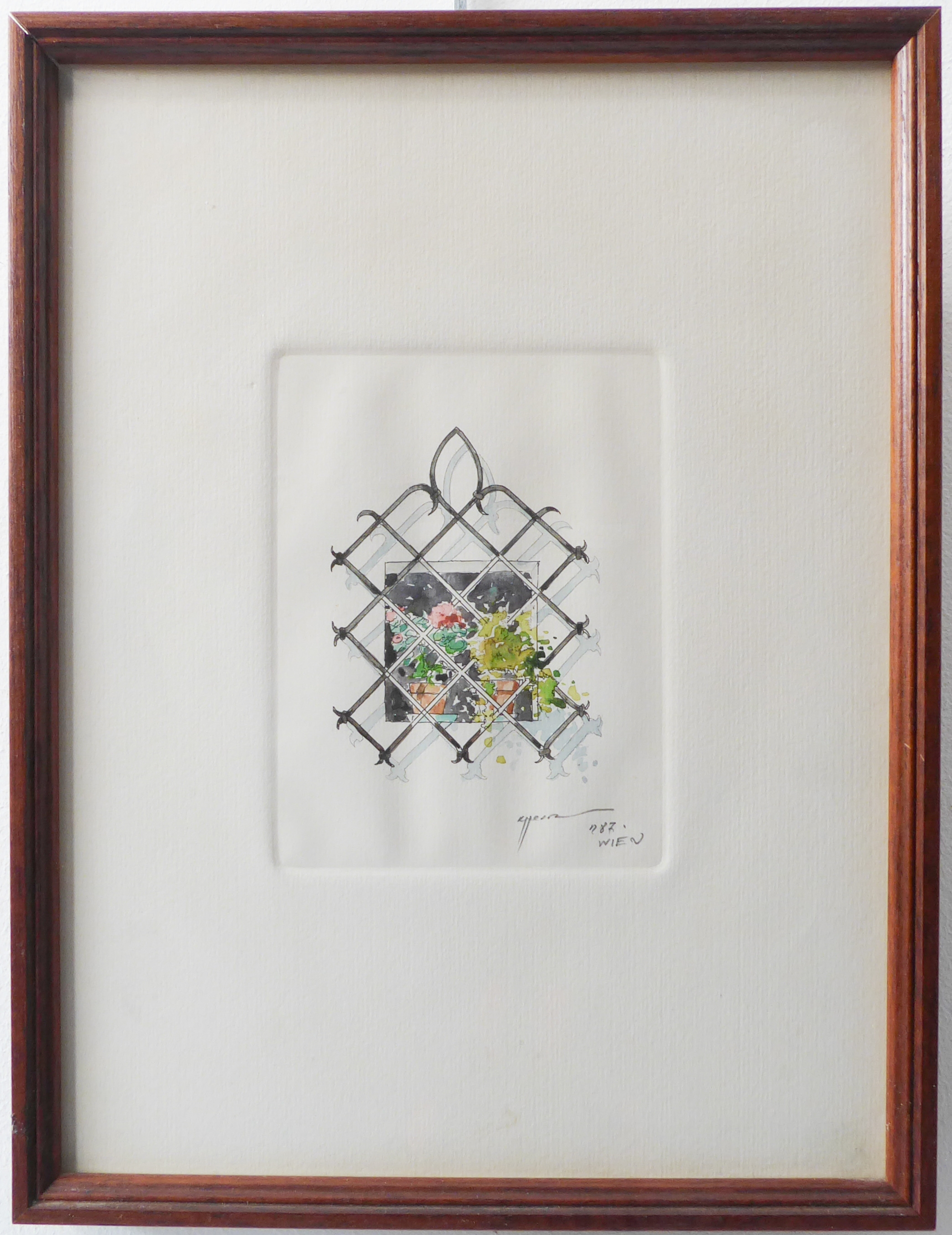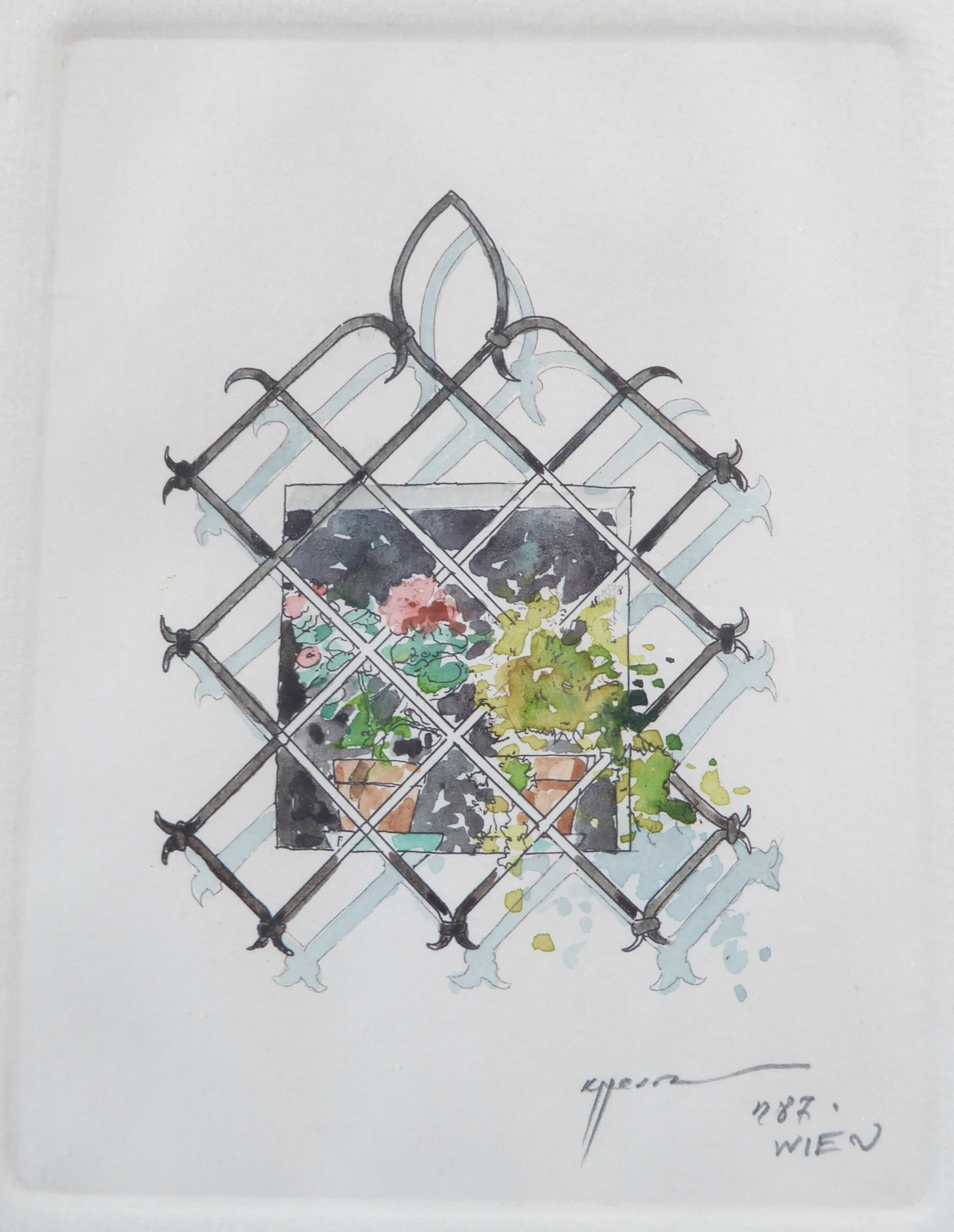 Dr KHOSROW SALEHI (Persian, 20th century), a coloured etching of flower pots through a latticework window, signed lower right, framed and glazed, (image size 12 cm x 9 cm)