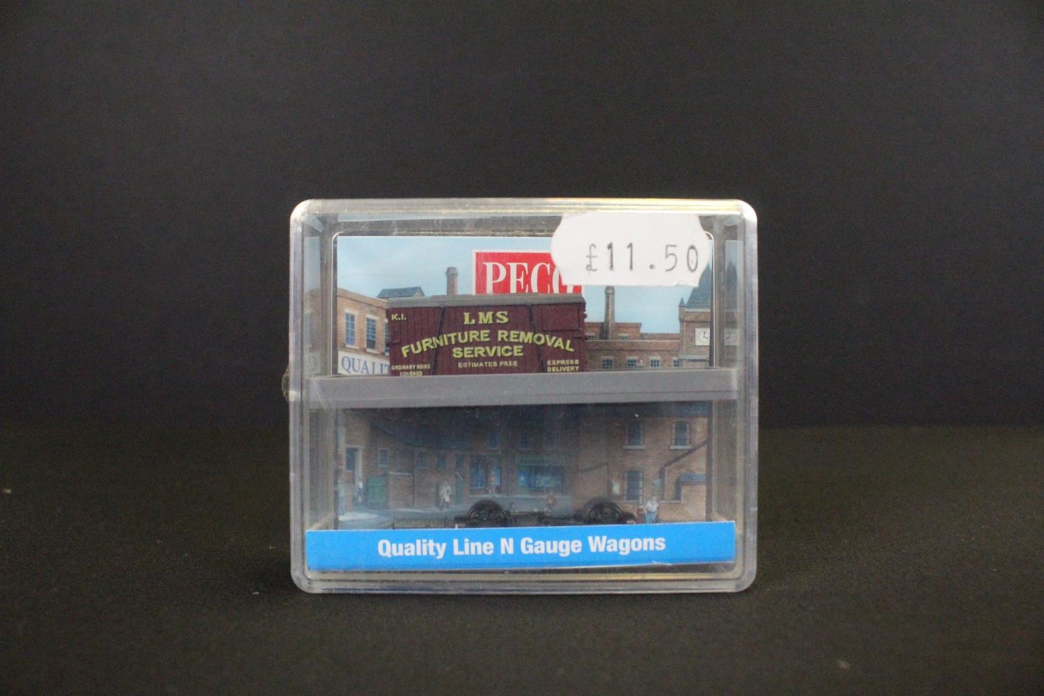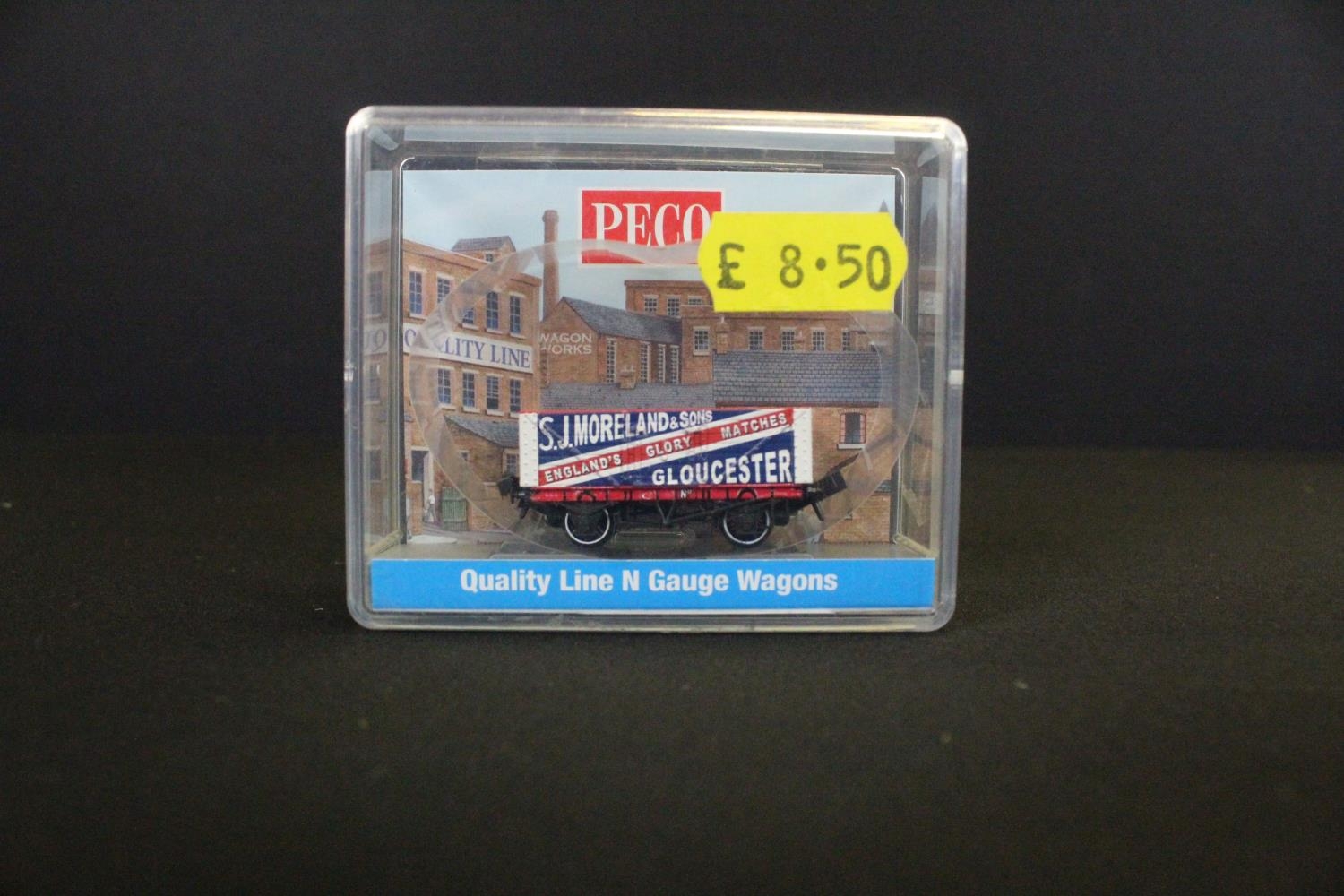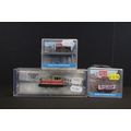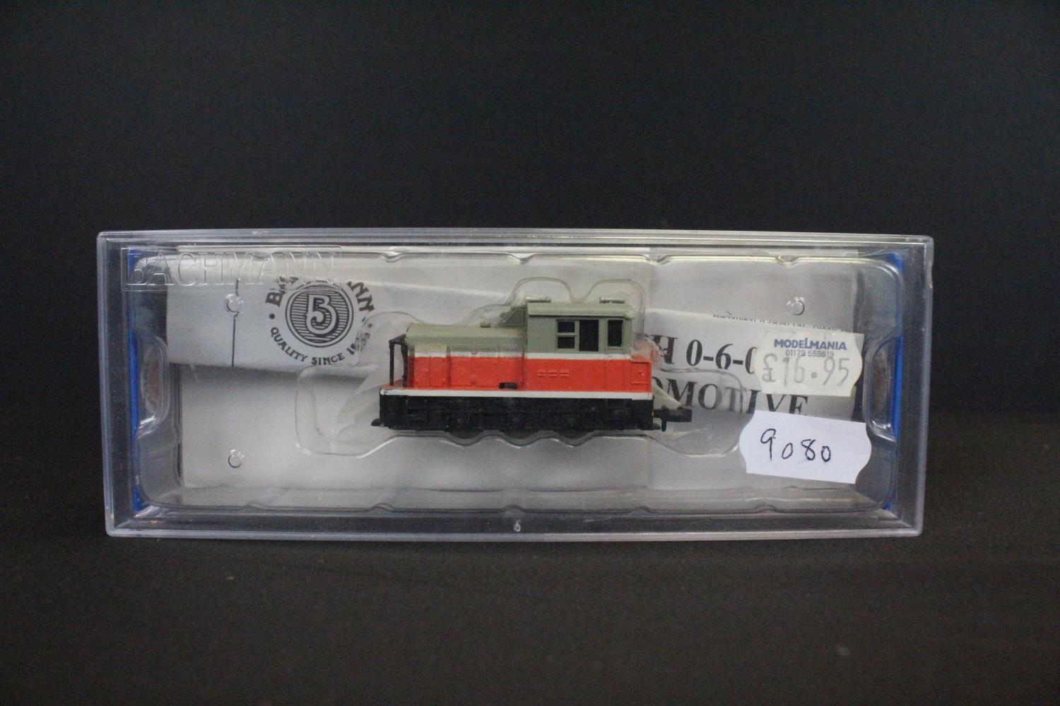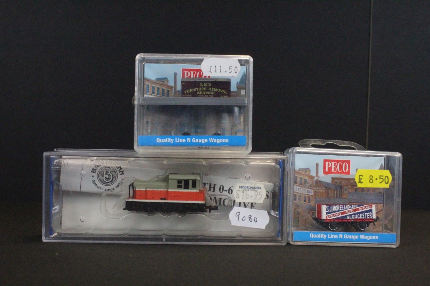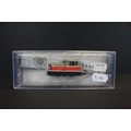 Cased Bachmann N gauge 60090 MDT Plymouth Diesel Locomotive Industrial red with yellow stripes plus 2 x cased Peco N gauge items of rolling stock (3 items)