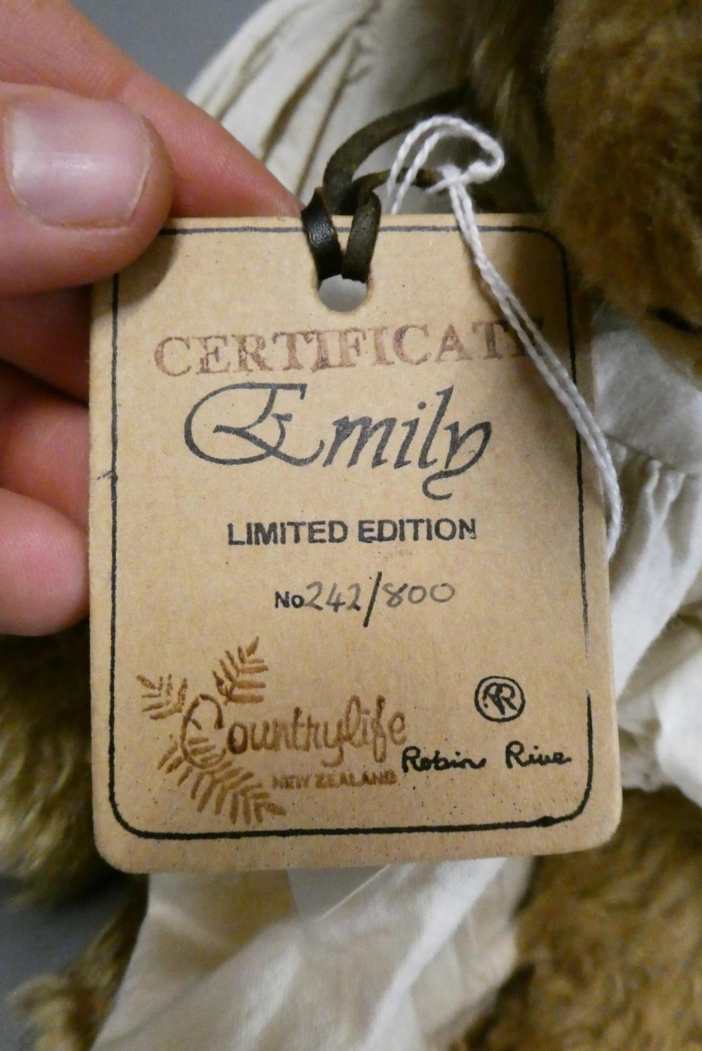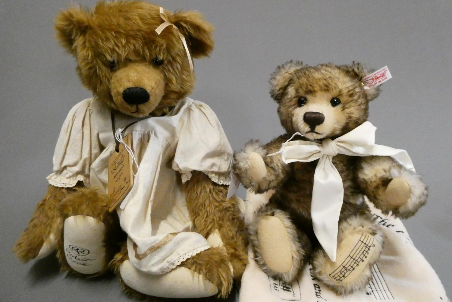 Steiff Musical teddy bear, with two tone plush, wind-up music box, notes sewn to foot, original bag, ear stud and label, bear 11 1/2" long, together with a 16 1/2" Robin Rive limited edition bear "Emily", 242 of 800, with card labels (2)