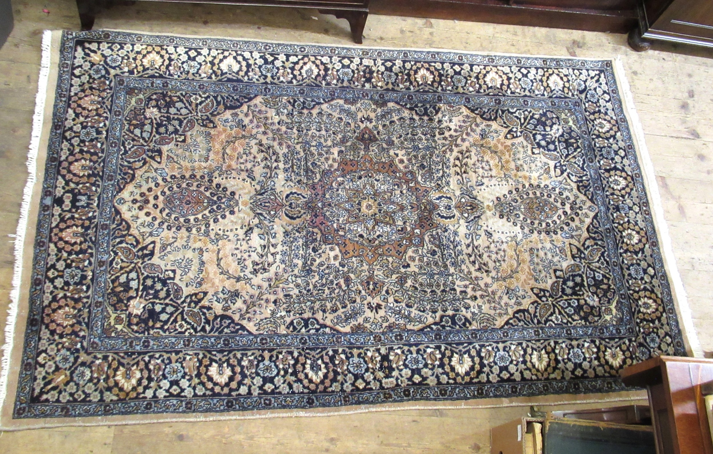 Indo Persian woollen rug of centre medallion and all-over floral design on a beige ground, 199 x 124cm