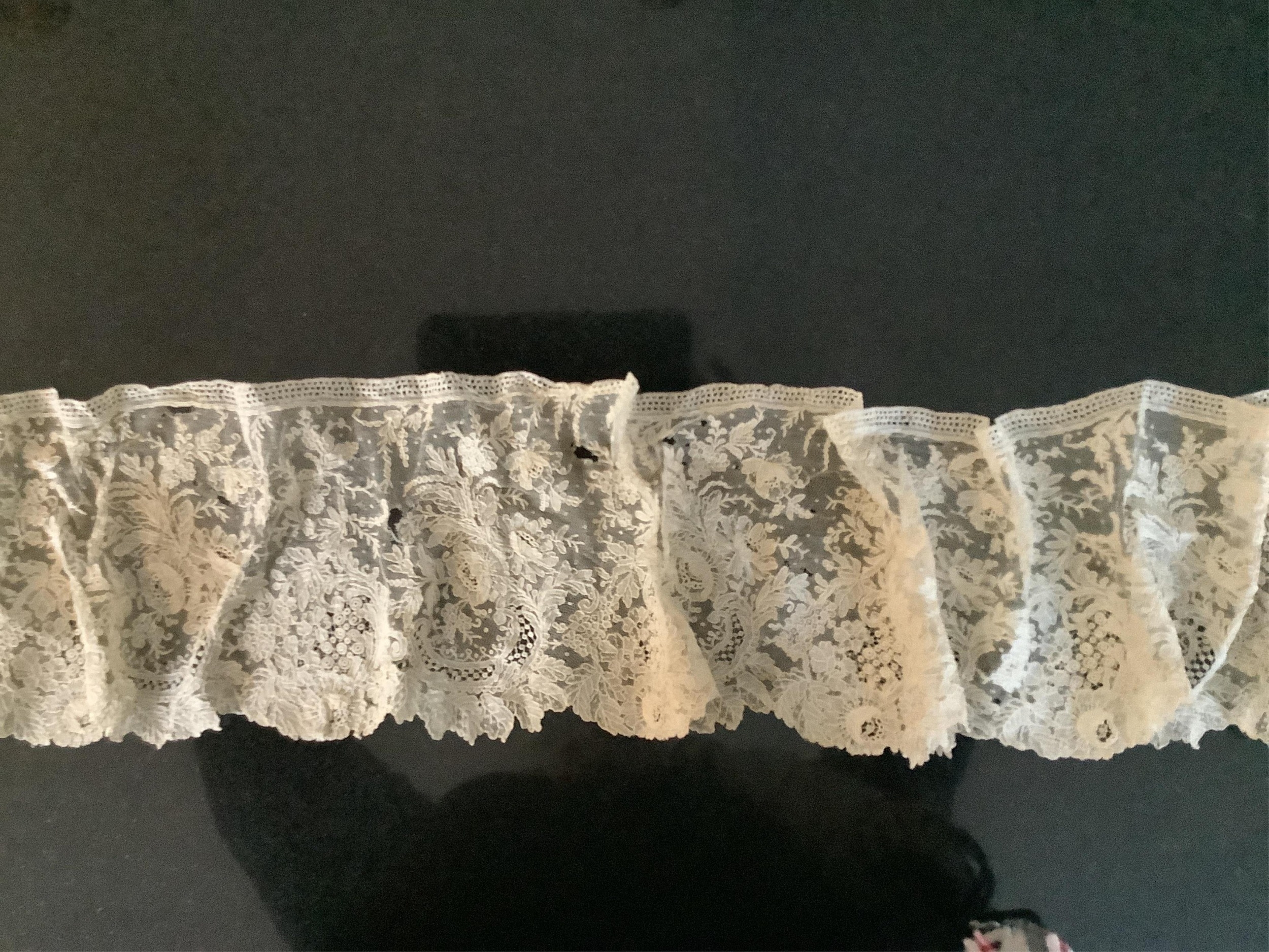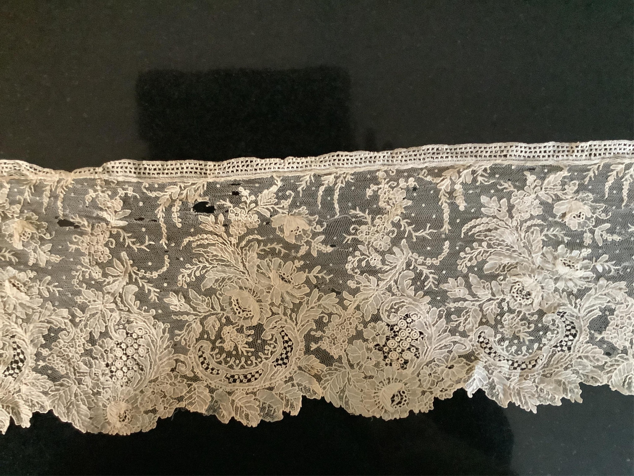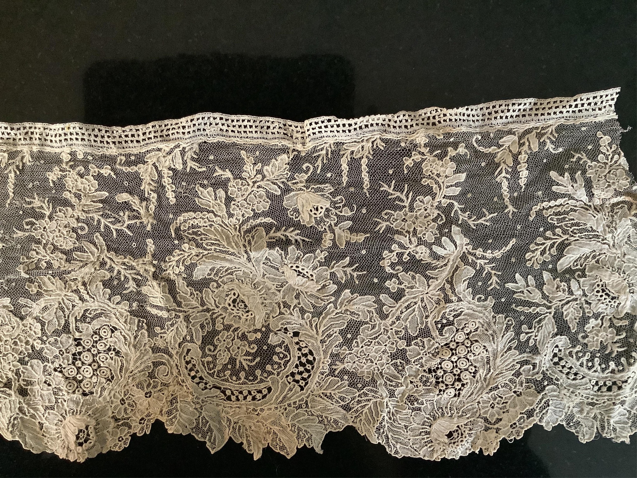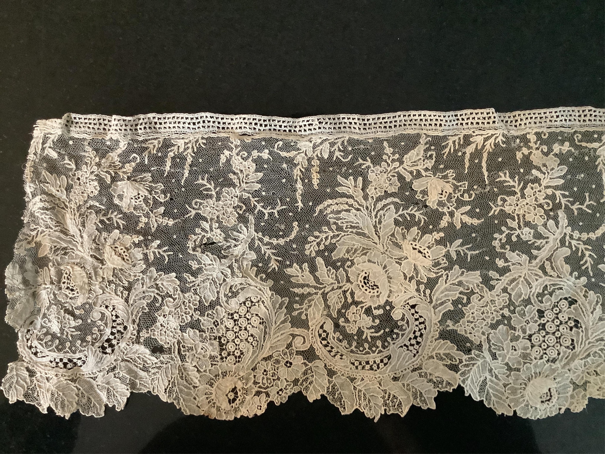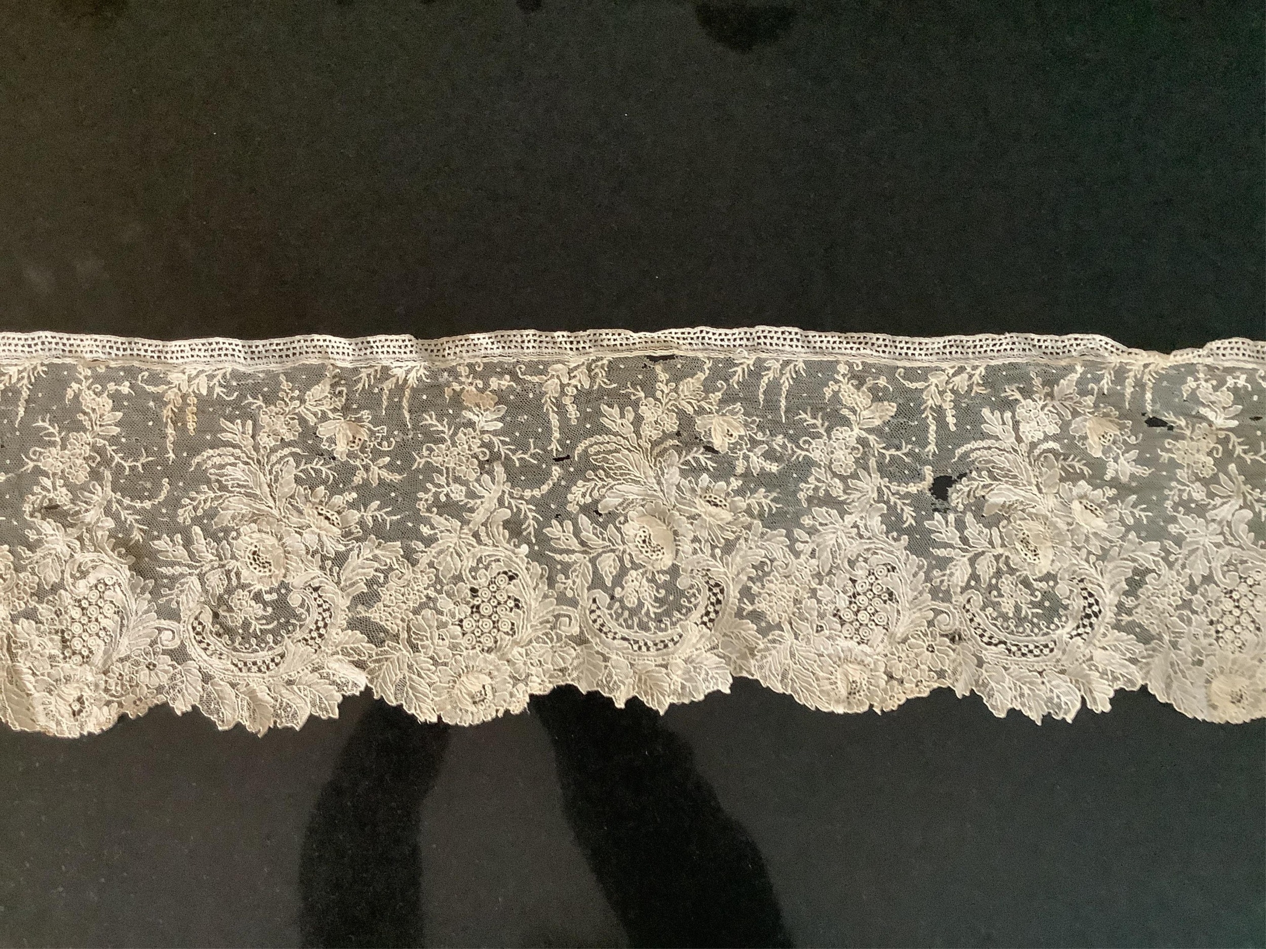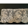 An ornate length of 19th century Point de Gaze needle lace trimming. Handmade with raised rose designed petals, eight large motifs along the central design and seven similar smaller roses along the border, all worked on a hand netted background, 132cm long x 16cm deep. Useful for designers and collectors.