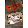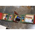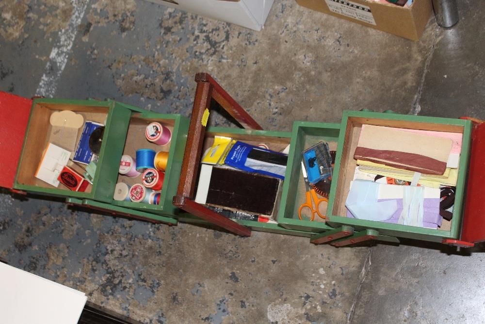 A QUANTITY OF SEWING ACCESSORIES TO INCLUDE A PAINTED FOLD OUT SEWING BOX AND CONTENTS