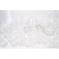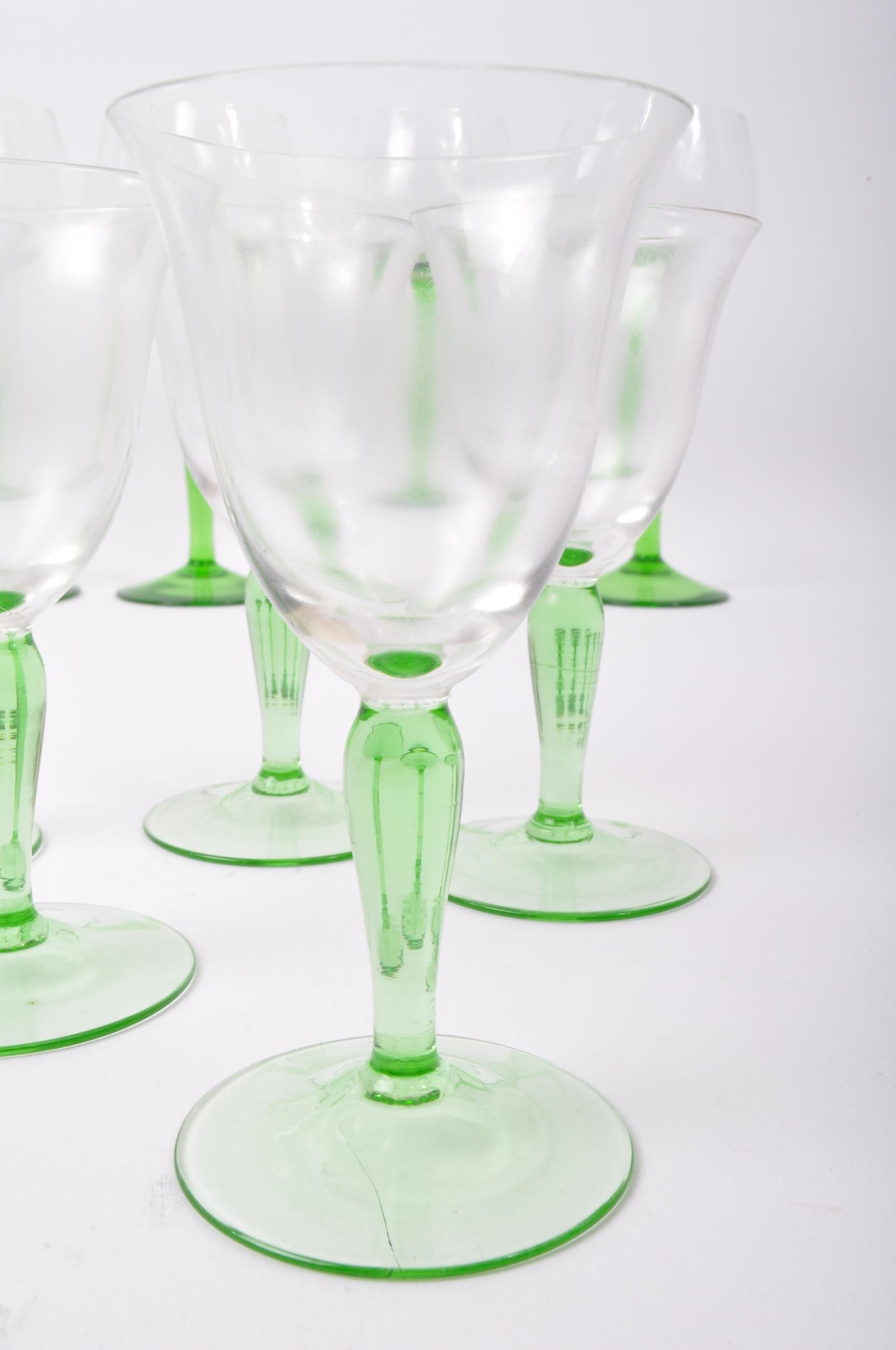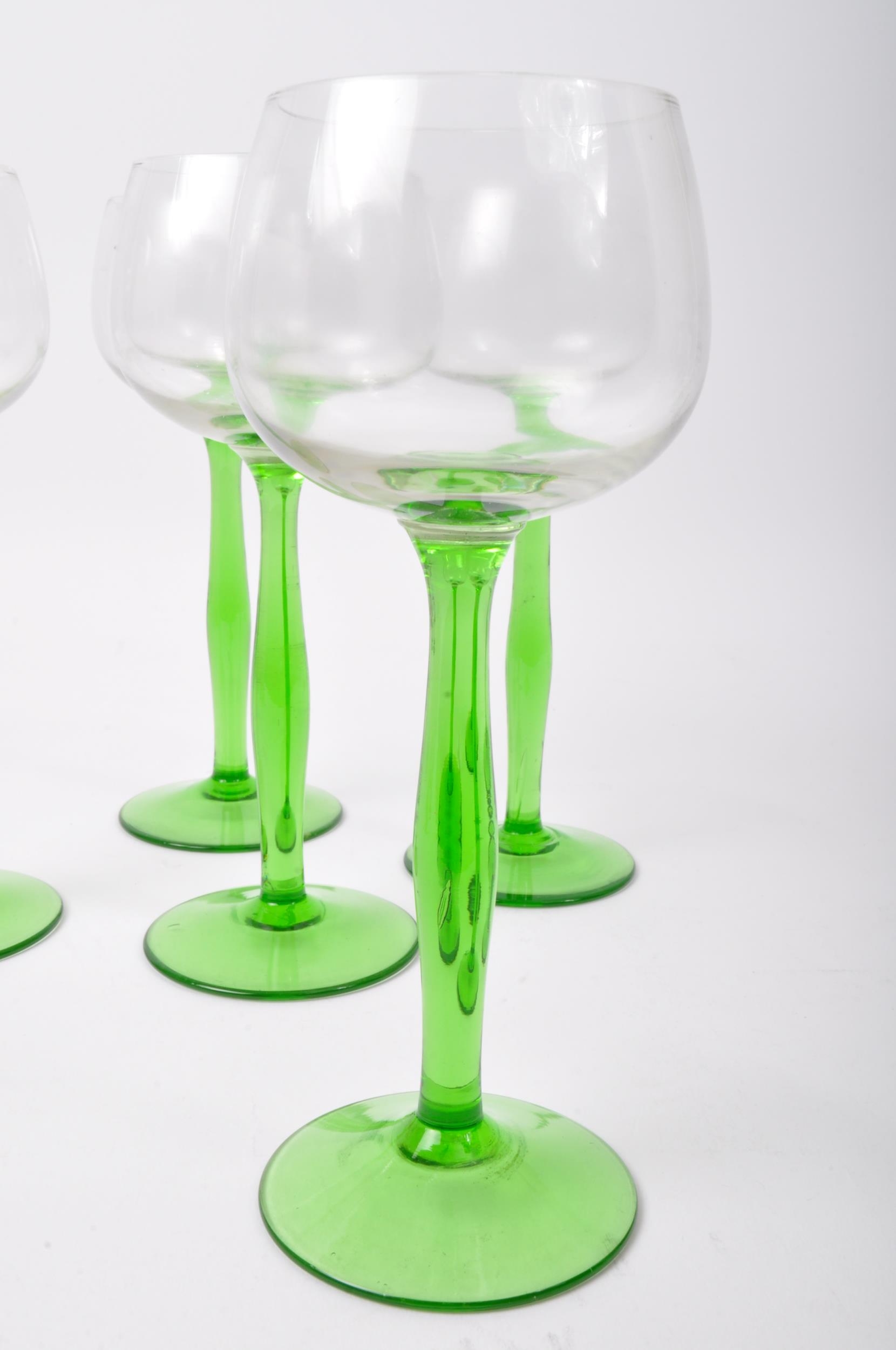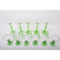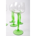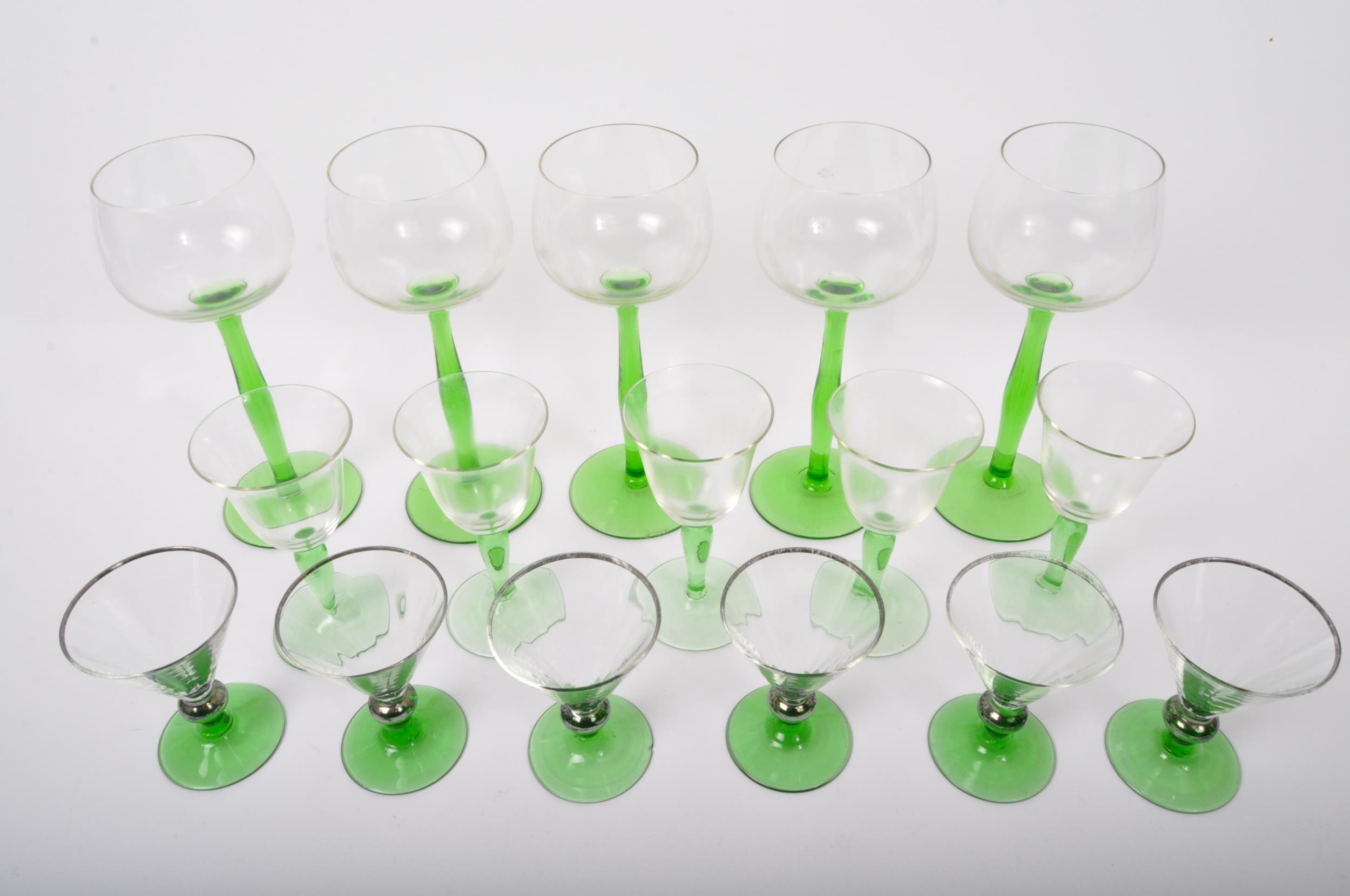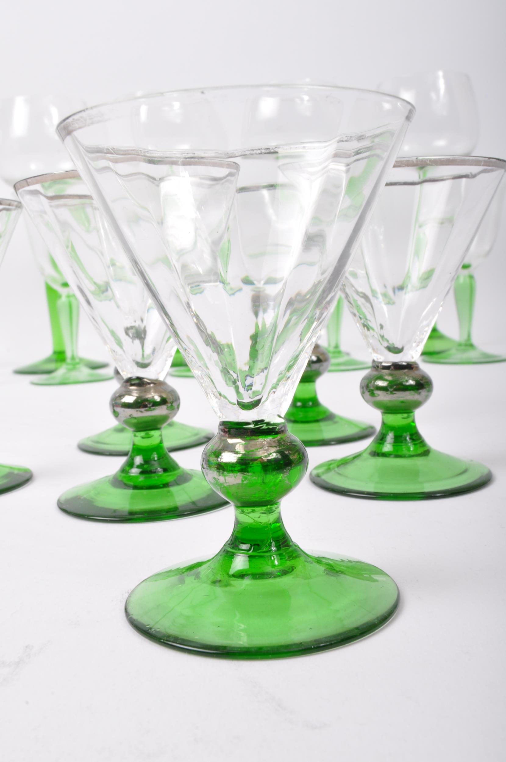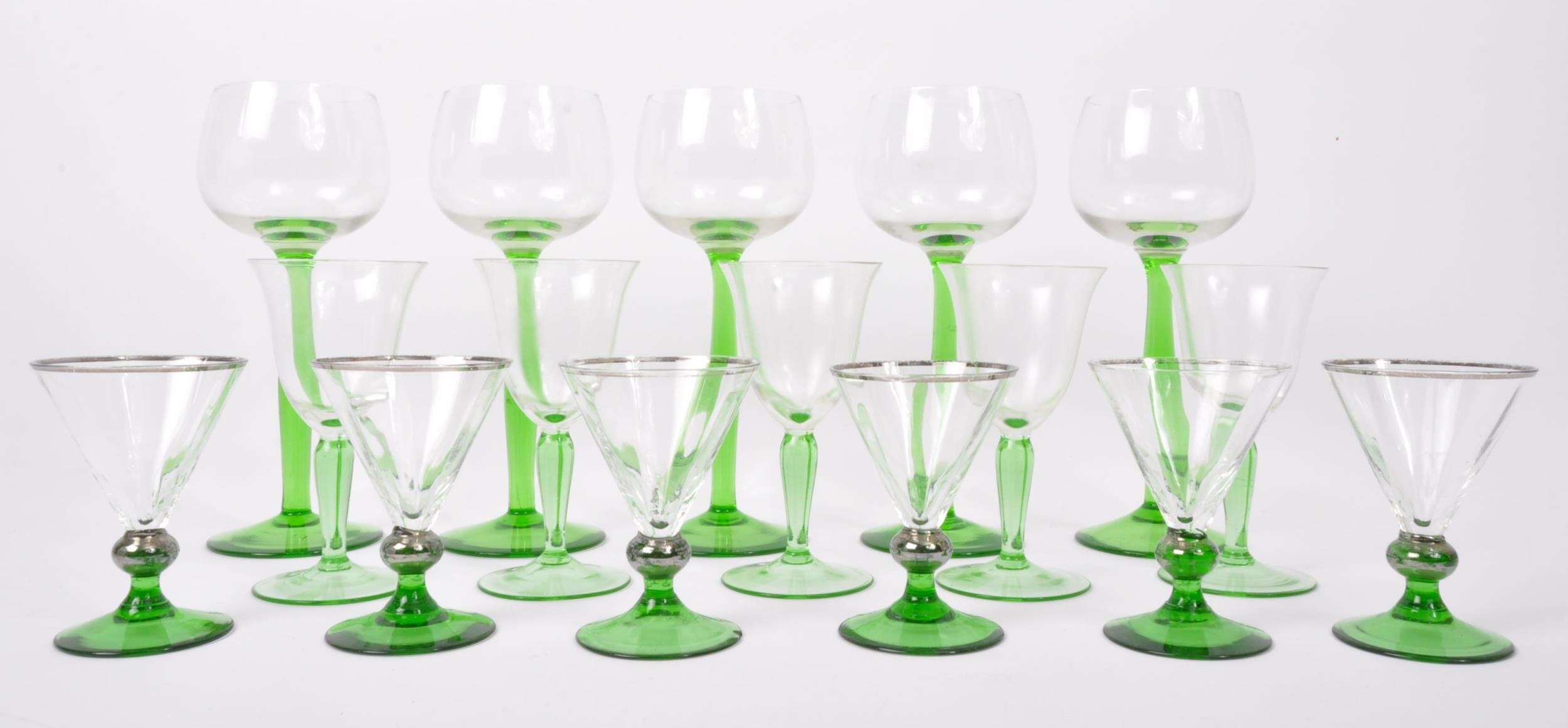 An assortment of vintage retro mid 20th century emerald and clear drinking glasses to include a set of Art Deco glasses of conical form with silvered rims. Measures 18cm tallest.