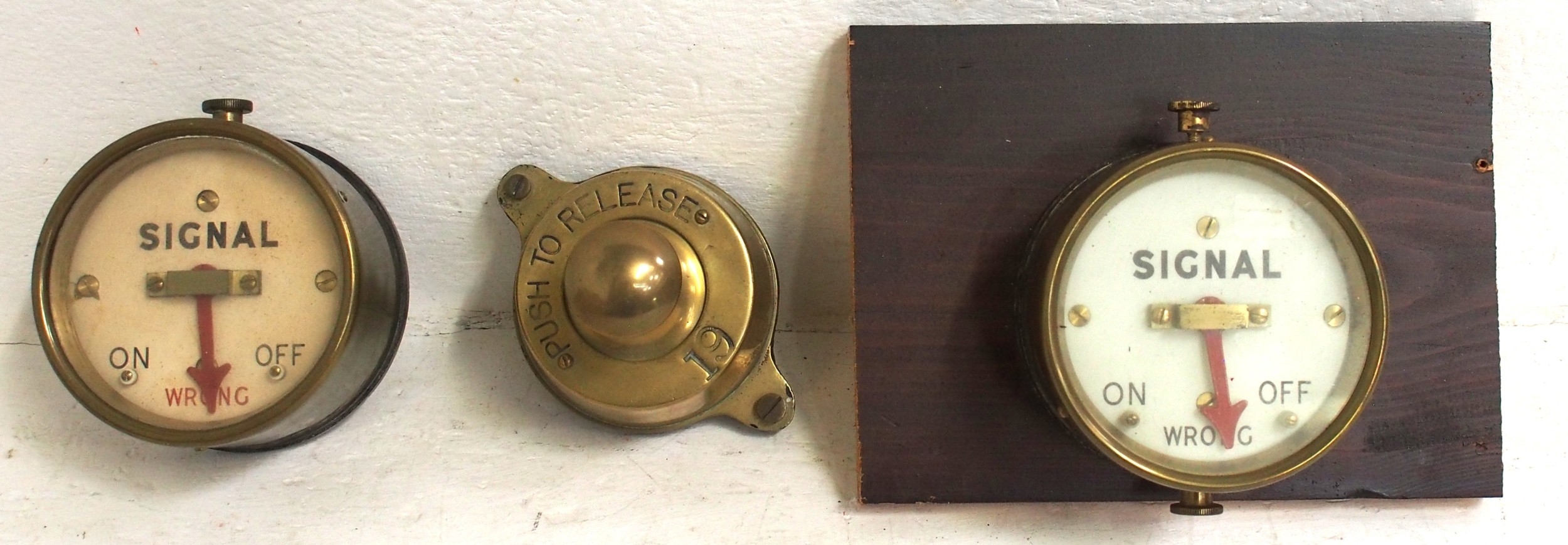 Southern Rly brass cased signal repeaters both in good condition, needles free moving, brass lever block shelf plunger with brass ring "PUSH TO RELEASE 19". (3) (B2X) (Dispatch by Mailboxes/Collect from Banbury Depot)