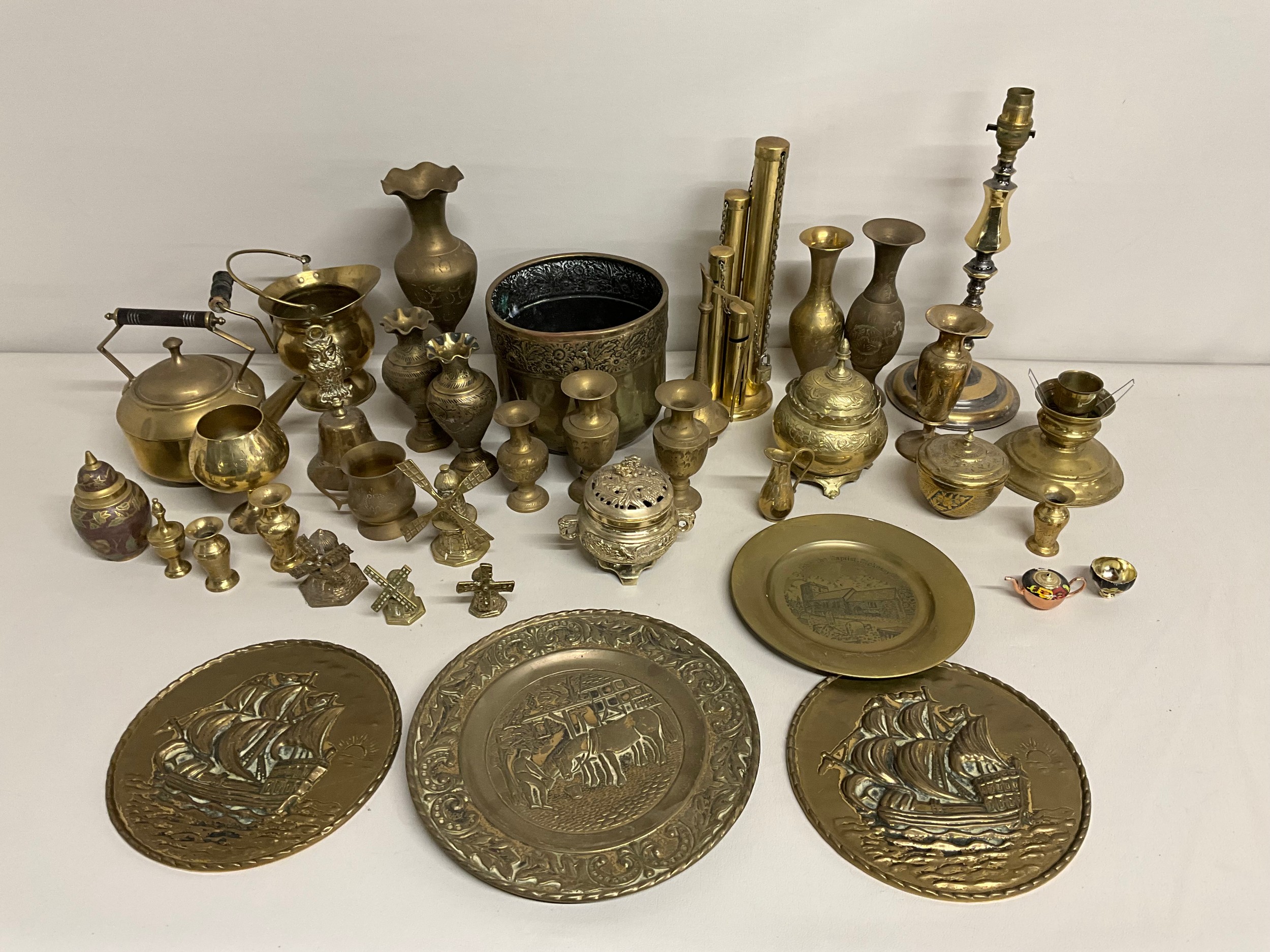 BOX OF BRASSWARE TO INCLUDE JARDINERE, VASES, KETTLE ETC