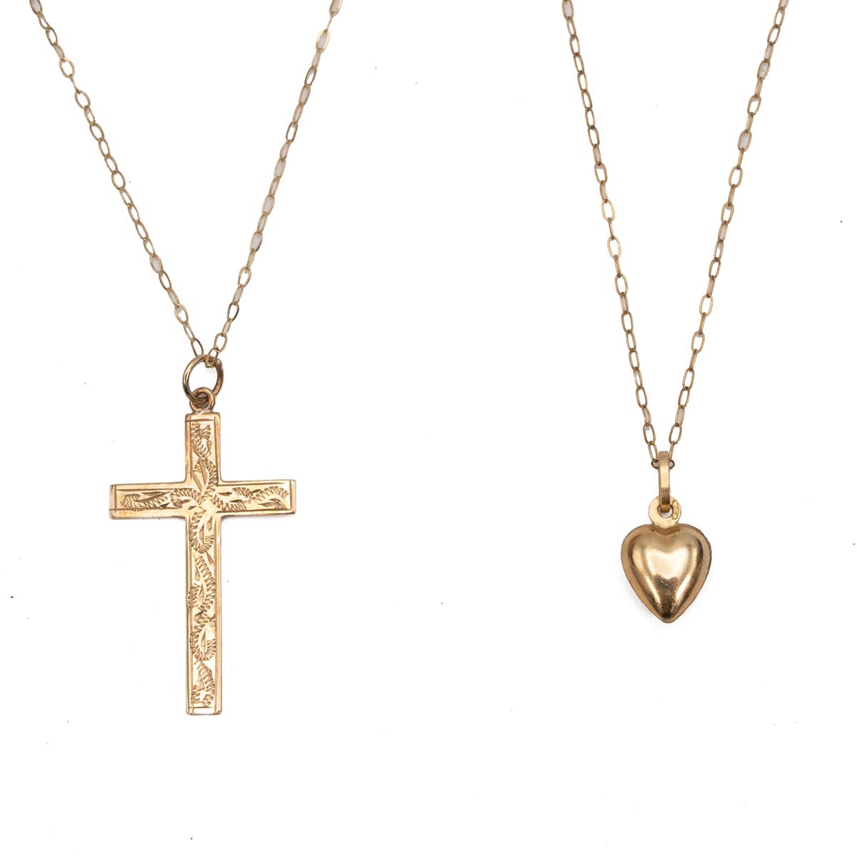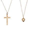 A 9ct gold cross and necklace and a 9ct gold necklace with a heart shaped pendant, L 42cm and 40cm, gross weight 1.65 grams.