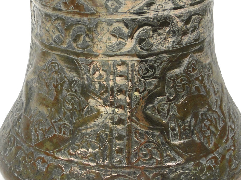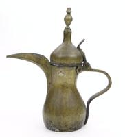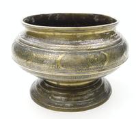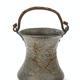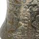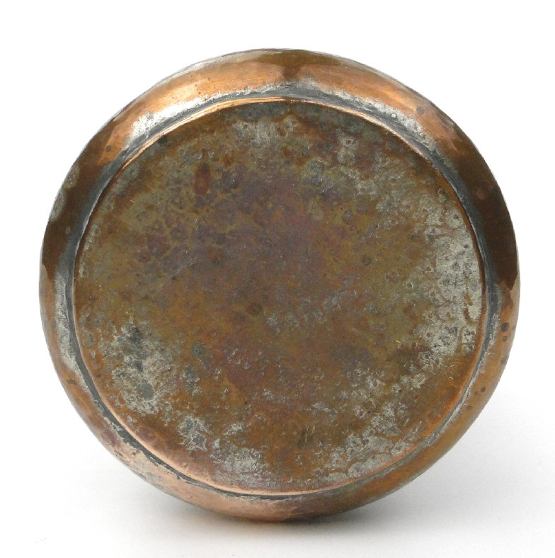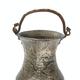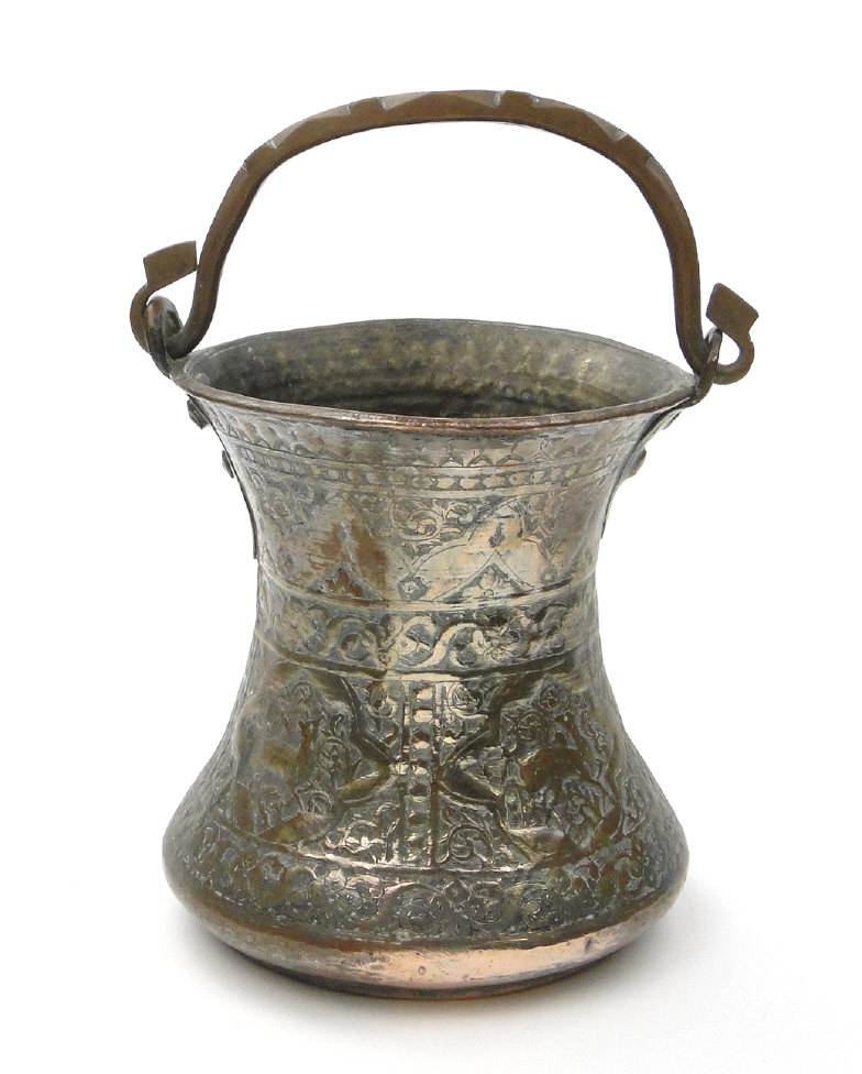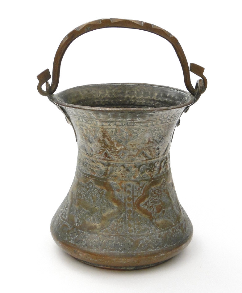 Middle Eastern copper pot with swing handle and embossed and silvered decoration, 23cm high