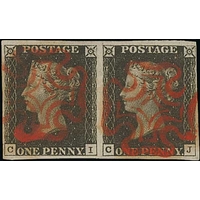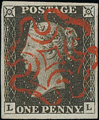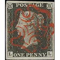 1840 1d Black, LL plate 1b used with a magnificent complete deep red Maltese Cross, very large even margins, an exceptional stamp. Photo on Page 12.