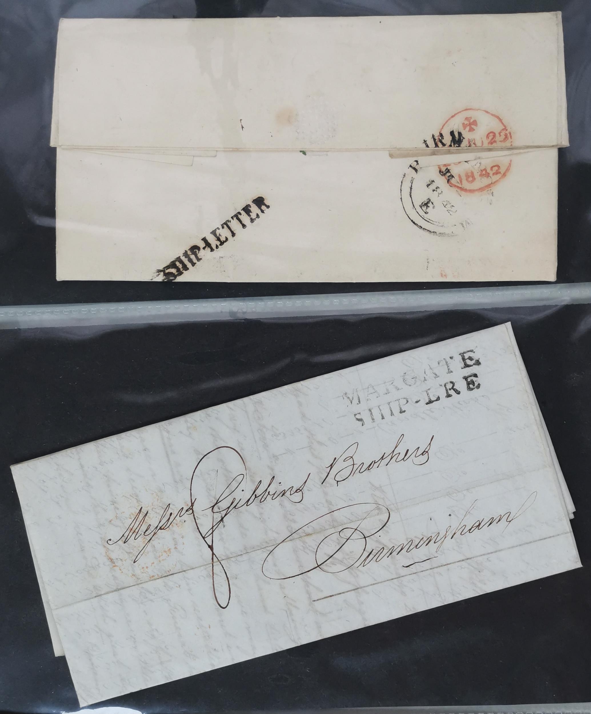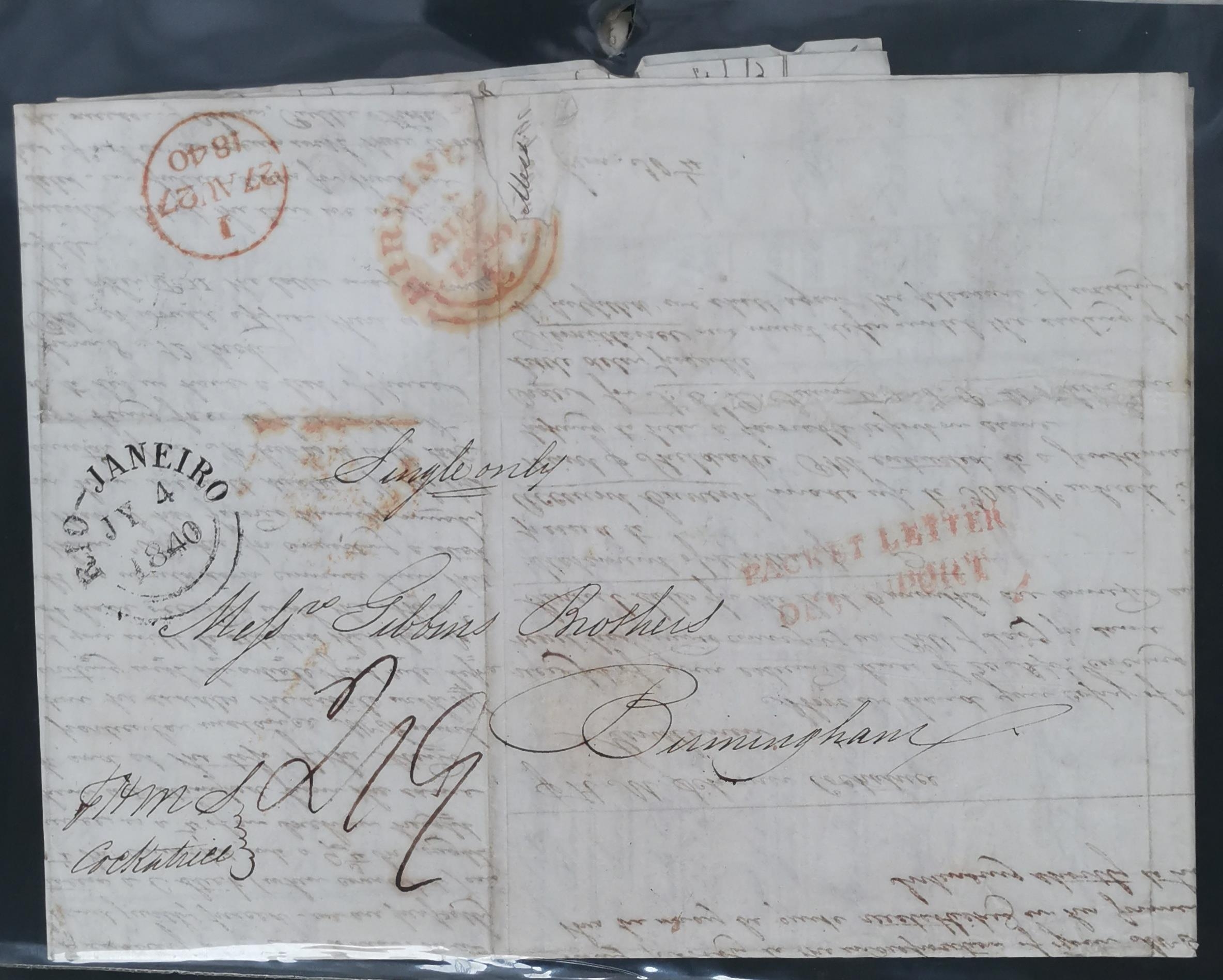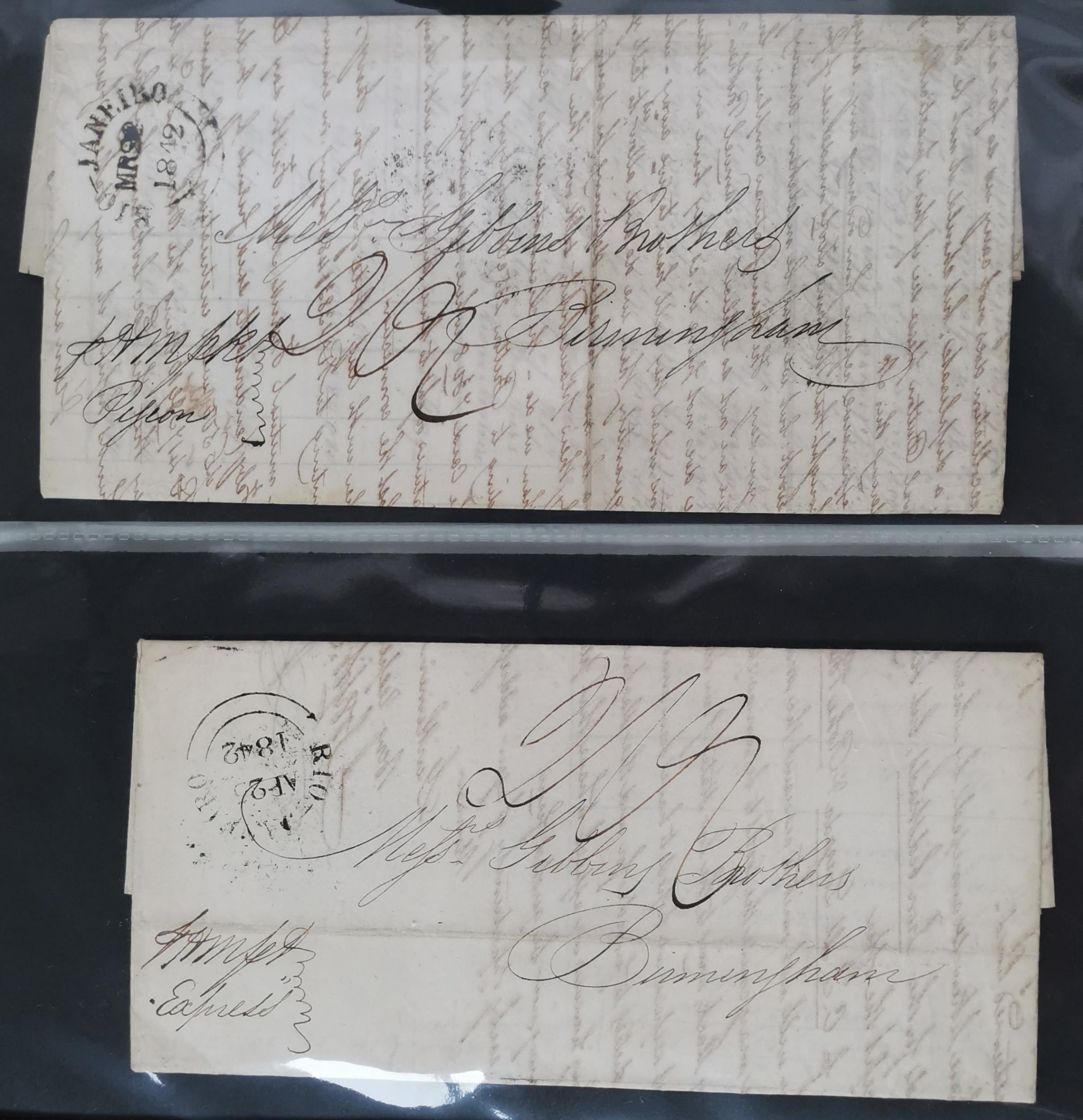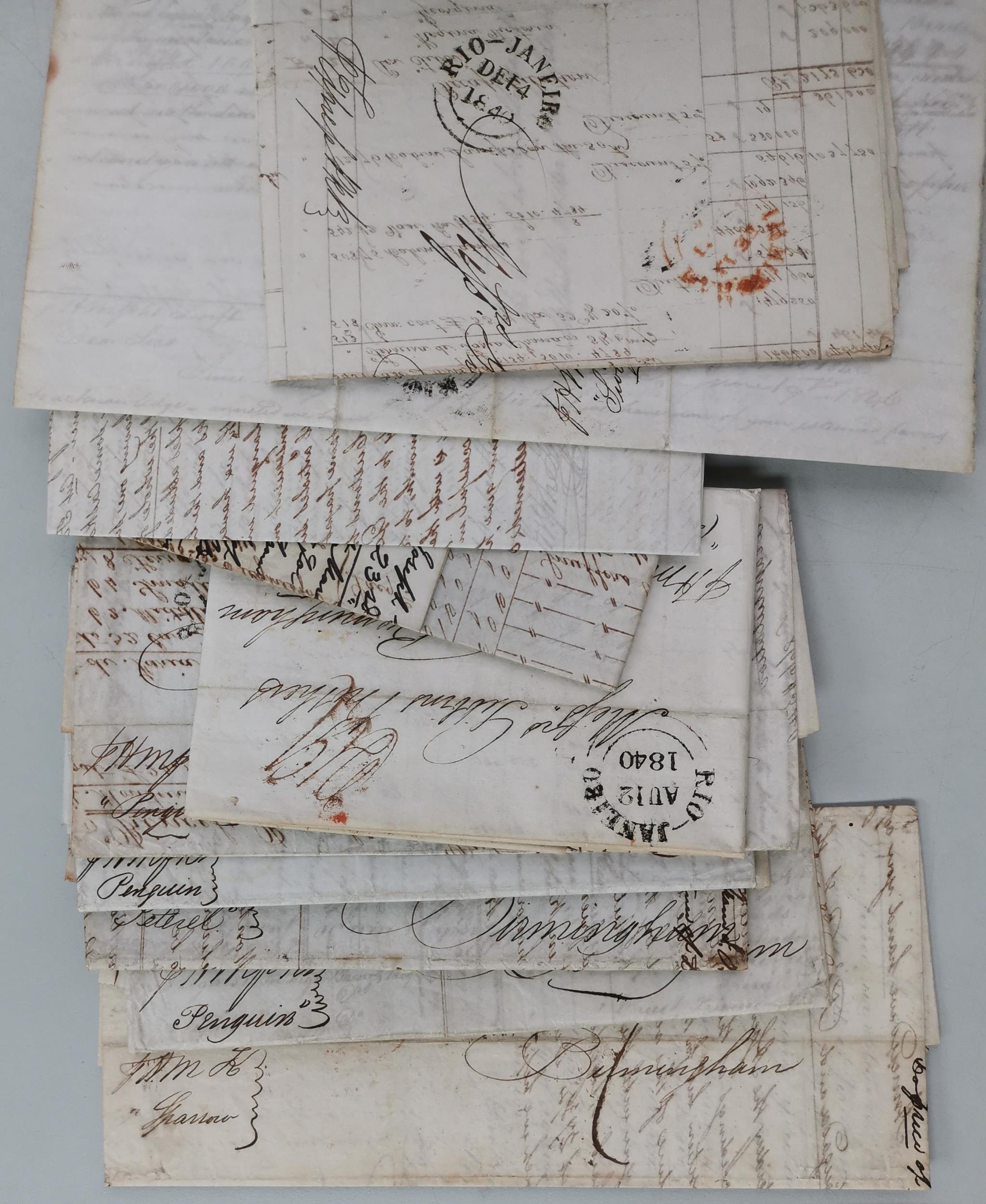 1840's x 17 covers from Rio de Janeiro to Gibbons Brothers Birmingham markings include "SHIP LETTER COWES" "MARGATE SHIP LRE" "PACKET LETTER DEVONPORT" "COVE SHIPLETTER" (in blue) and "SHIP LETTER". (17 covers)