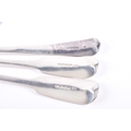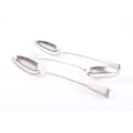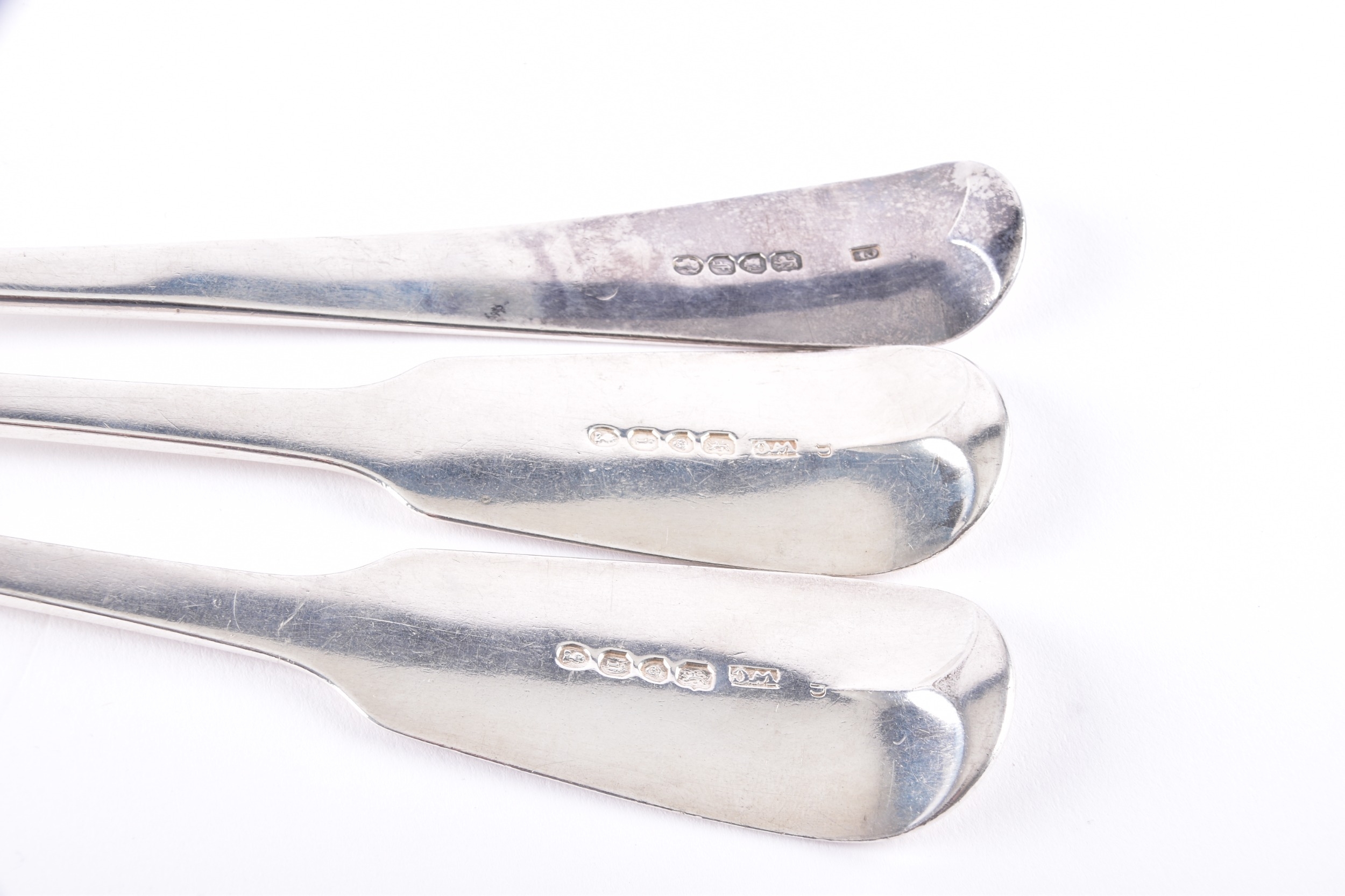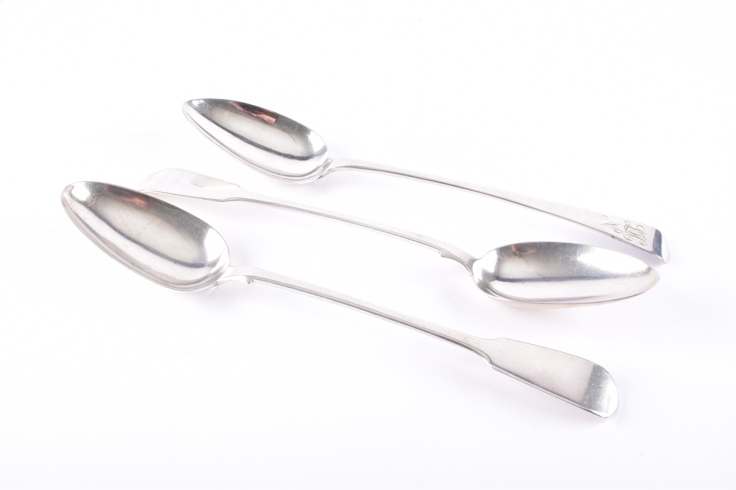 Three silver serving spoons, including a pair of George IV serving spoons hallmarked for London 1824 possibly by William Chawner II, fiddle pattern, 30.2 cm long, together with a Victorian single serving spoon hallmarked for London 1841 by Cornelius Bland, Old English pattern, 31 cm long. (3)