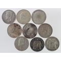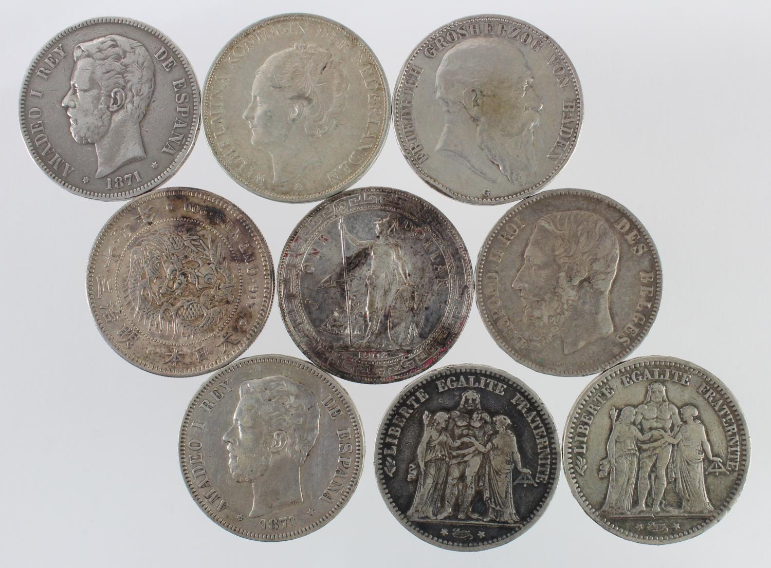 World Silver Crown-size (9) 1870s - 1930s, includes Japan Yen & GB Trade Dollar. Mixed grades some with patchy toning