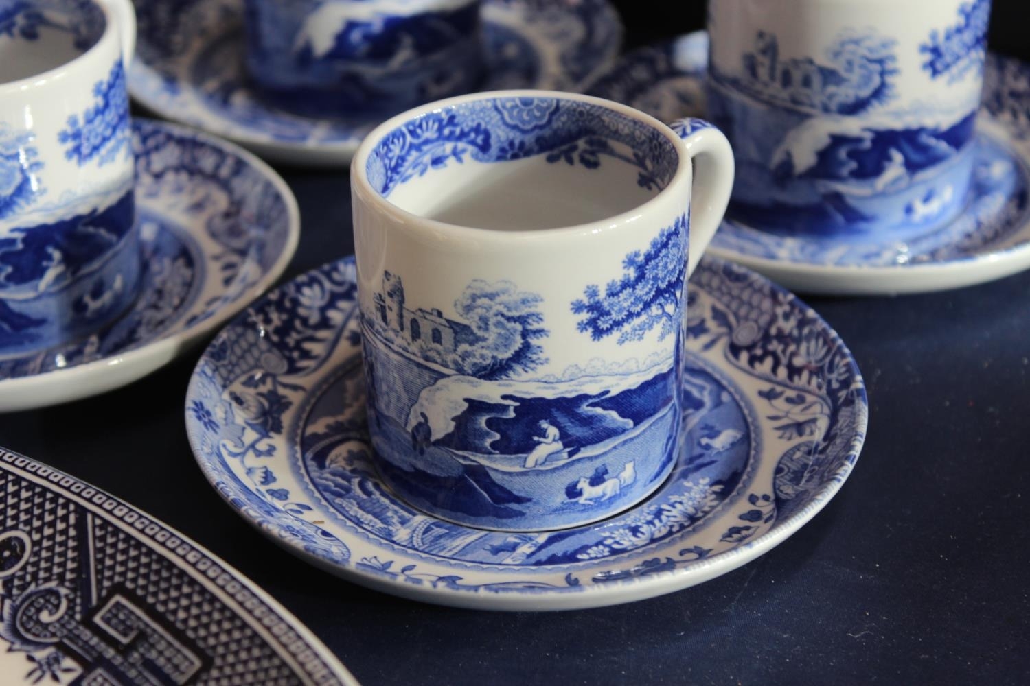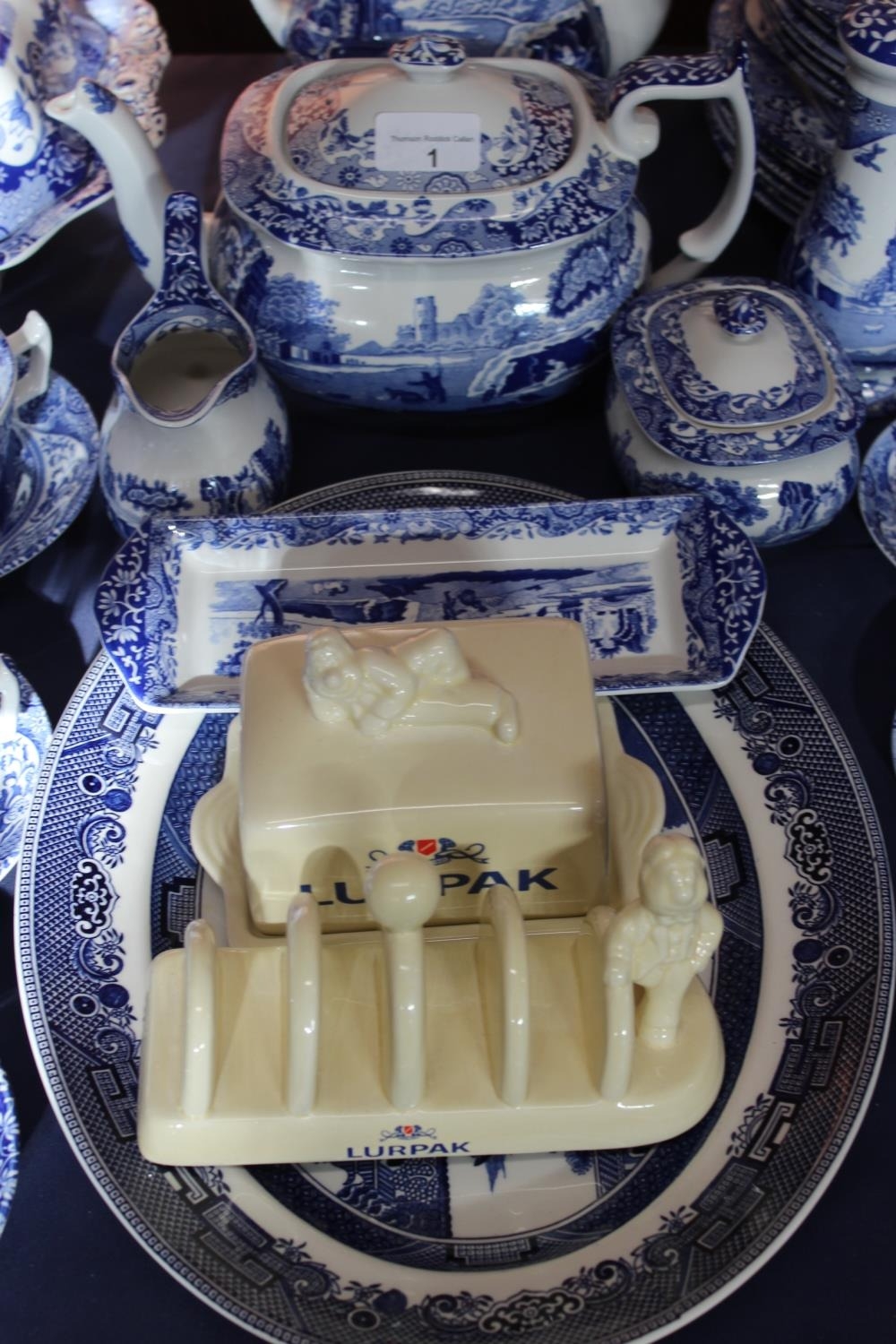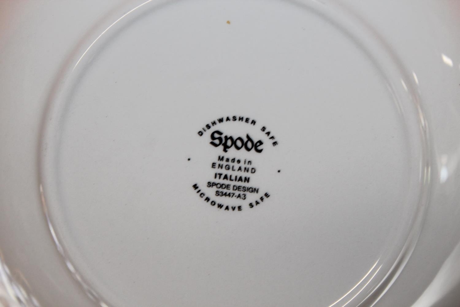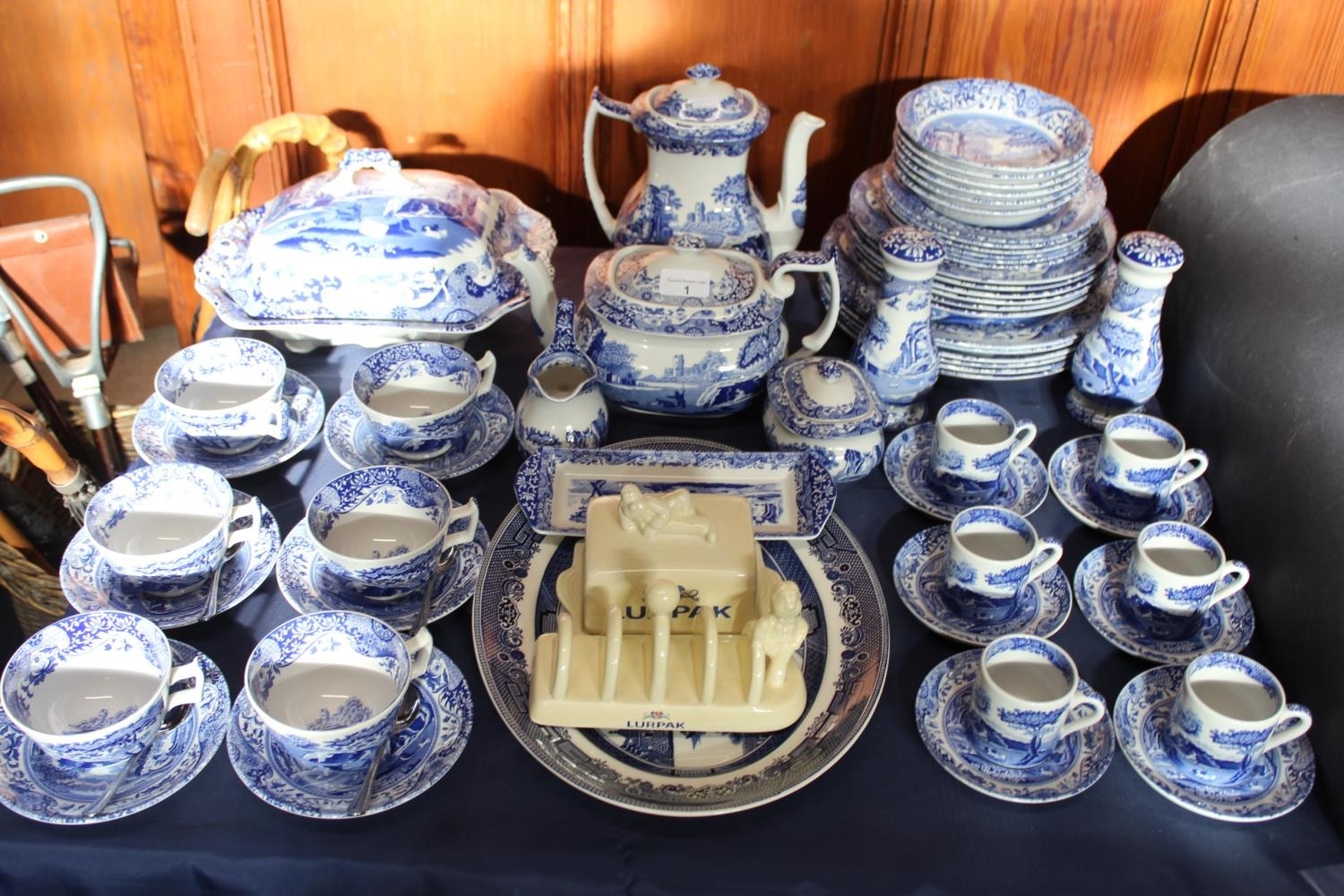 Spode Italian pattern dinner, tea and coffee set to include tureen, coffee pot, tea pot, dinner plates, sugar and cream, coffee cans and saucers, tea cups and saucers, dinner plates etc. also a Lurpack toast rack and butter dish.