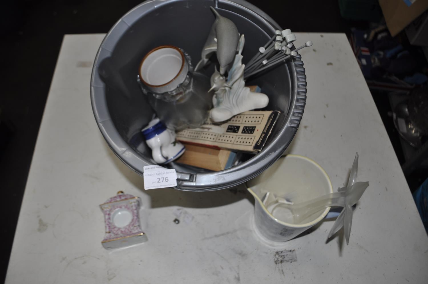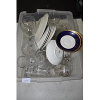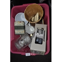PLASTIC BUCKET OF GLASSWARE AND CERAMIC JUGS AND VASES