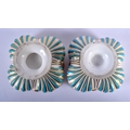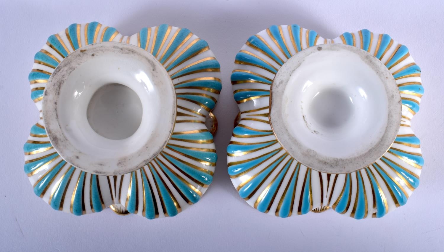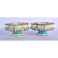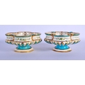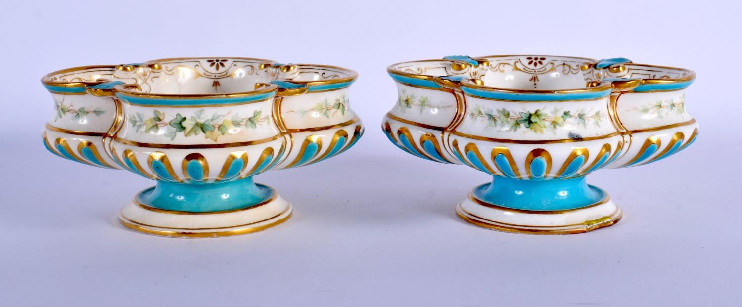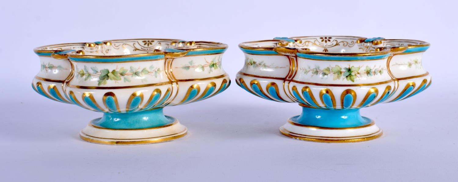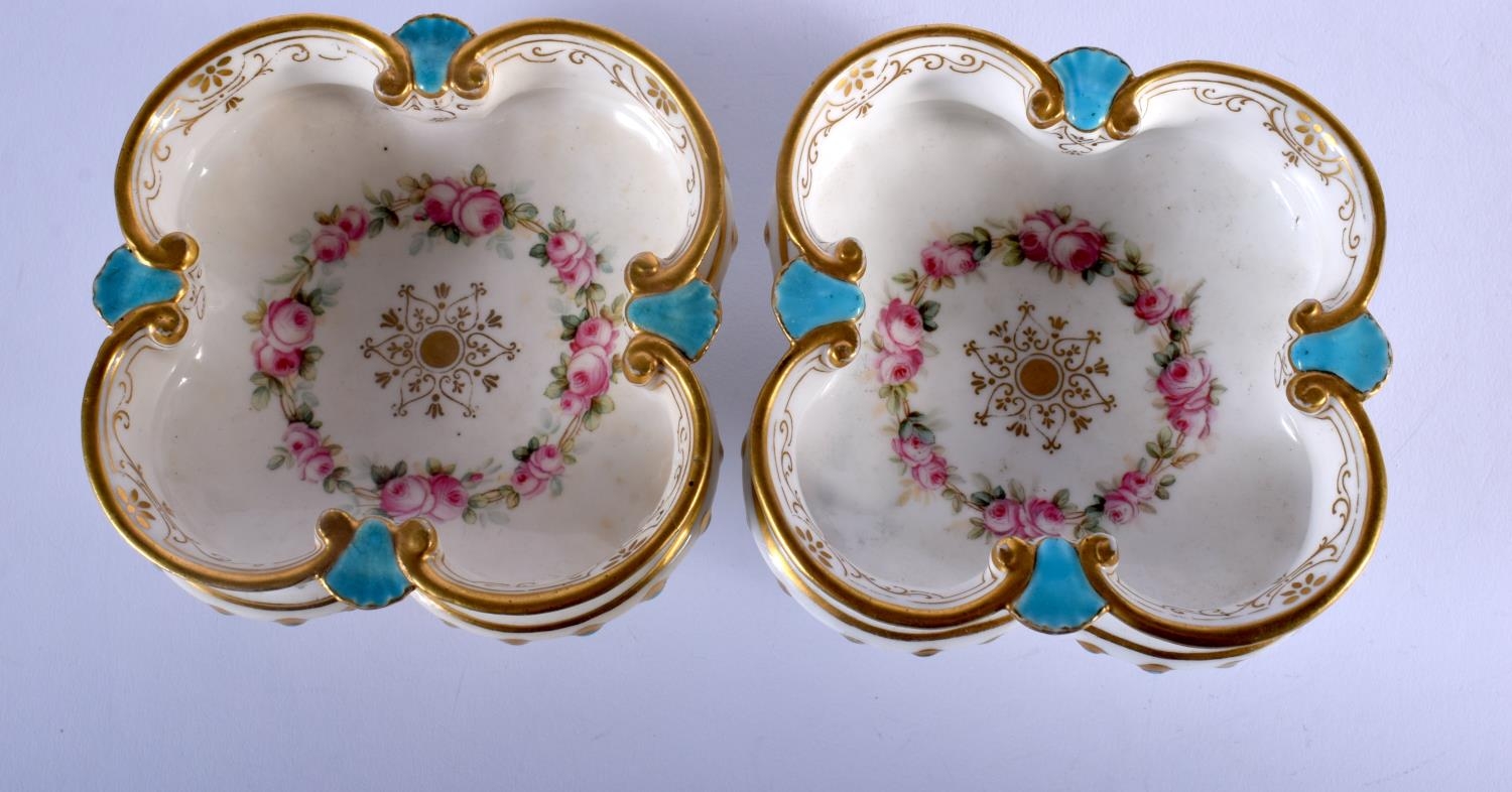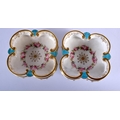 19TH C. MINTON PAIR OF QUADRILOBE PEDESTAL DISHES PAINTED WITH ROSES HIGHLIGHTED IN TURQUOISE.5.5cm high (Pr)