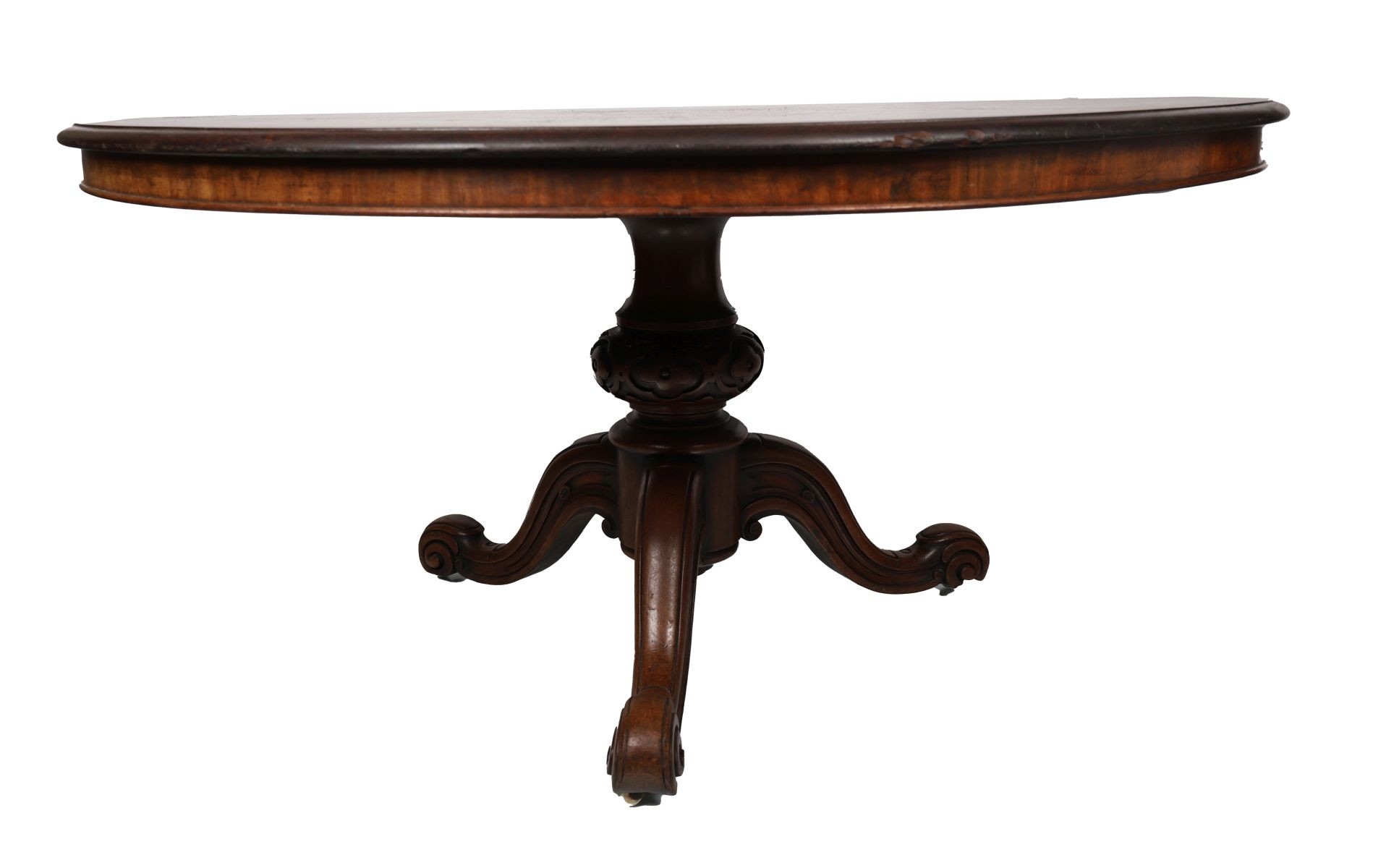 Mid-19th century. The well-figured circular top on a substantial turned baluster column and quadruple scroll supports with recessed castors. FURNITURE Tuesday 25th November 2025 11:11:30