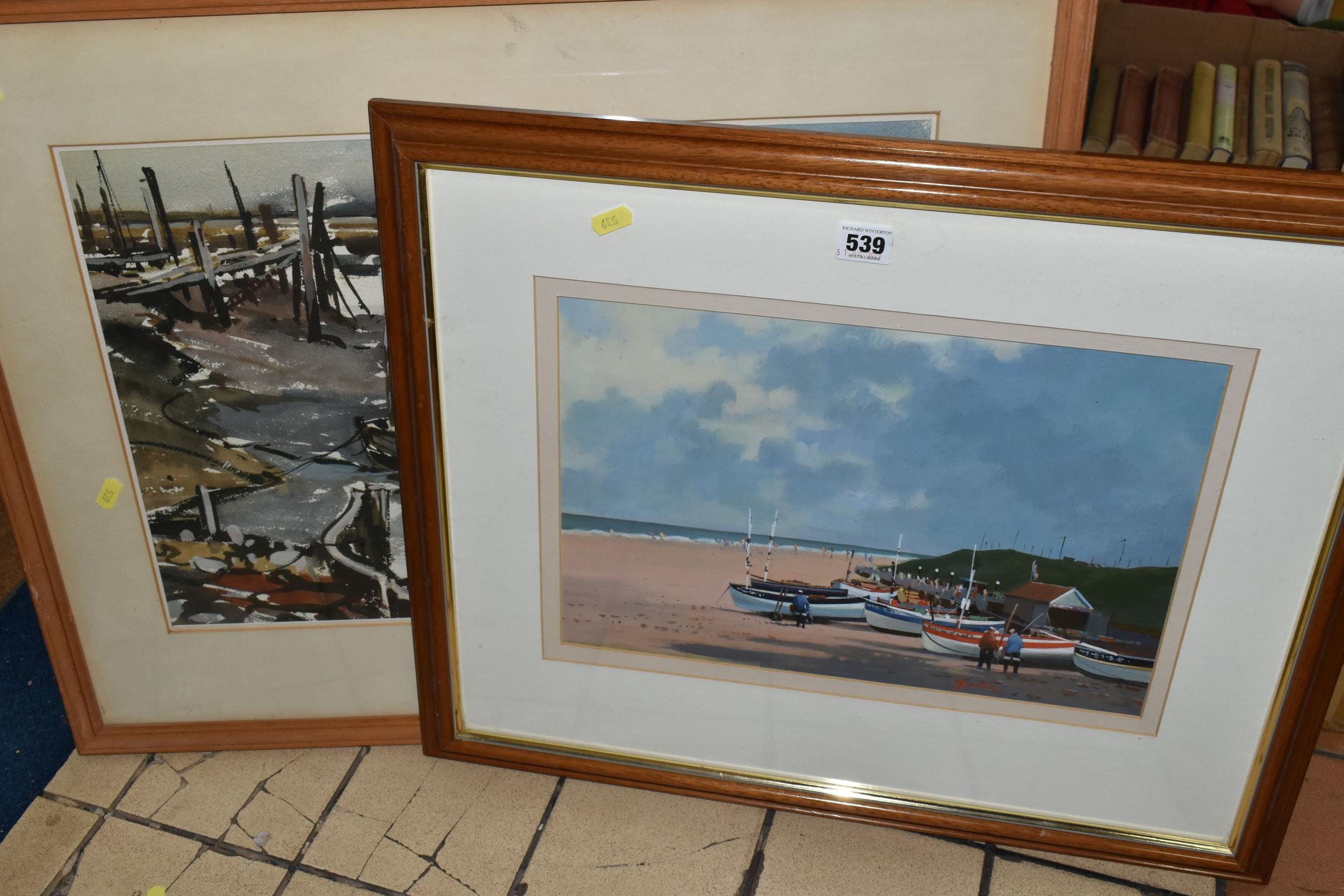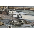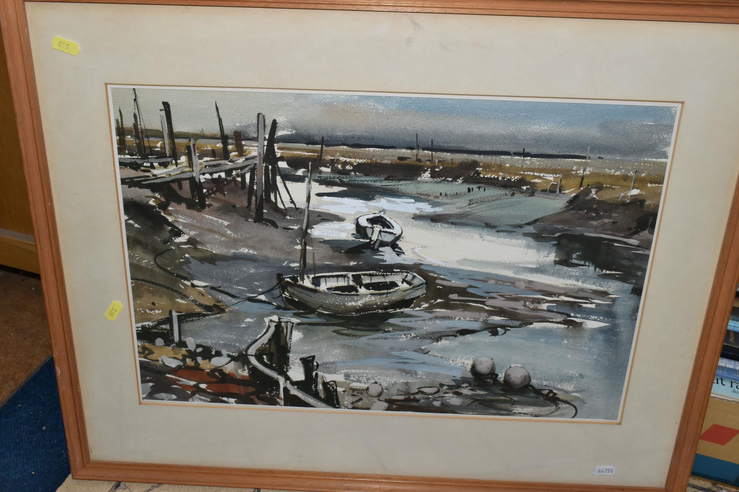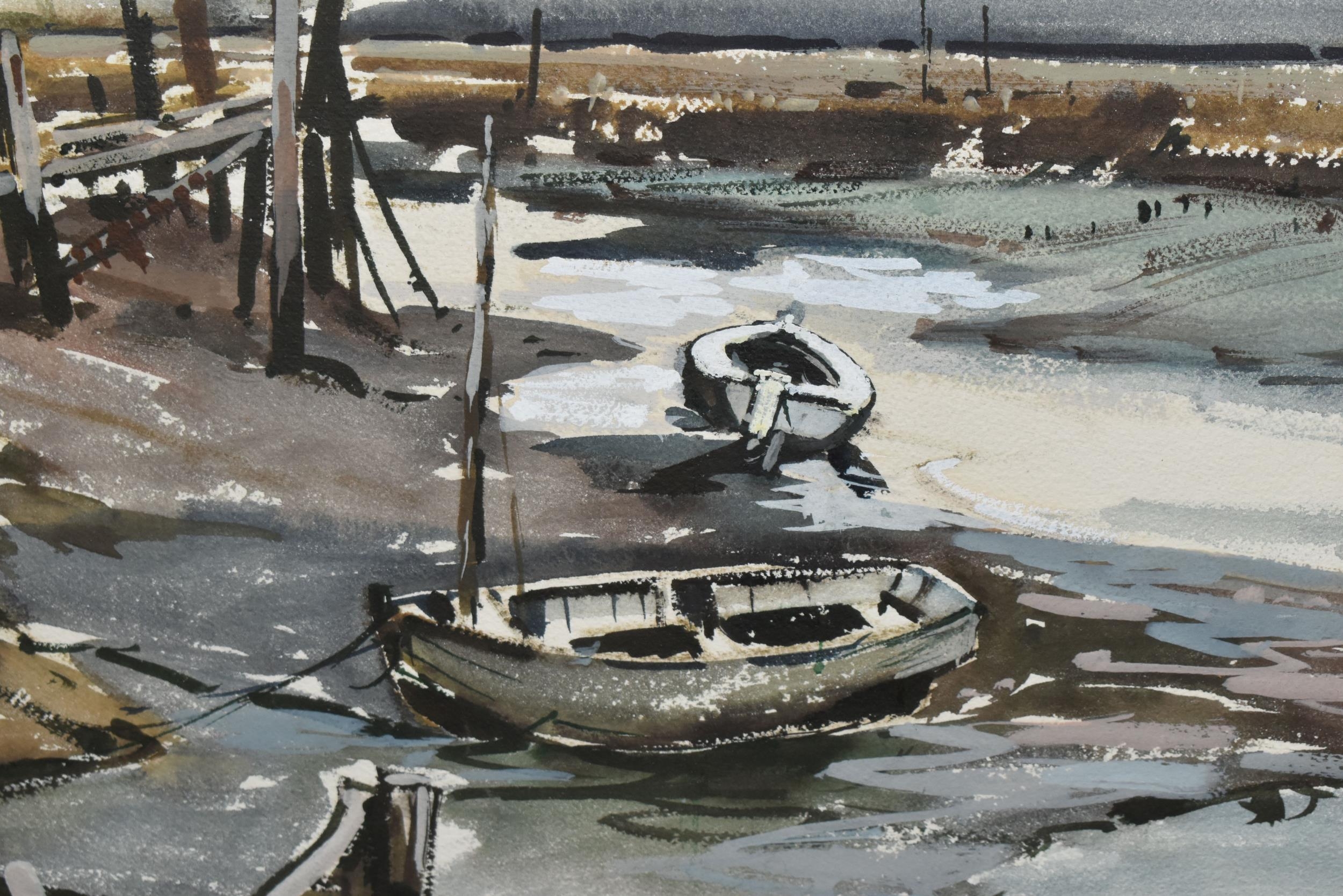 TWO COASTAL LANDSCAPE PICTURES, comprising Micheal J. Coates (British 1937-2018) 'Crab Boats, Cromer' depicting boats on the shore at low tide, signed bottom right, titled verso, watercolour / gouache on paper, approximate size 26cm x 39cm, together with Donald Bosher (British 1912-1977) boats in an estuary at low tide, watercolour on paper, approximate size 35cm x 53cm (2)