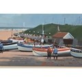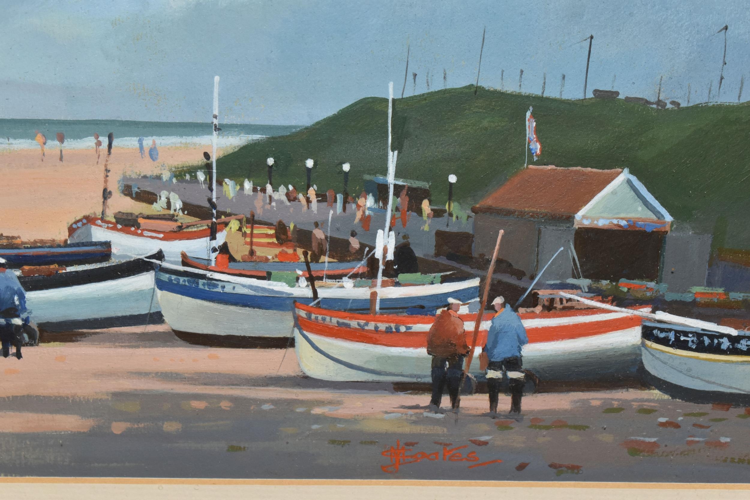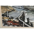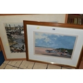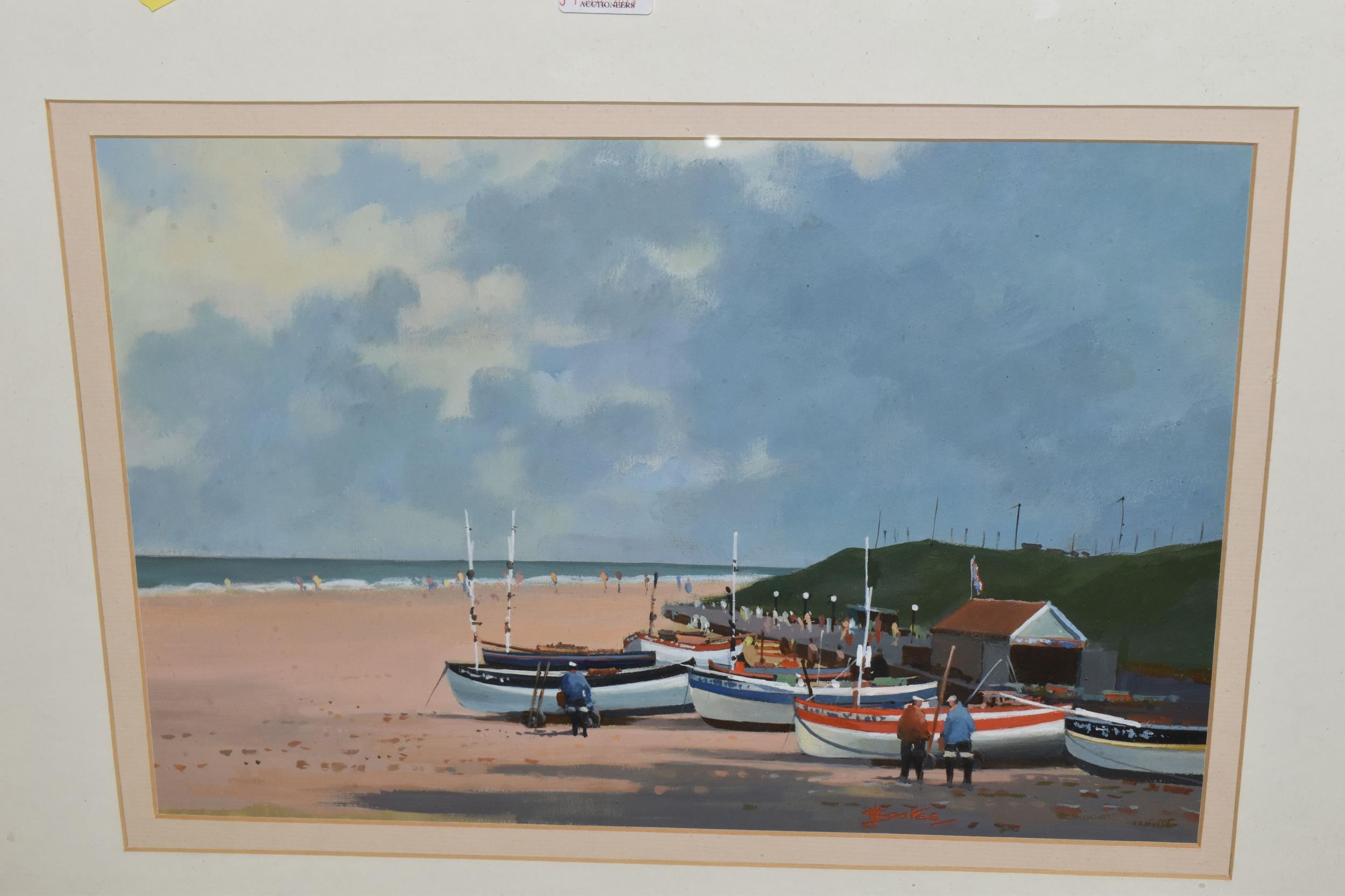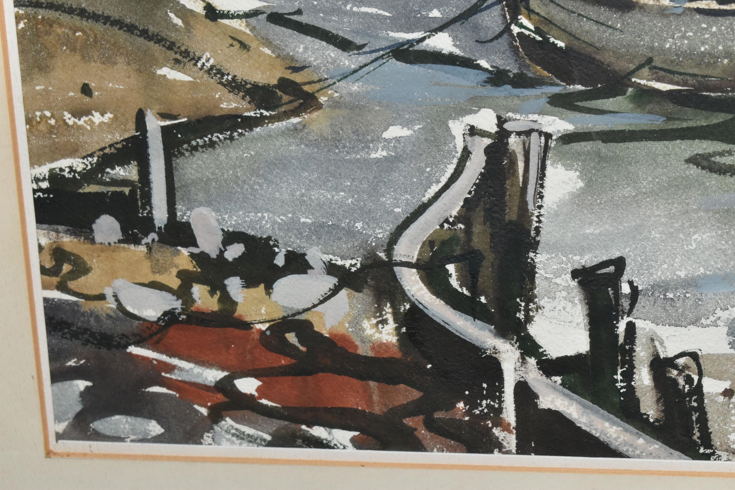 TWO COASTAL LANDSCAPE PICTURES, comprising Micheal J. Coates (British 1937-2018) 'Crab Boats, Cromer' depicting boats on the shore at low tide, signed bottom right, titled verso, watercolour / gouache on paper, approximate size 26cm x 39cm, together with Donald Bosher (British 1912-1977) boats in an estuary at low tide, watercolour on paper, approximate size 35cm x 53cm (2)