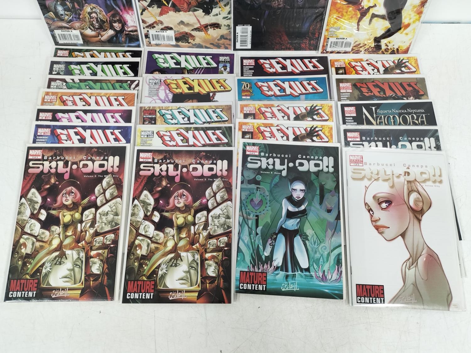 Marvel Comics to include 2008 Sky Doll (5), Namora 2010 No1 Variant Edition plus 2008 New Exiles Nos 1, 2, 3, 4x3, 5, 6, 7, 8, 9, 10, 11, 13, 14, 15, 16, 17. Bagged and Boarded