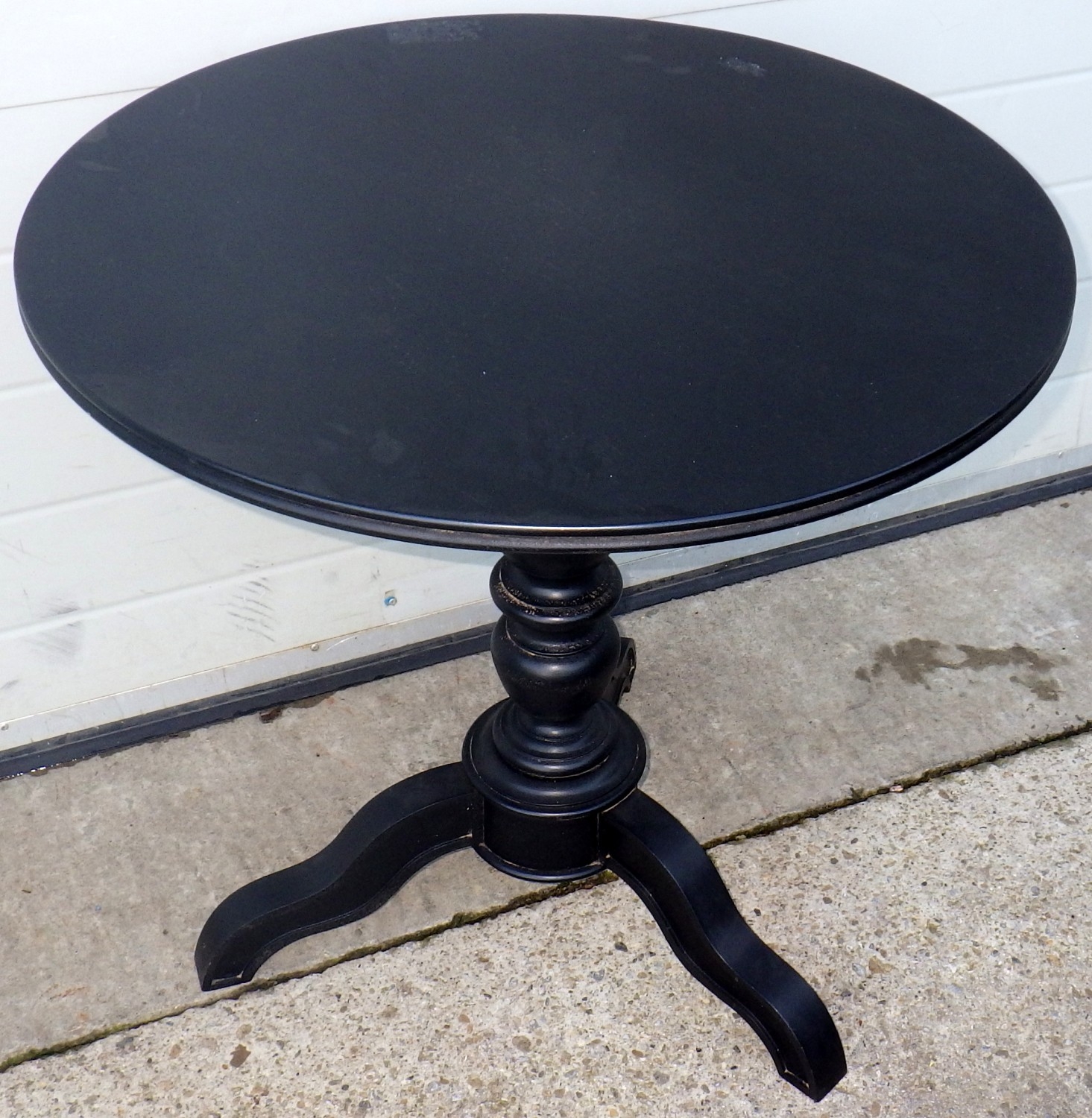 A stained black circular tri-pod table, 70cm across