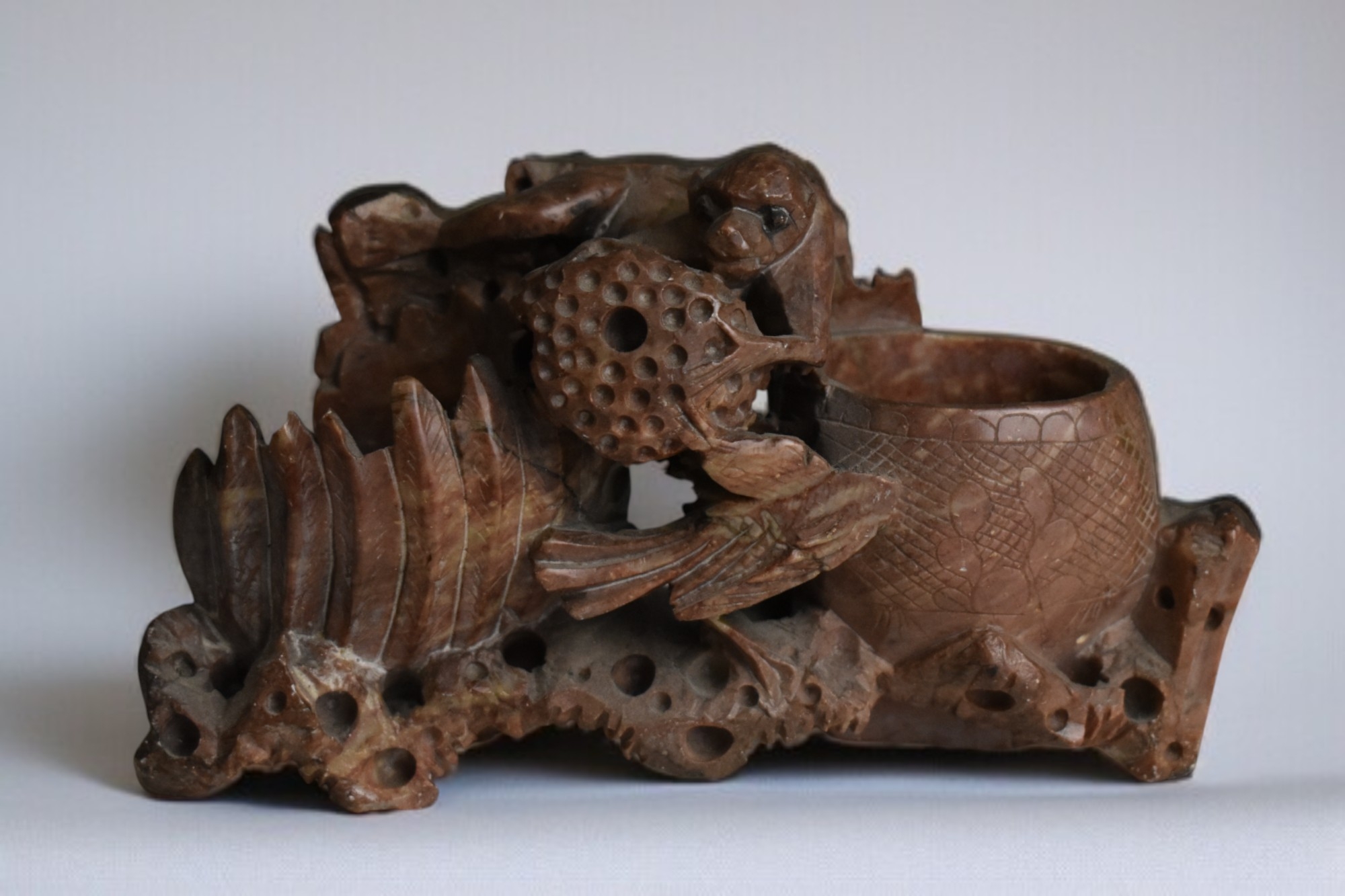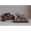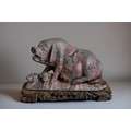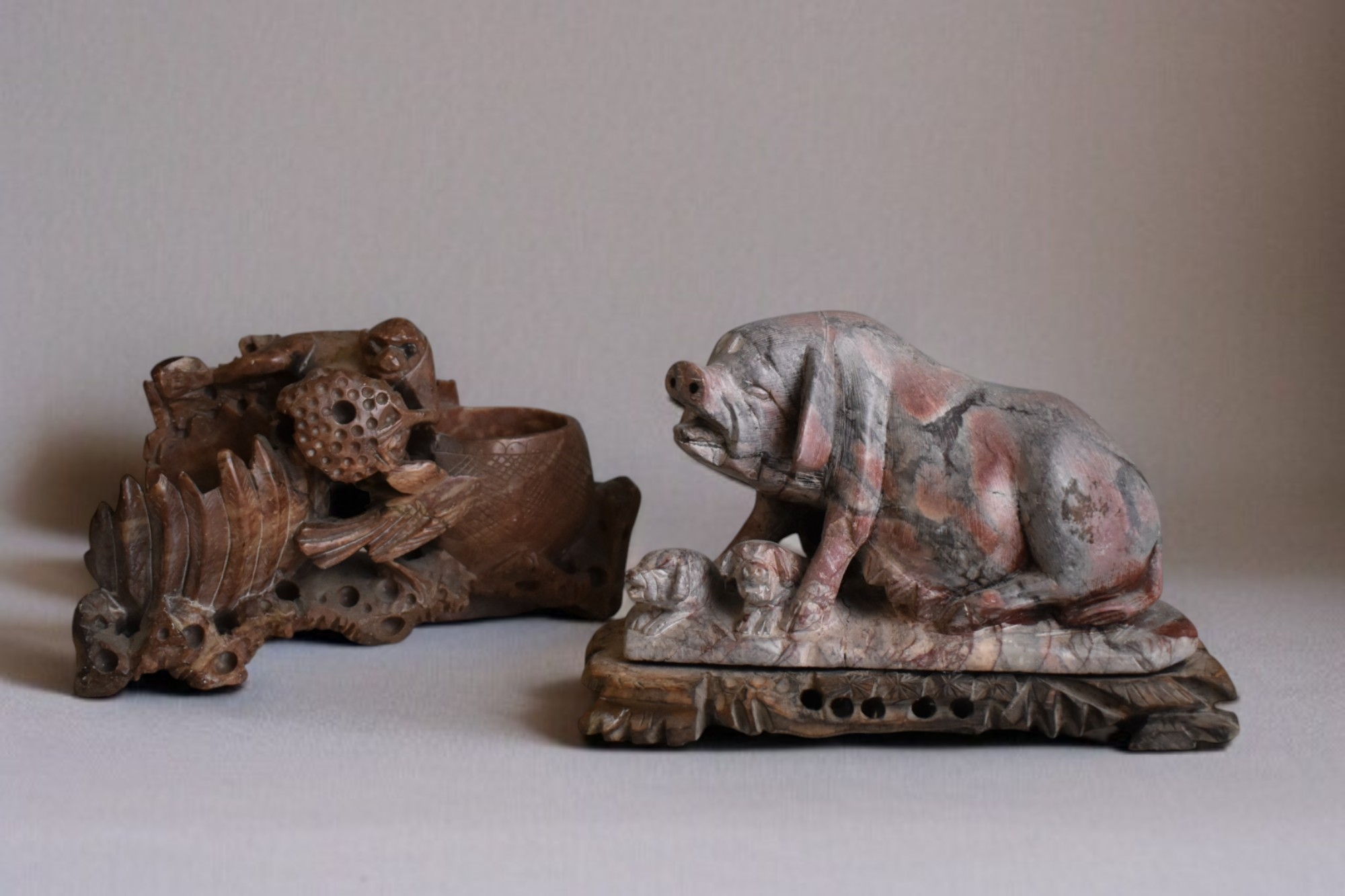 A Chinese carved soapstone figure of a Sow and piglets. On wooden base. 1st half 20th century. Together with a carved soapstone brush washer.