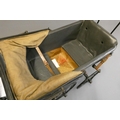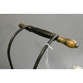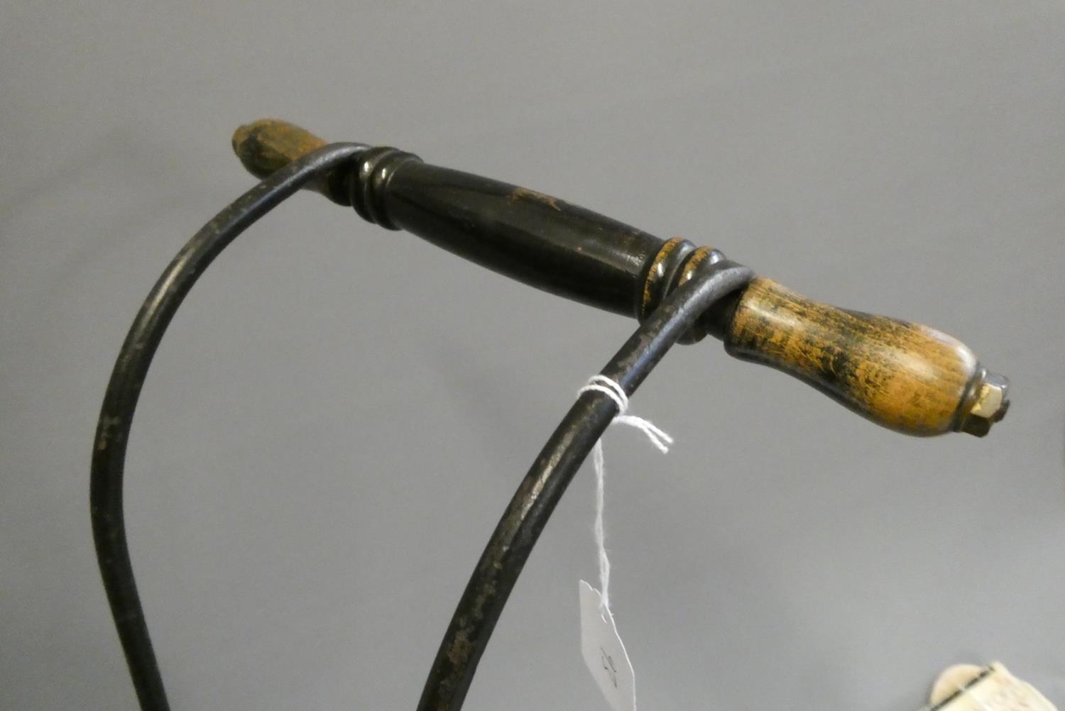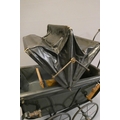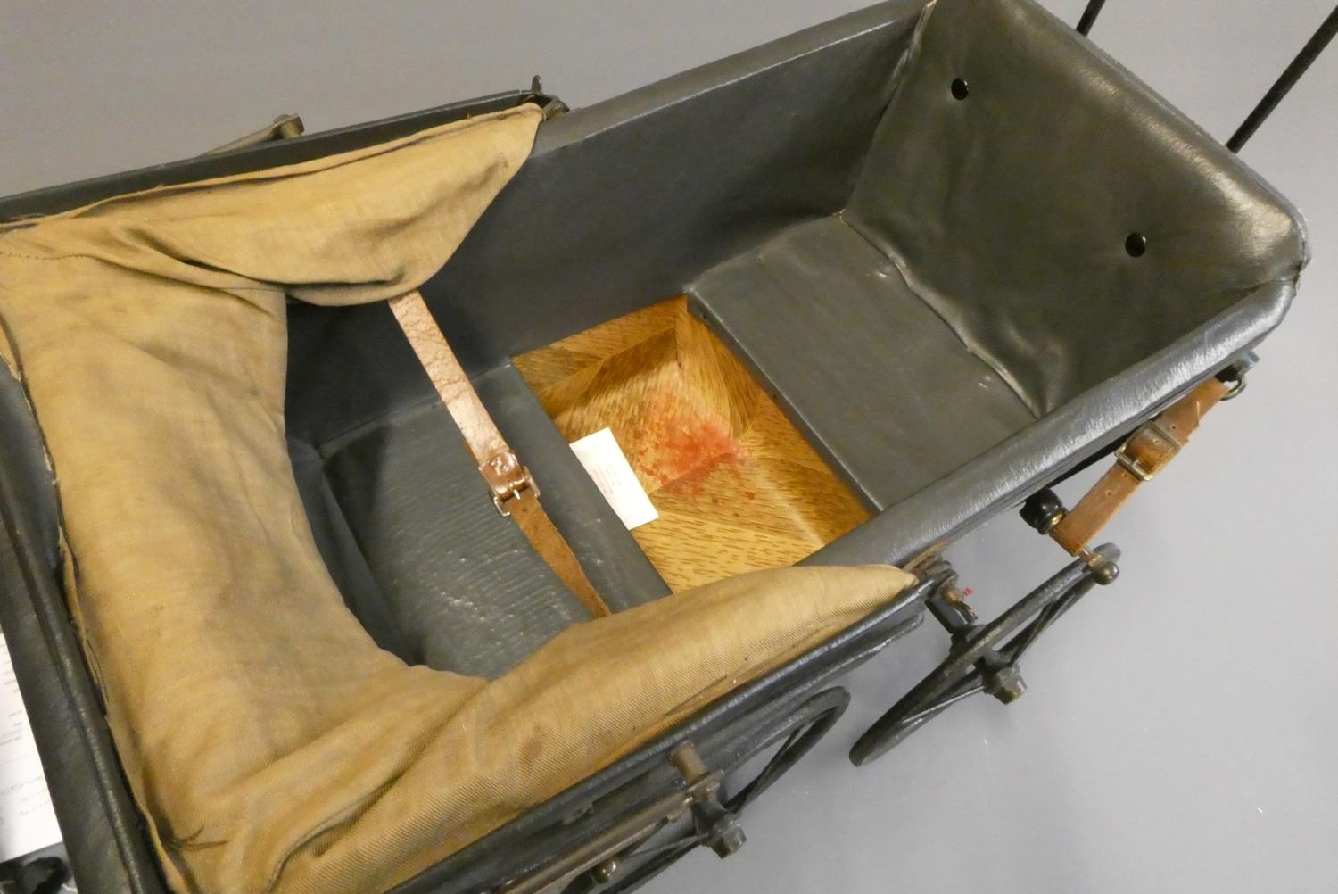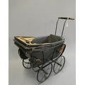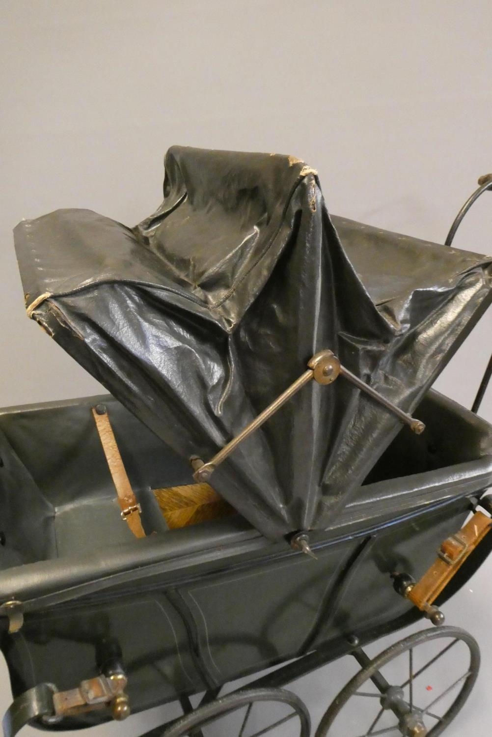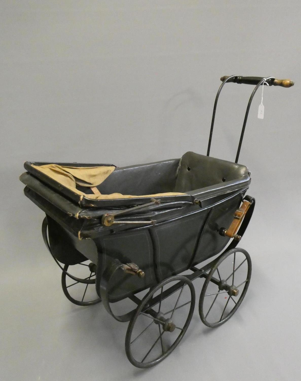 A late Victorian dolls twin pram, with leatherette hood, sprung base suspended on leather straps and turned wood grip on metal arms, approx. 31" long