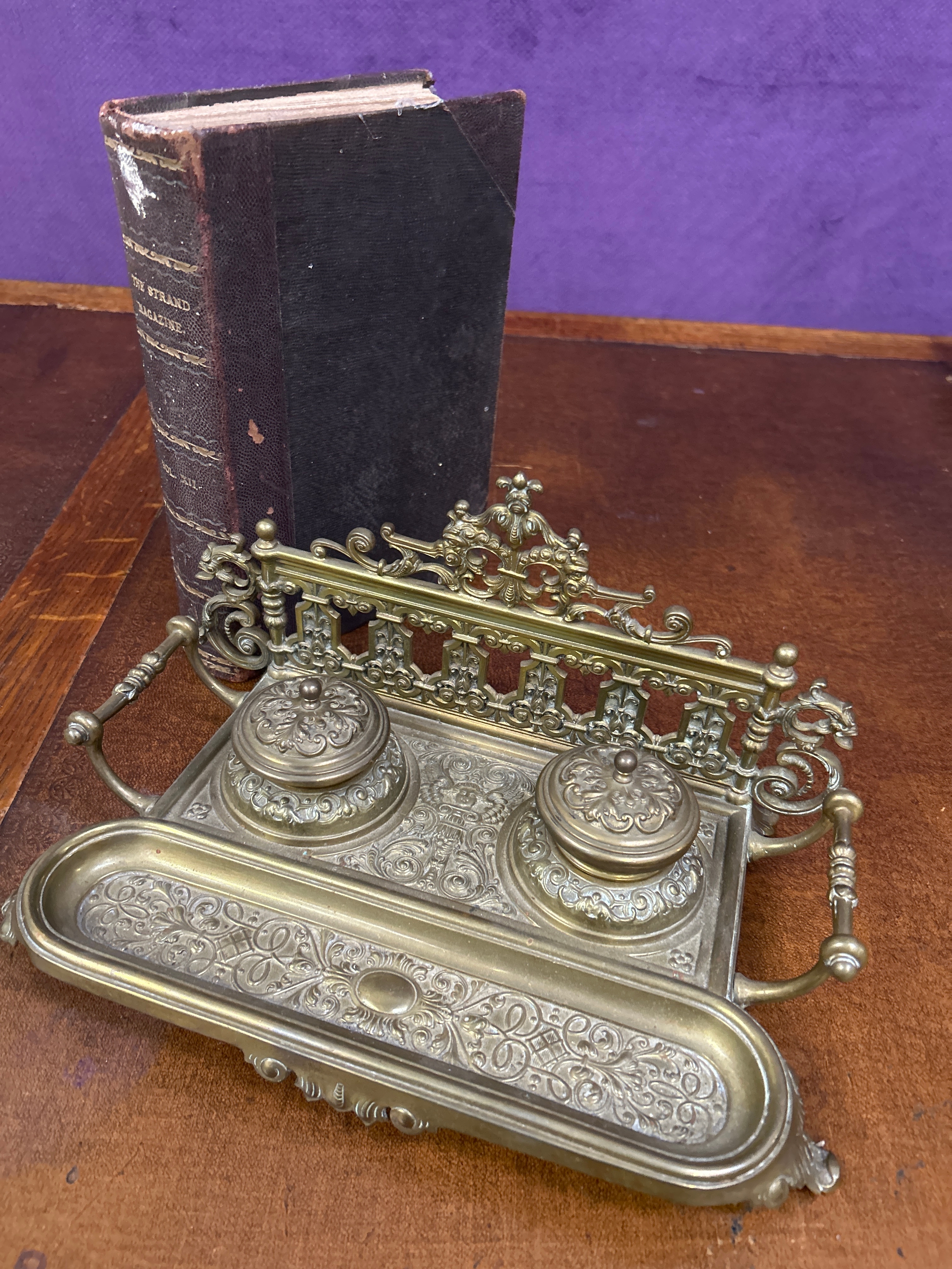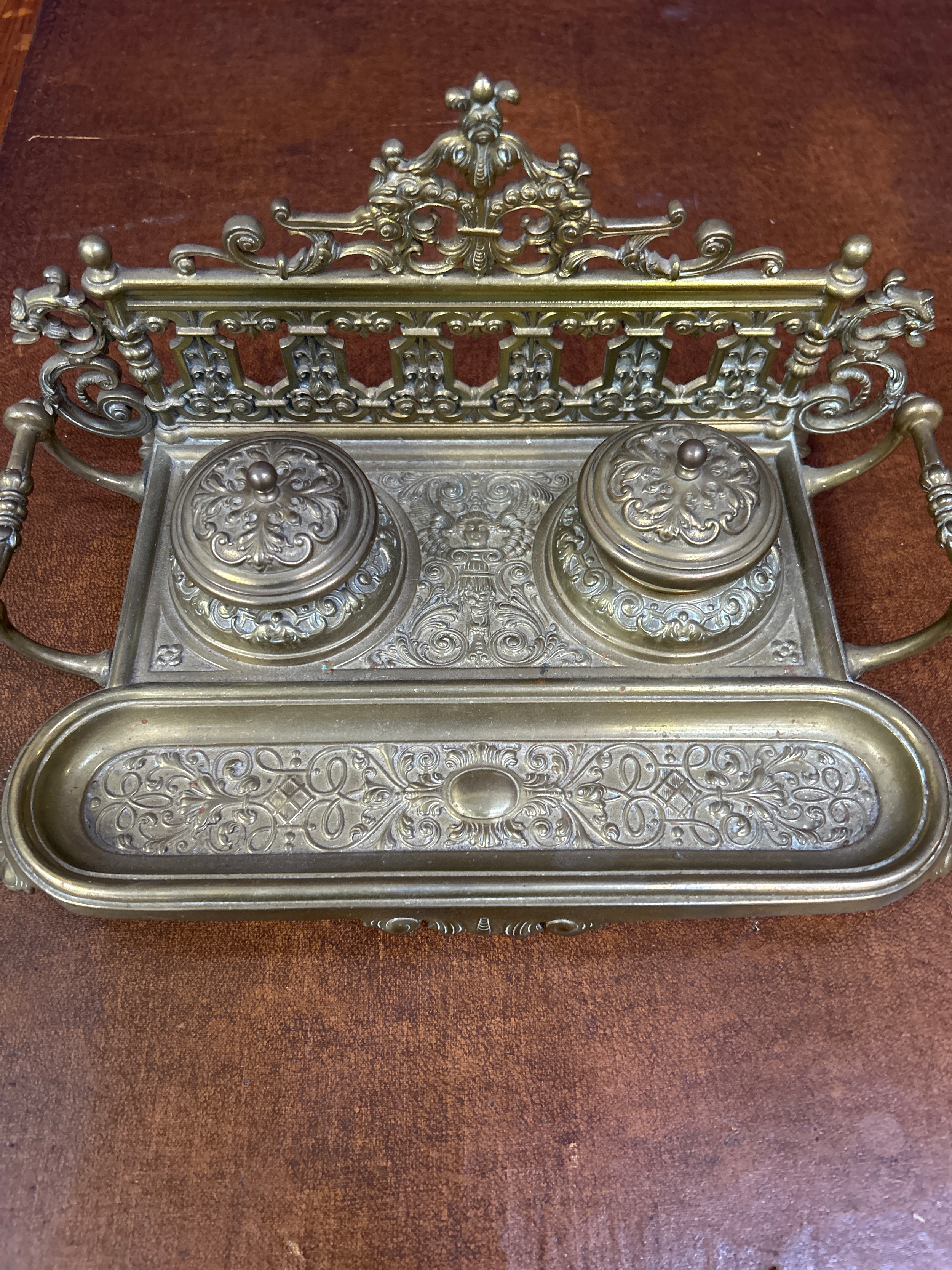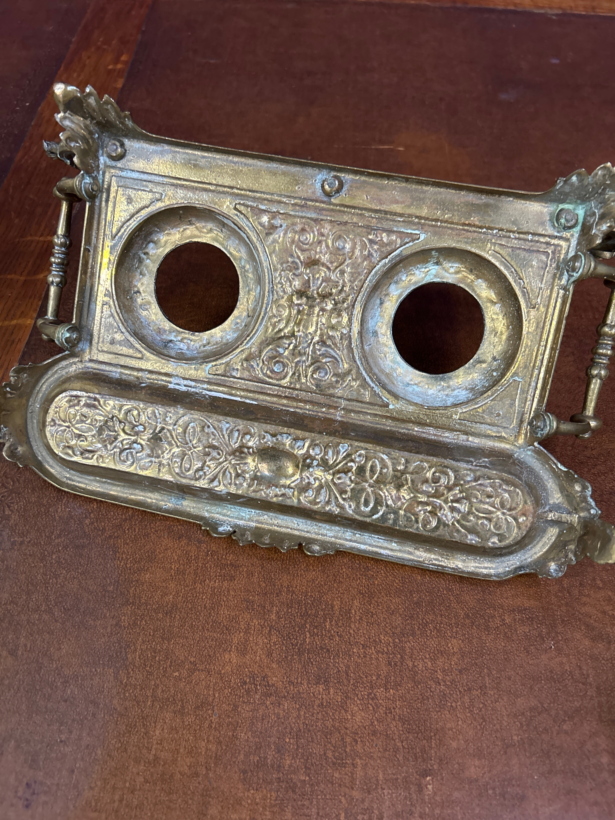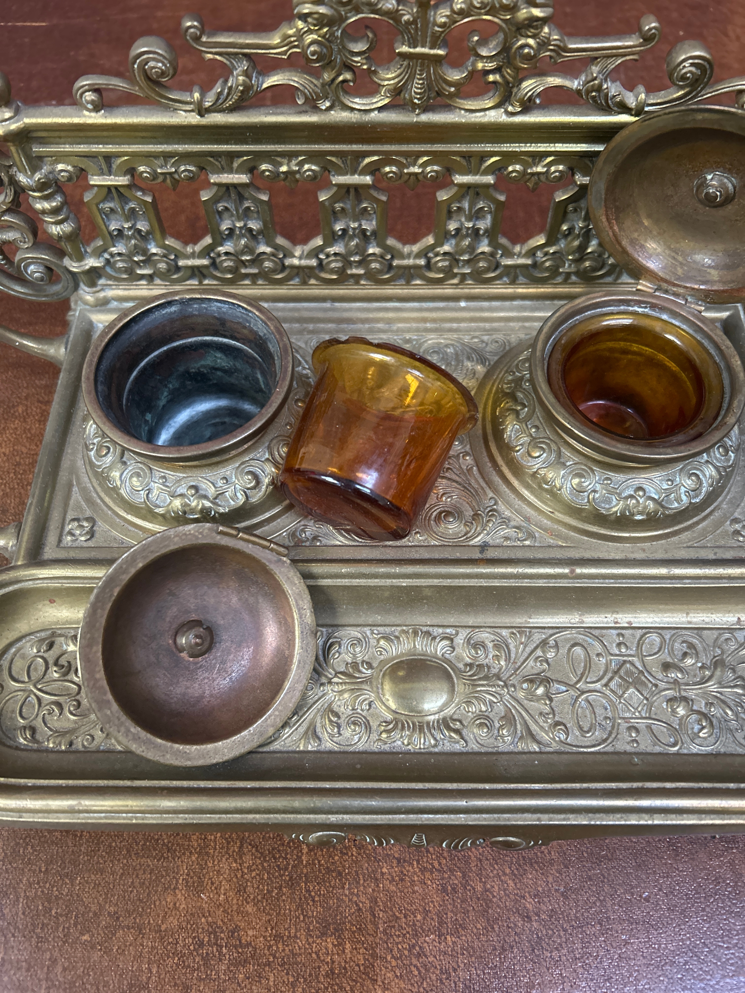 An early 20th Century solid brass desk stand, with raised gallery back. The inkwells with amber glass linings. Hinge needs repair on one inkwell