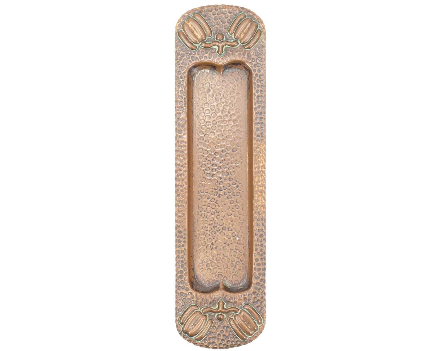 A J& F Pool of Hayle copper pen tray of rounded rectangular form. Circa 1900. Hammered, with repousse decoration to both ends. Stamped 'HAND MADE' to verso. 22cm x 5.75cm.