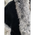 A black evening shawl / cape with pockets and long black and white fur trim to edges