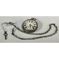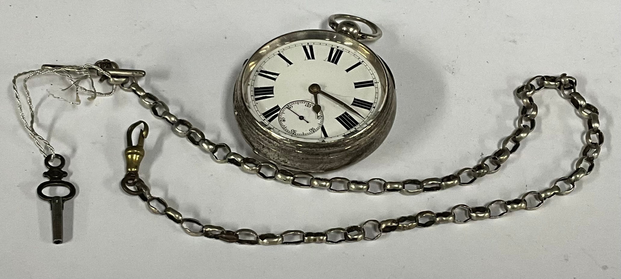 A Victorian silver openface pocket watch, white enamel dial, bold Roman numerals, subsidiary seconds, key wind movement, with silver coloured metal chain, 160g gross