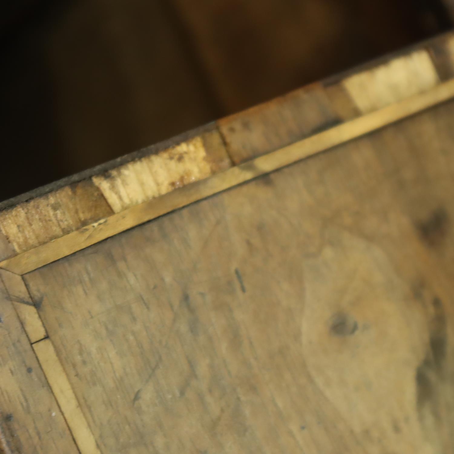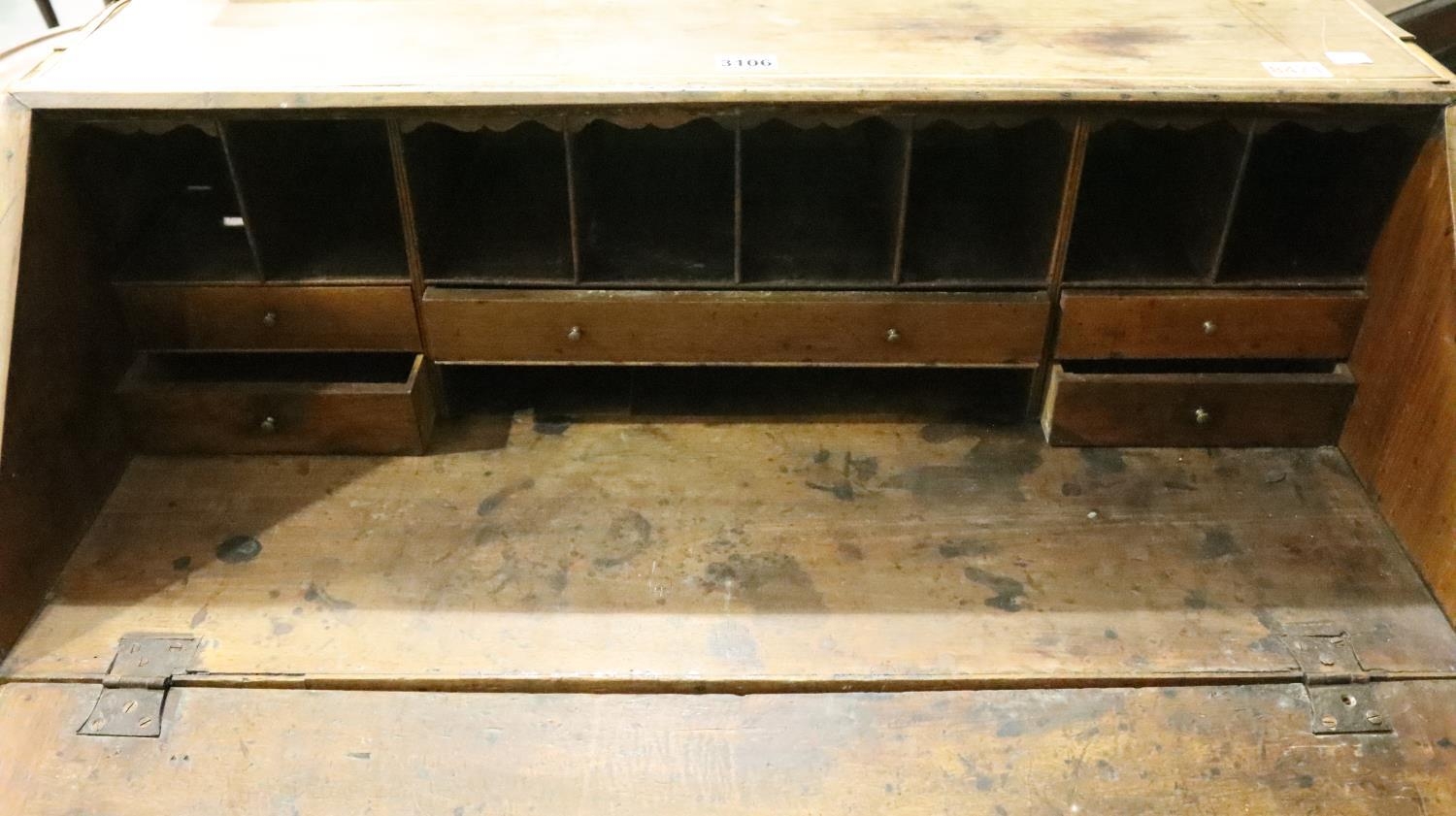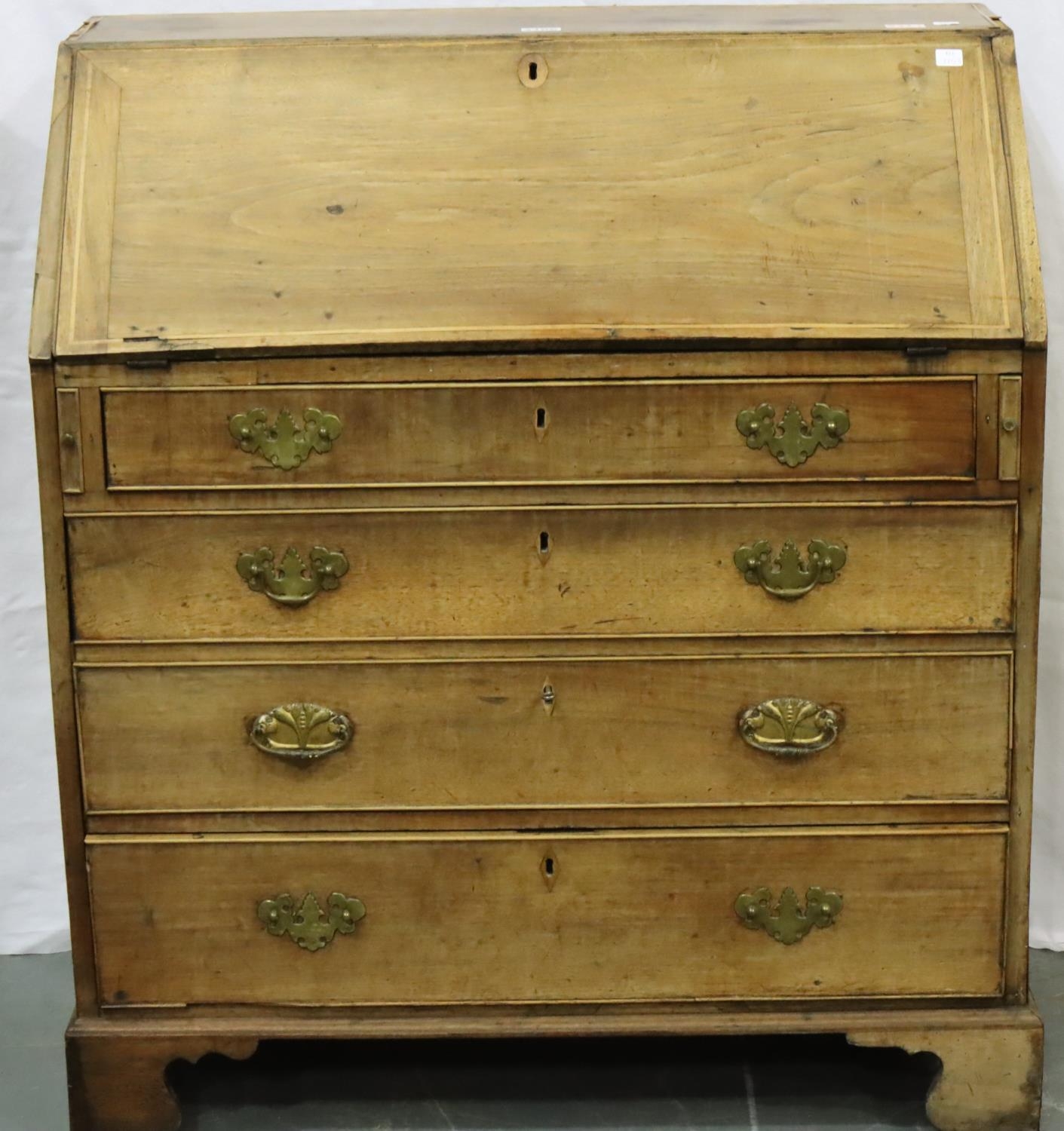George III inlaid mahogany bureau, for restoration, 95 x 92 x 50 cm H. Not available for in-house P&P, contact Paul O'Hea at Mailboxes on 01925 659133
