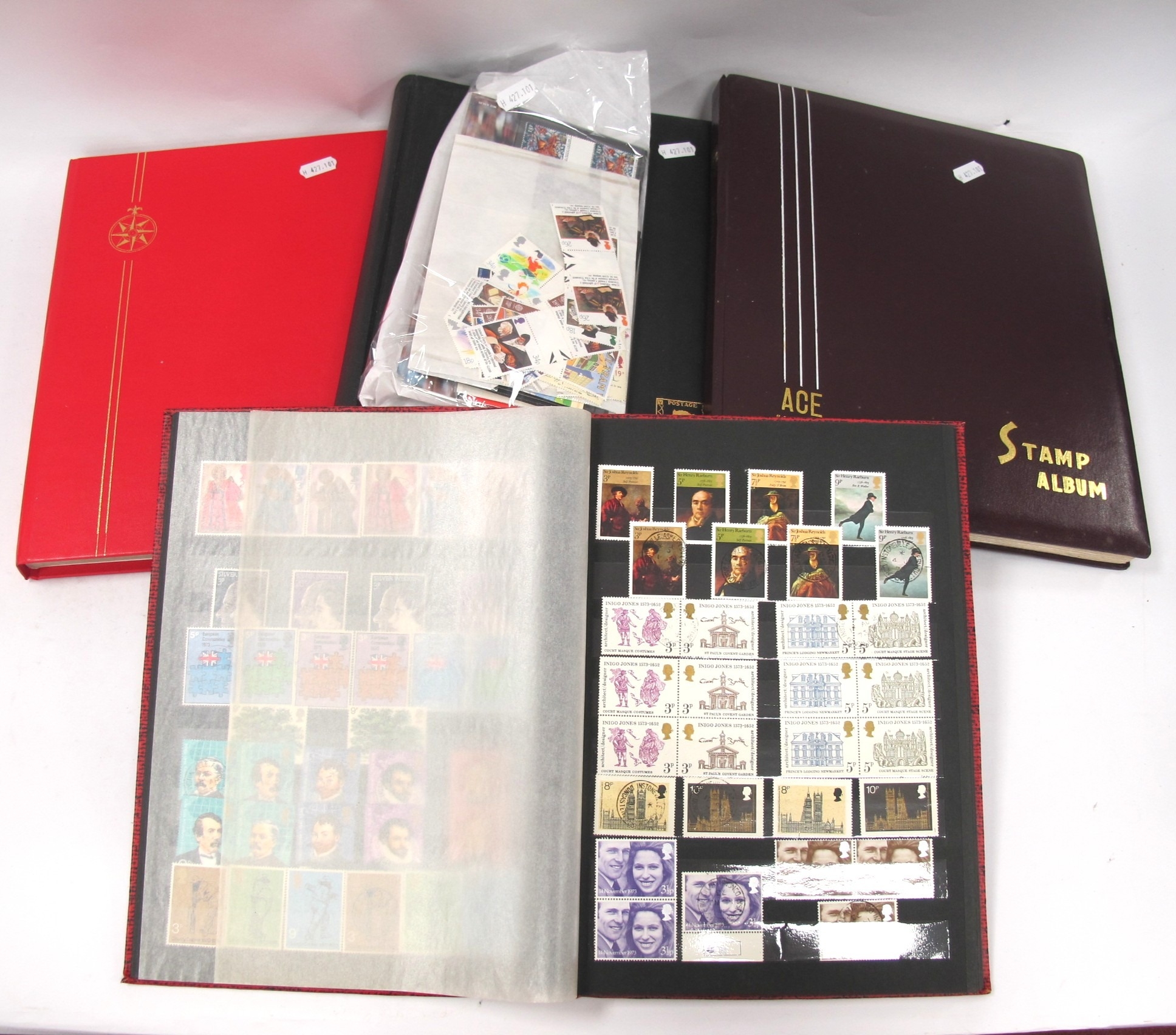 Stamps; A Collection of mainly mint GB stamps, housed in four stockbooks, plus a few loose items. The collection contains over £225 in mint commemorative stamps, many gutter pairs included.