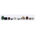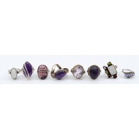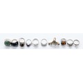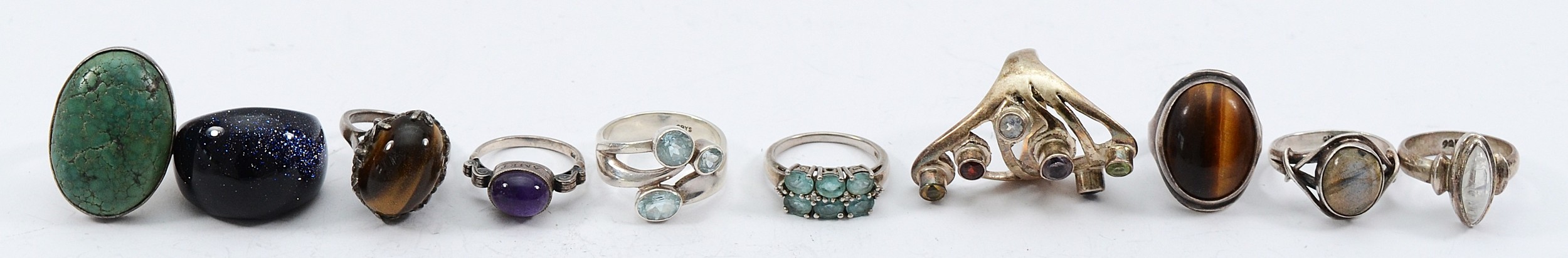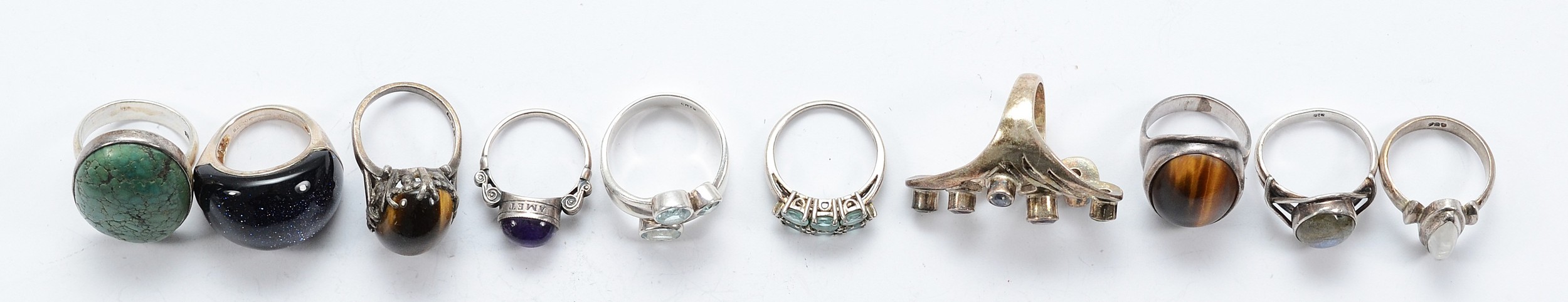 Nine 925 silver gemset rings, with an unmarked silver gemset ring, K-T, 76g
