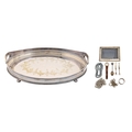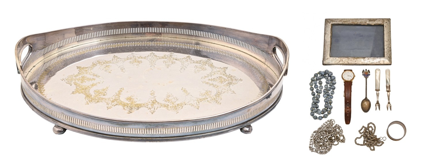 An EPNS oval galleried tray, on bun feet, 61cm w, a silver photograph frame, Birmingham 1912, a silver napkin ring, Walker & Hall, Sheffield 1938, miscellaneous costume jewellery, gent's wristwatch, etc