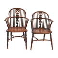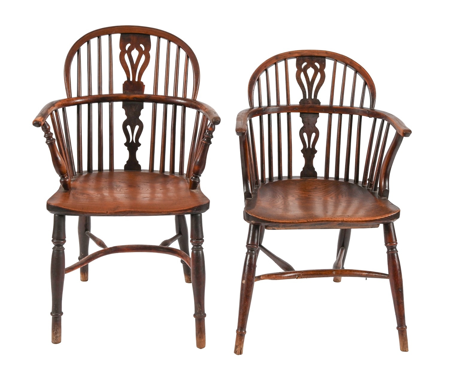 A Victorian yew wood Windsor chair, with elm seat, pierced splat and crinoline stretcher, seat height 43cm and another similar contemporary example