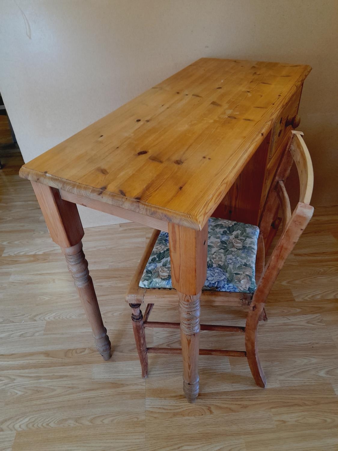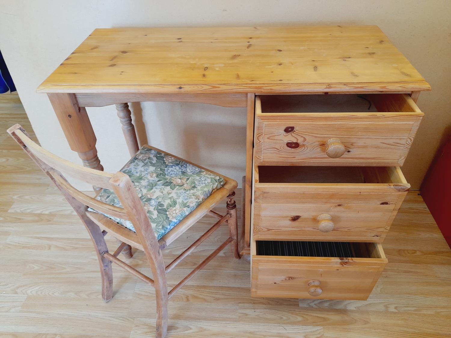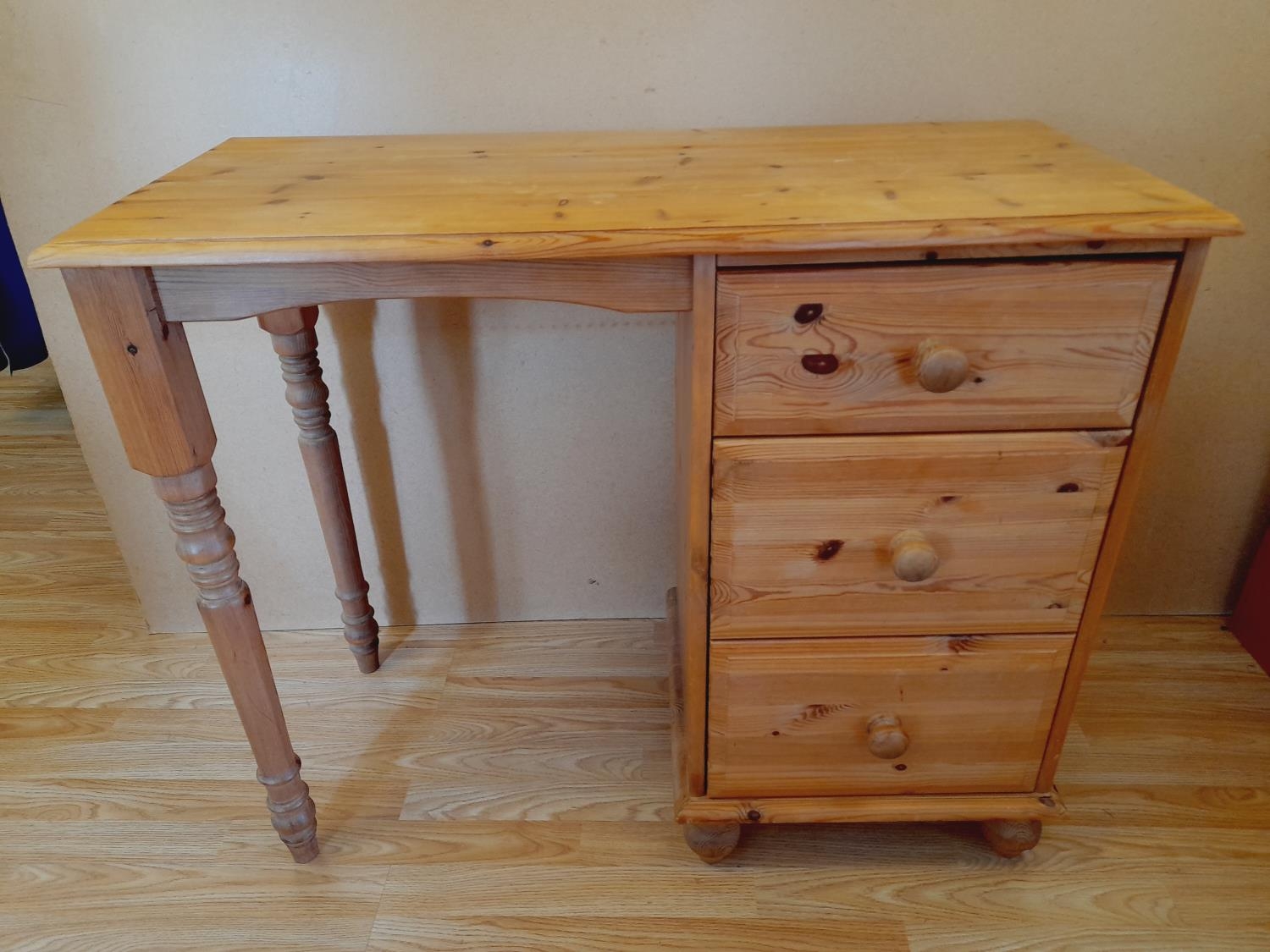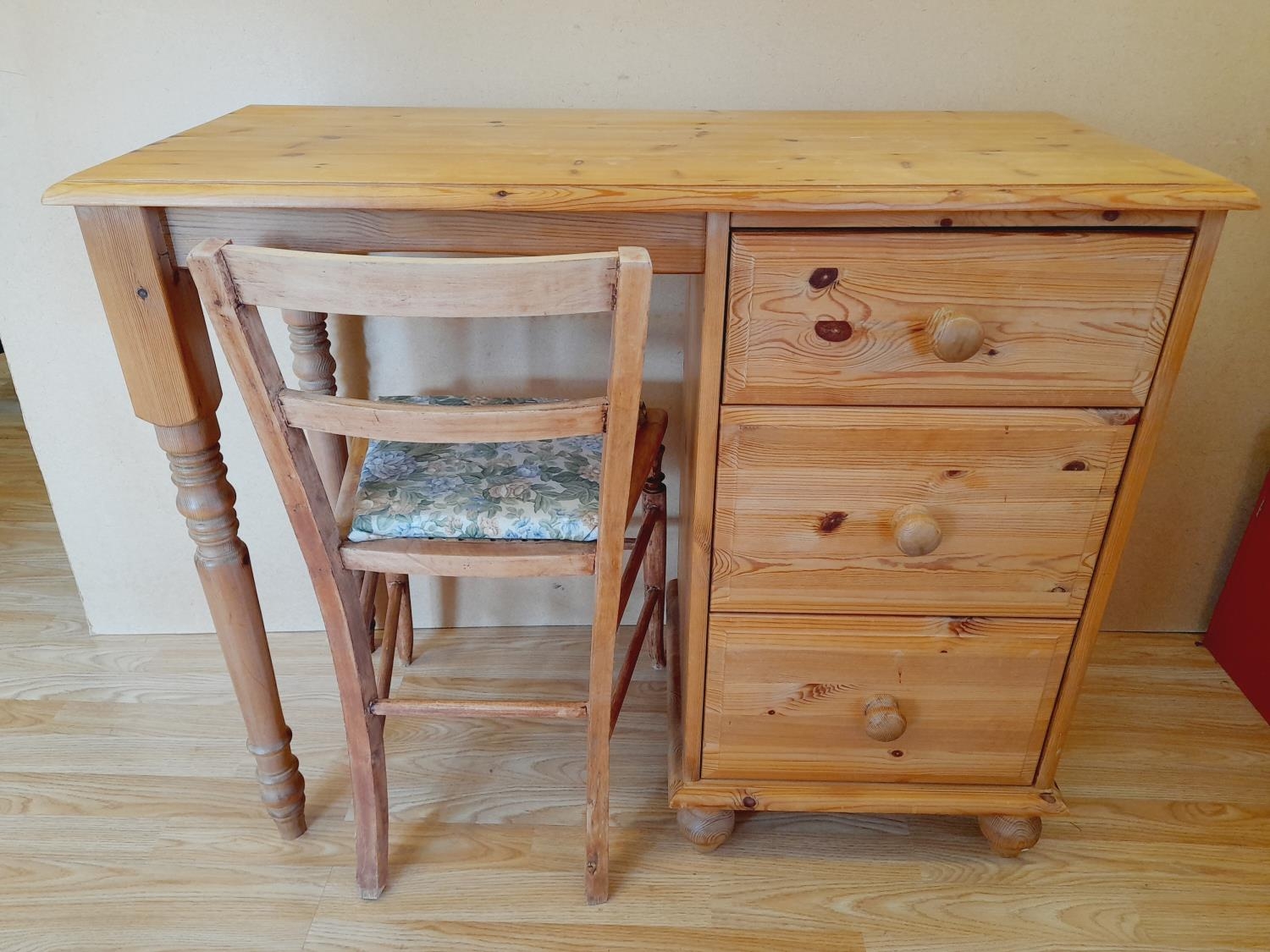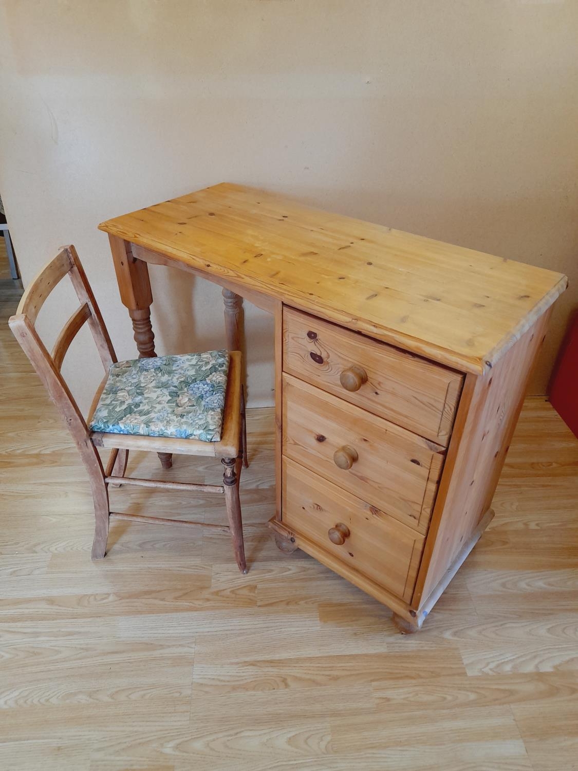 Pine 3 Drawer Dressing Table/Desk plus Vintage Chair (Part Restored). 77cm High, 94cm x 43cm. Collection Only.