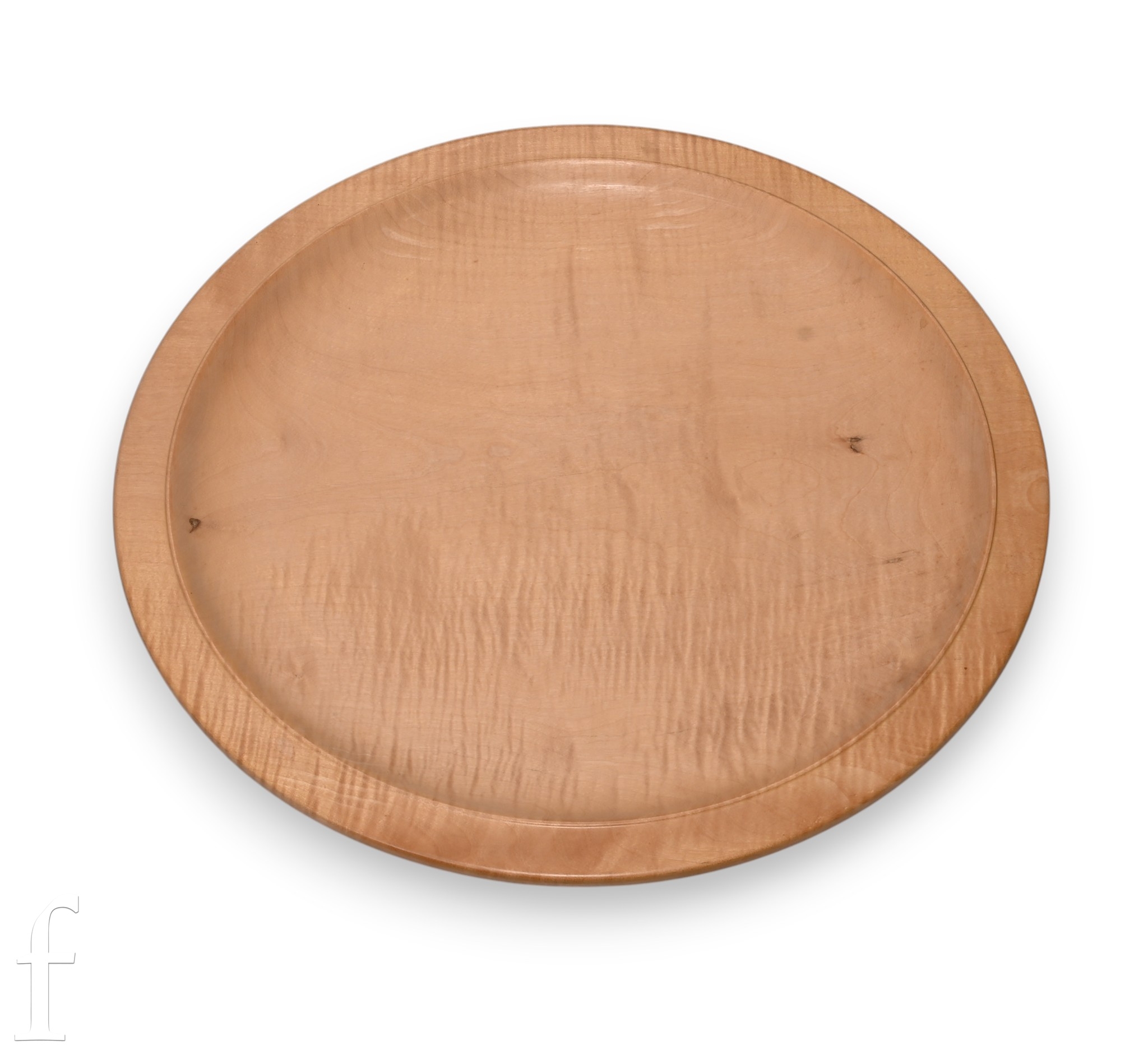 A late 20th Century fiddleback sycamore circular platter of plain form, initialled to the reverse JSW 1991, diameter 48cm.