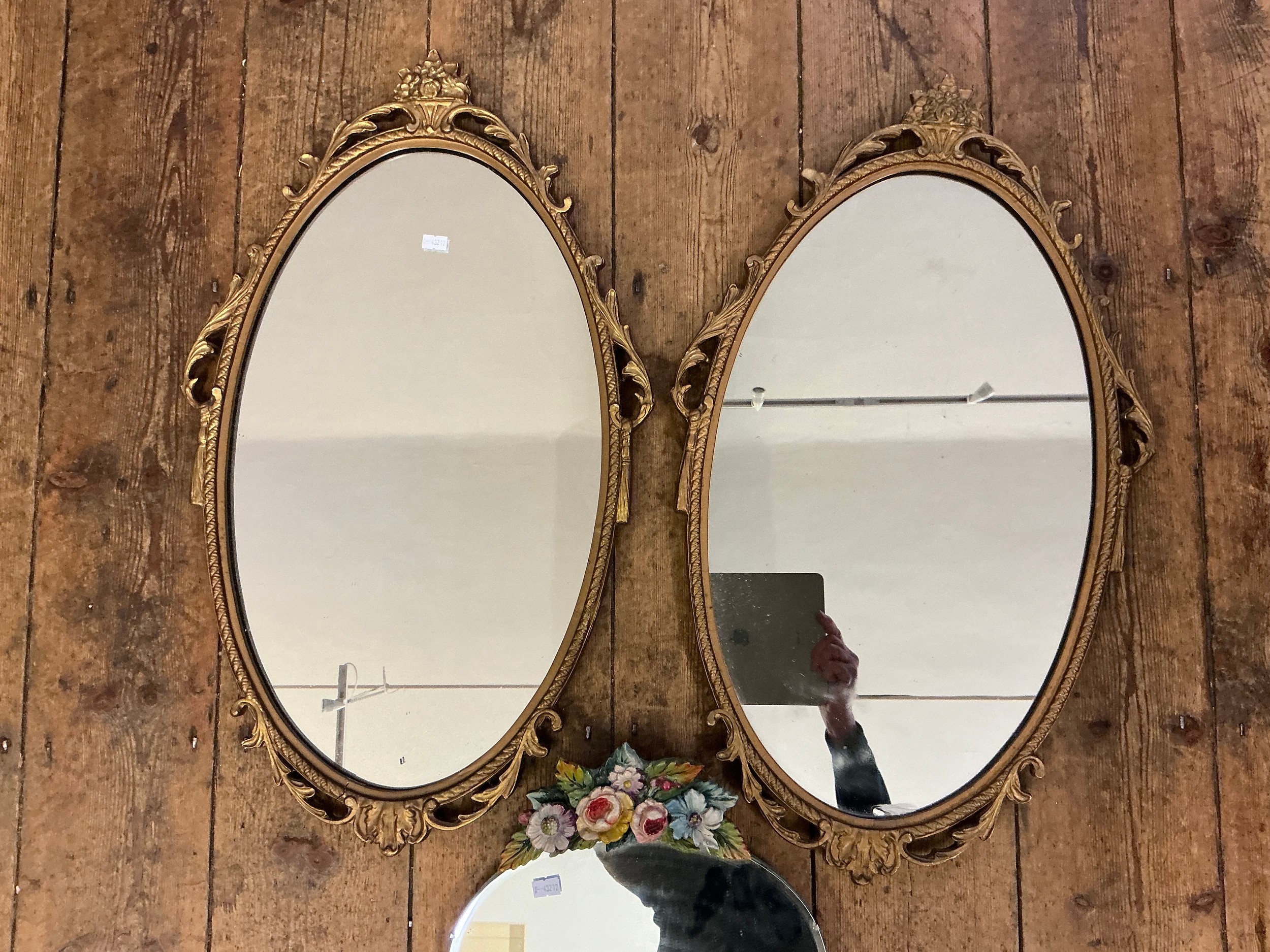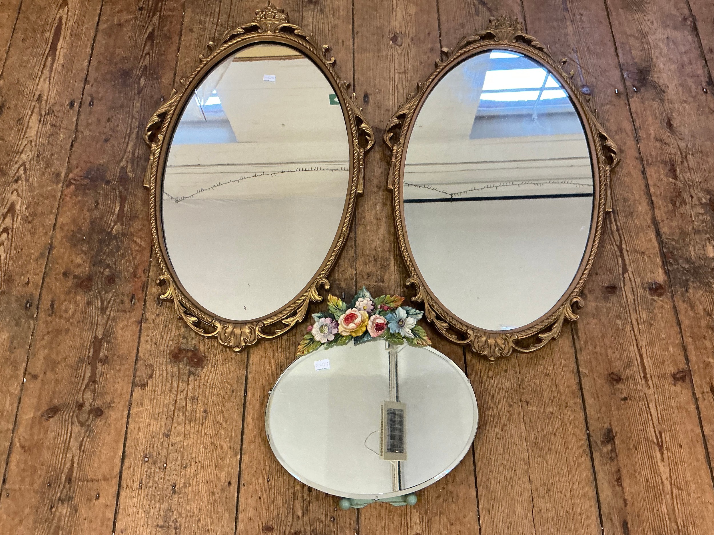 A Pair of Gilt Framed Wall Mirrors along with a Dressing Table Mirror. Measuring: 67cms x 38cms (Oval Mirrors).