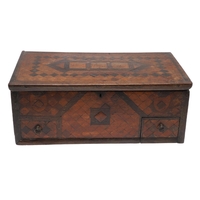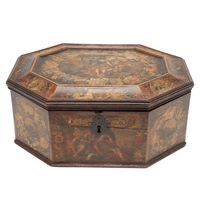 Loss to one foot, loss to veneer on one compartment lid, 'blemish' to veneer on back, minor loss to underside.