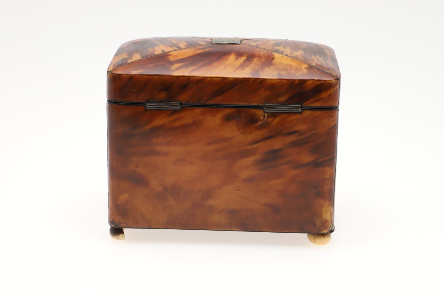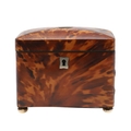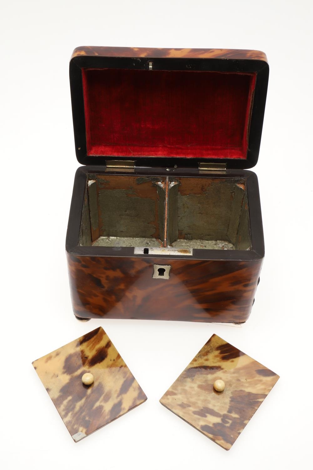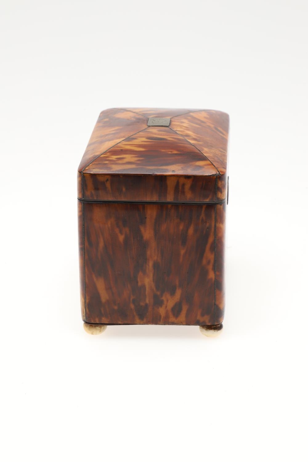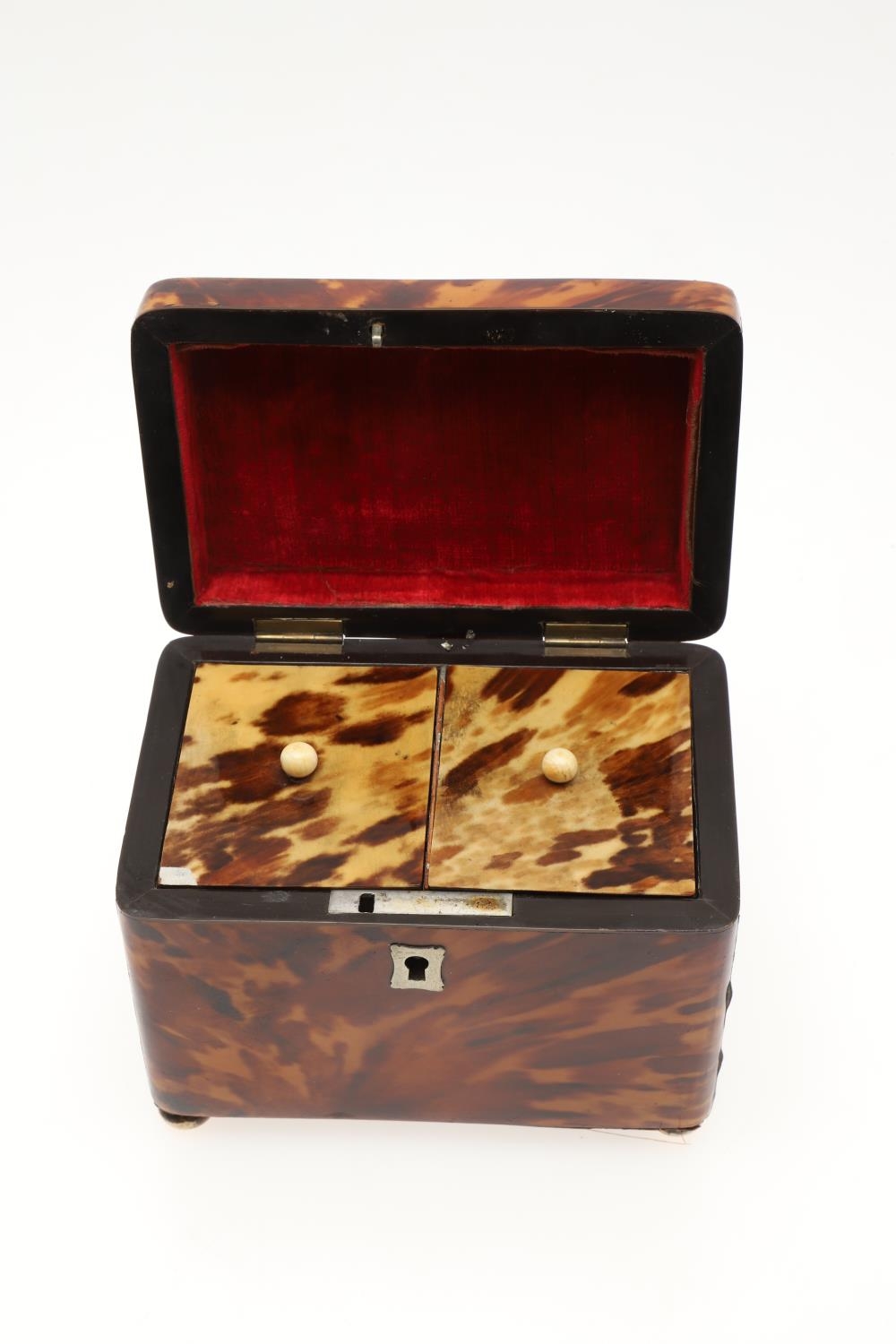 A GEORGE III TORTOISESHELL TEA CADDY. the red velvet lined lid with white metal initialled plaque and escutcheon, enclosing two lidded compartments with turned ivory handles, upon turned ivory feet, height 11cm, width 13cm, depth 8.5cm