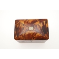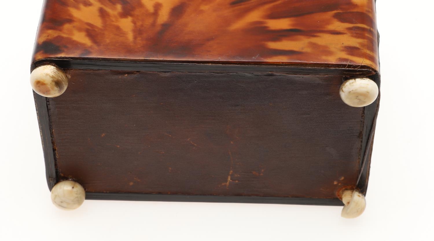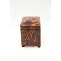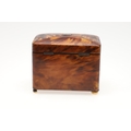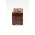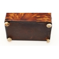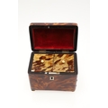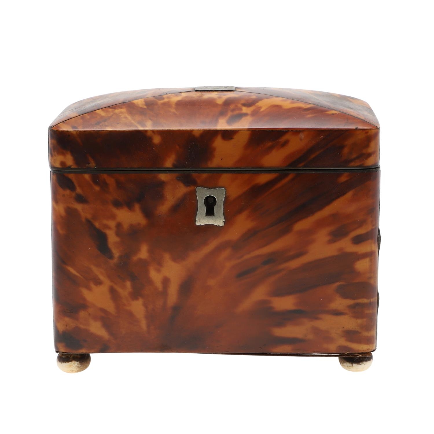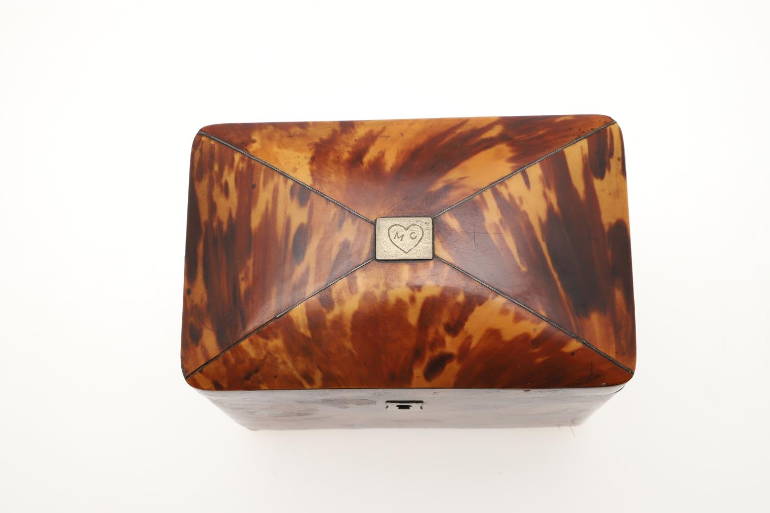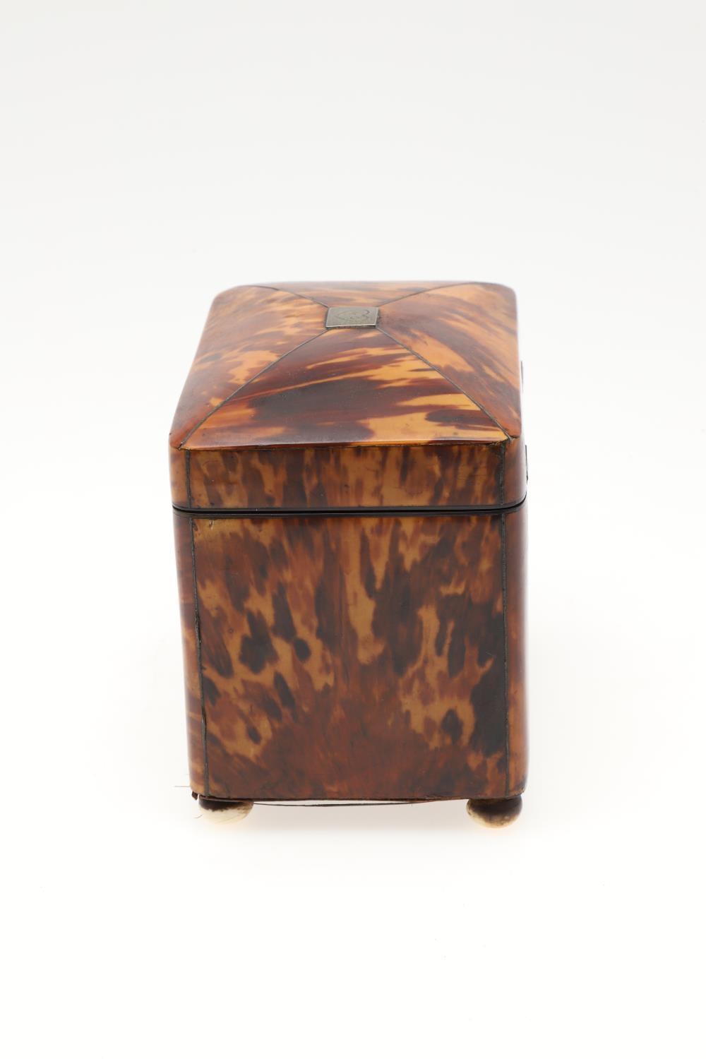 A GEORGE III TORTOISESHELL TEA CADDY. the red velvet lined lid with white metal initialled plaque and escutcheon, enclosing two lidded compartments with turned ivory handles, upon turned ivory feet, height 11cm, width 13cm, depth 8.5cm